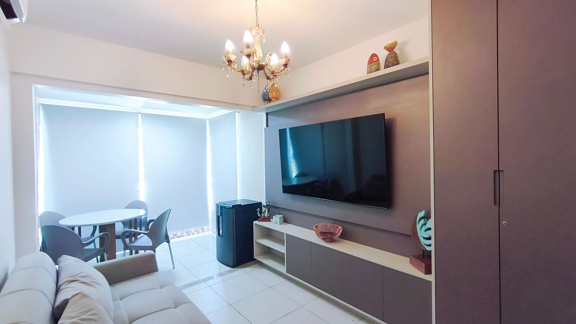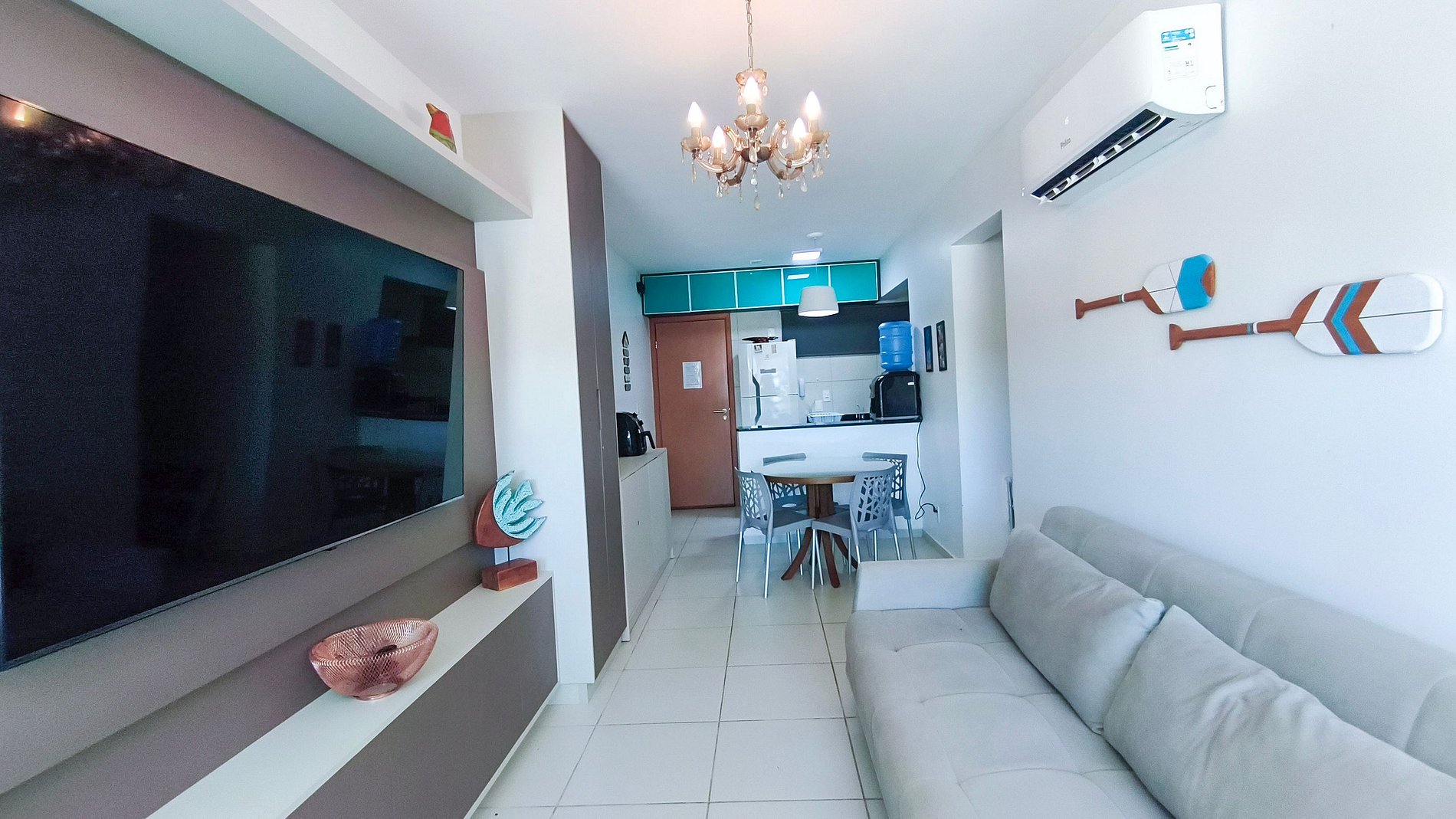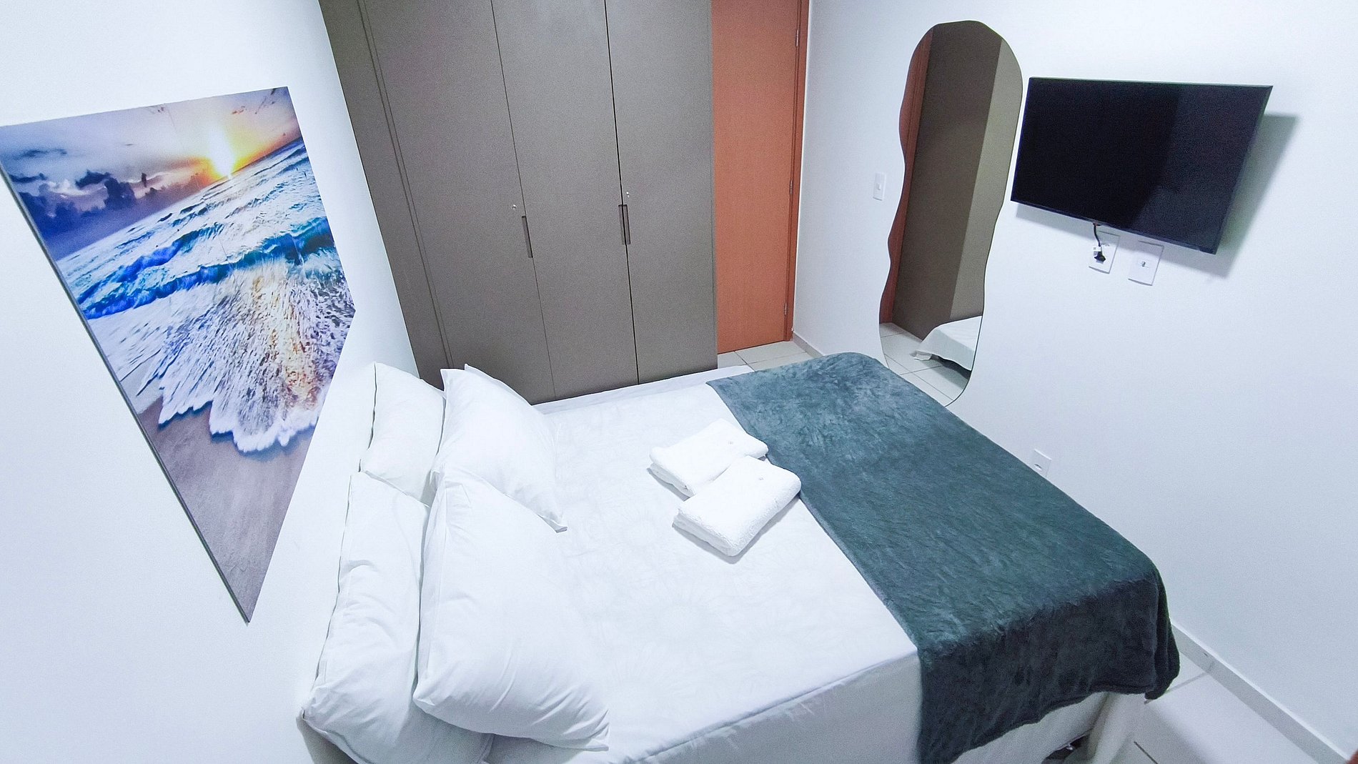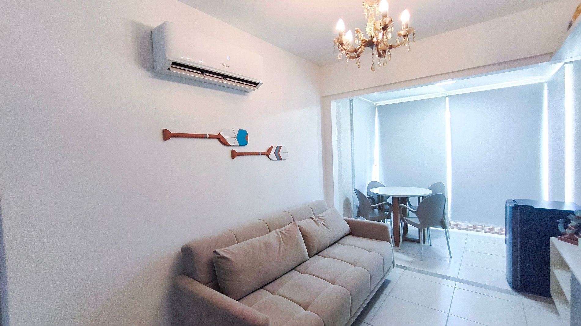 A sala de estar apresenta uma decoração acolhedora e minimalista, com sofá-cama, TV, cervejeira e ar-condicionado. A cozinha é totalmente equipada com os principais utensílios, panelas, fogão, forno, geladeira, cafeteira, sanduicheira, torradeira, micro-ondas, bebedouro elétrico e outros.