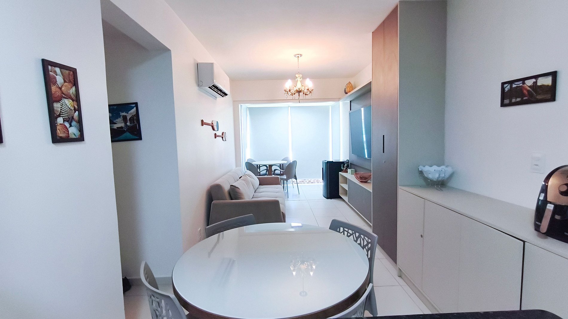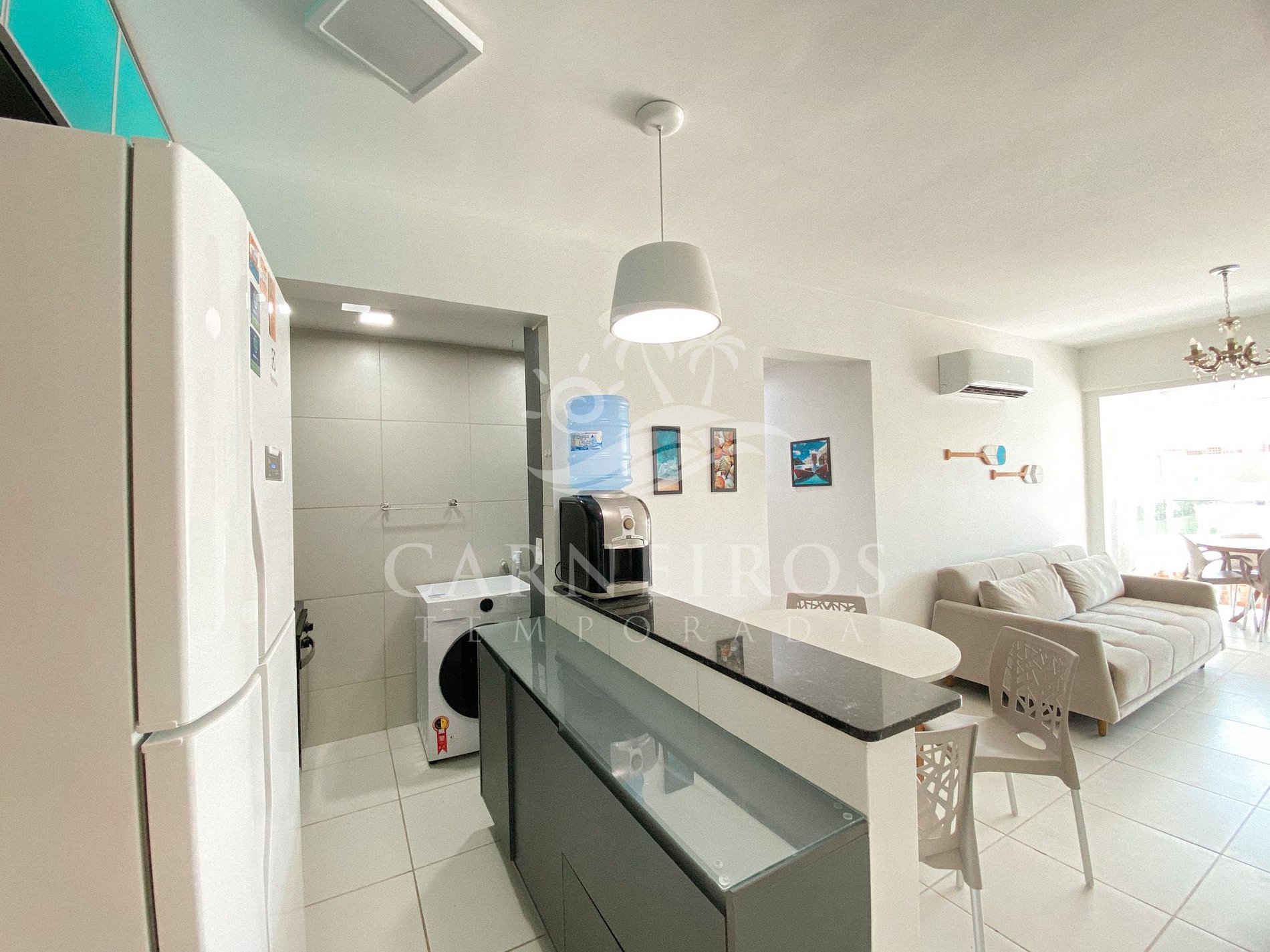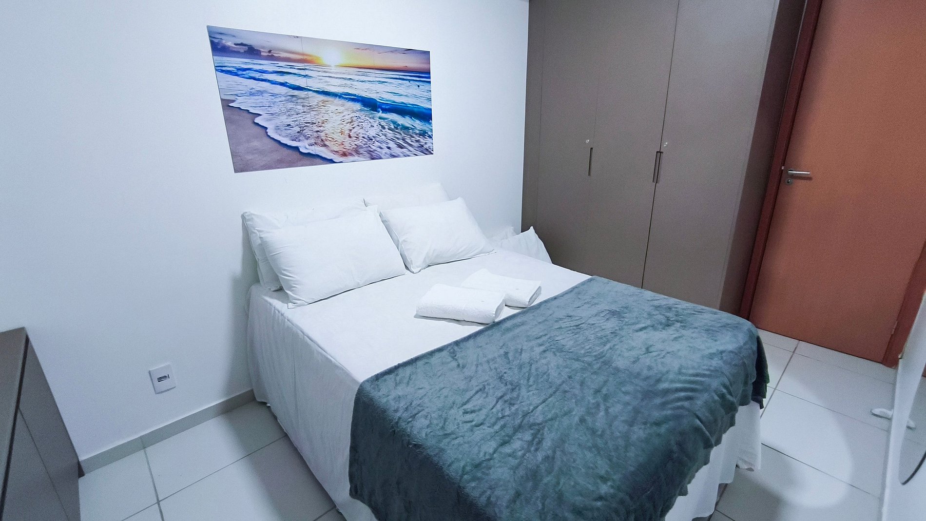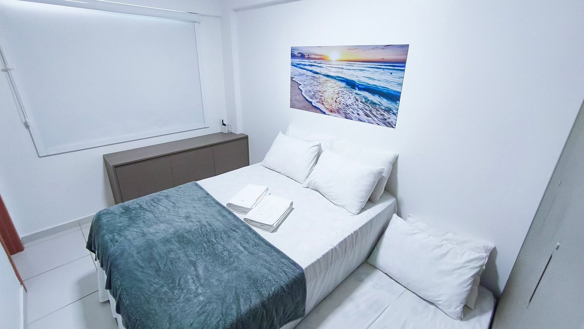A sala de estar apresenta uma decoração acolhedora e minimalista, com sofá-cama, TV, cervejeira e ar-condicionado. A cozinha é totalmente equipada com os principais utensílios, panelas, fogão, forno, geladeira, cafeteira, sanduicheira, torradeira, micro-ondas, bebedouro elétrico e outros.