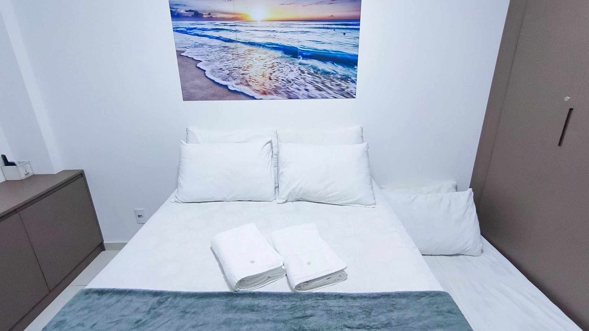- Quarto 01 (suíte): 1 cama de casal + 1 bicama soltiero, ar-condicionado, armário e banheiro;