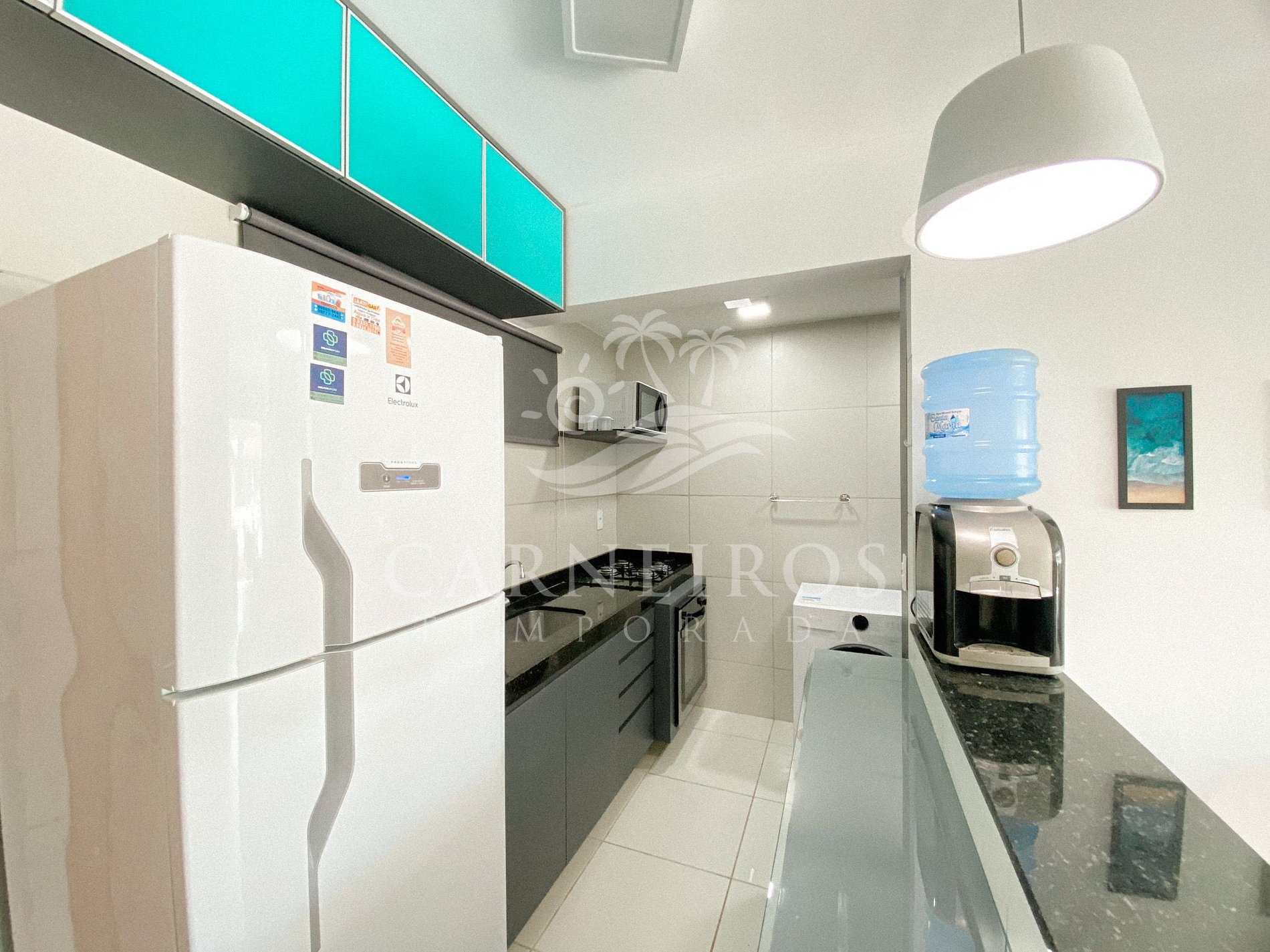 A sala de estar apresenta uma decoração acolhedora e minimalista, com sofá-cama, TV, cervejeira e ar-condicionado. A cozinha é totalmente equipada com os principais utensílios, panelas, fogão, forno, geladeira, cafeteira, sanduicheira, torradeira, micro-ondas, bebedouro elétrico e outros.