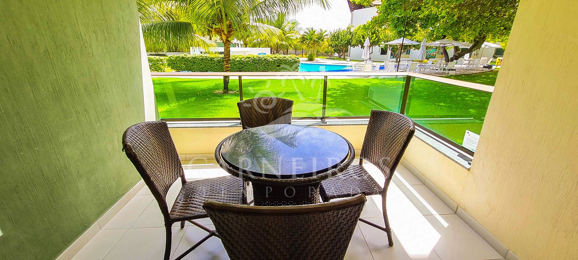 ✹ O flat se encontra no térreo do prédio com vista para o condomínio e piscina. Possui também uma linda varanda com quatro cadeiras e mesa. ✹