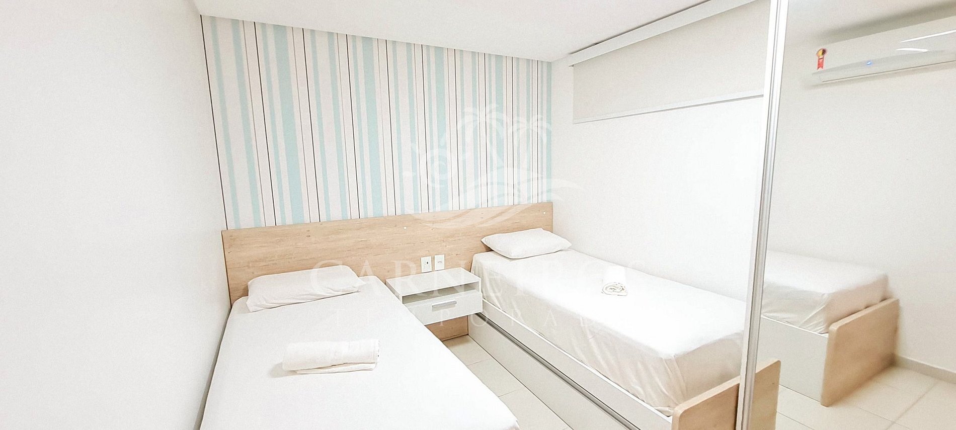 - Quarto 01: 2 camas de solteiro + 01 bicama (acomoda até 03 pessoas), armários e ar-condicionado;