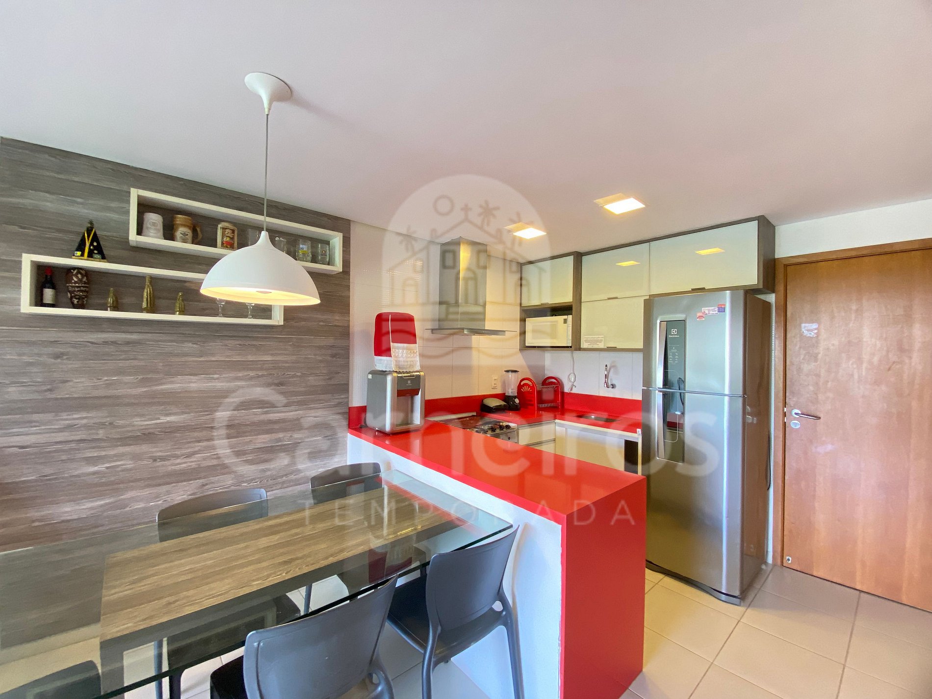 A sala de estar com decoração aconchegante conta com um sofá, TV e ar-condicionado. A cozinha é completa e possui itens como louça, copos, panelas, talheres, micro-ondas, fogão, gelágua, geladeira, liquidificador e diversos utensílios. Além disso, contém área para refeições com mesa de vidro e 04 cadeiras. O flat possui 02 banheiros completos.