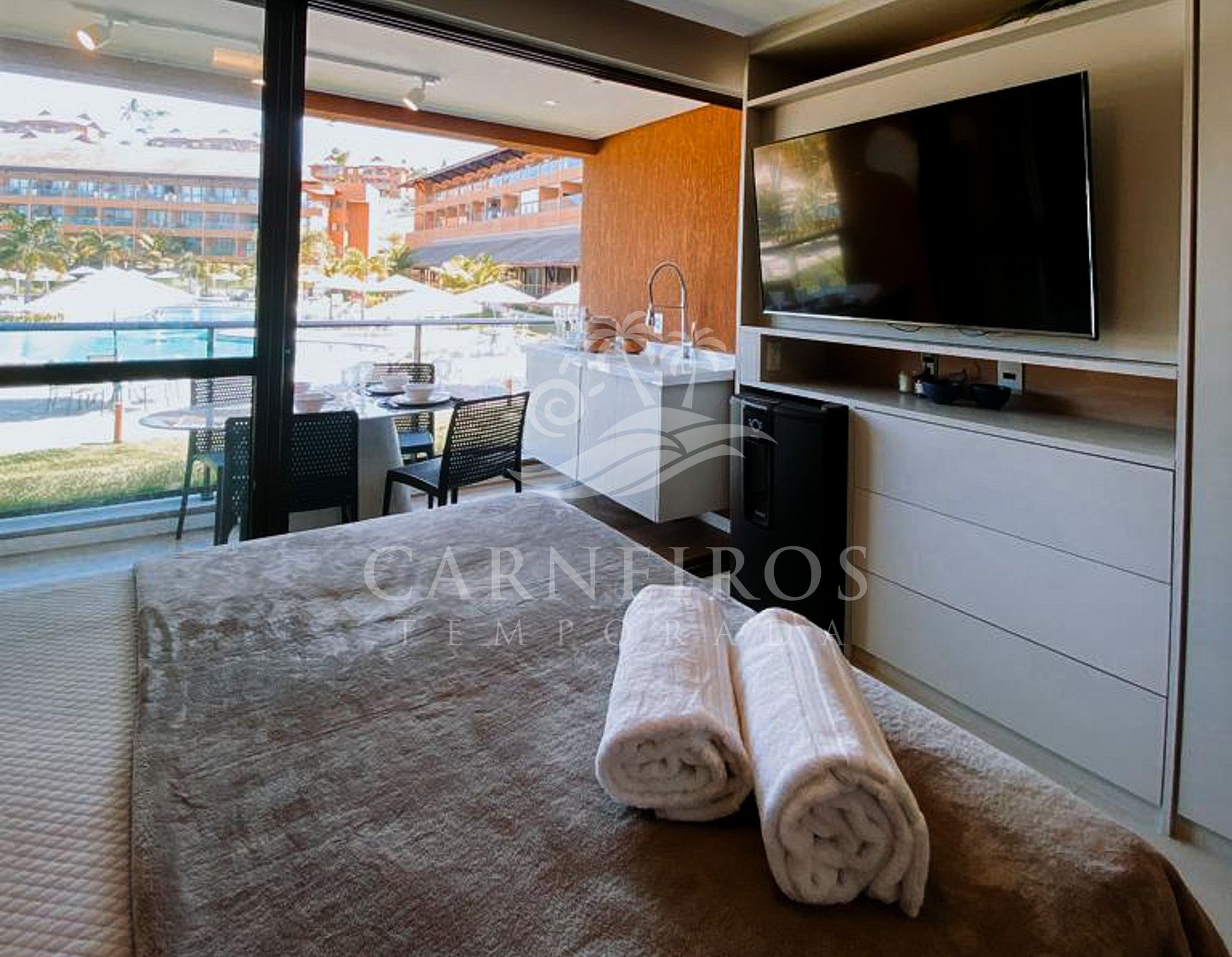 No flat, além da decoração aconchegante, você encontrará varanda completa com mesa, cadeiras, bancada com pia e armários. Além do ambiente com TV, ar-condicionado e cervejeira. O espaço conta com uma divisória móvel projetada para oferecer flexibilidade na divisão e utilização do ambiente, permitindo que um único ambiente se divida em dois, oferecendo privacidade e conforto. A cozinha é completa e possui diversos itens como micro-ondas, fogão e forno, geladeira, cafeteira, Air Fryer, bebedouro elétrico e diversos utensílios. Há também uma área para refeições com bancada e duas cadeiras. O flat possui 1 banheiro completo.