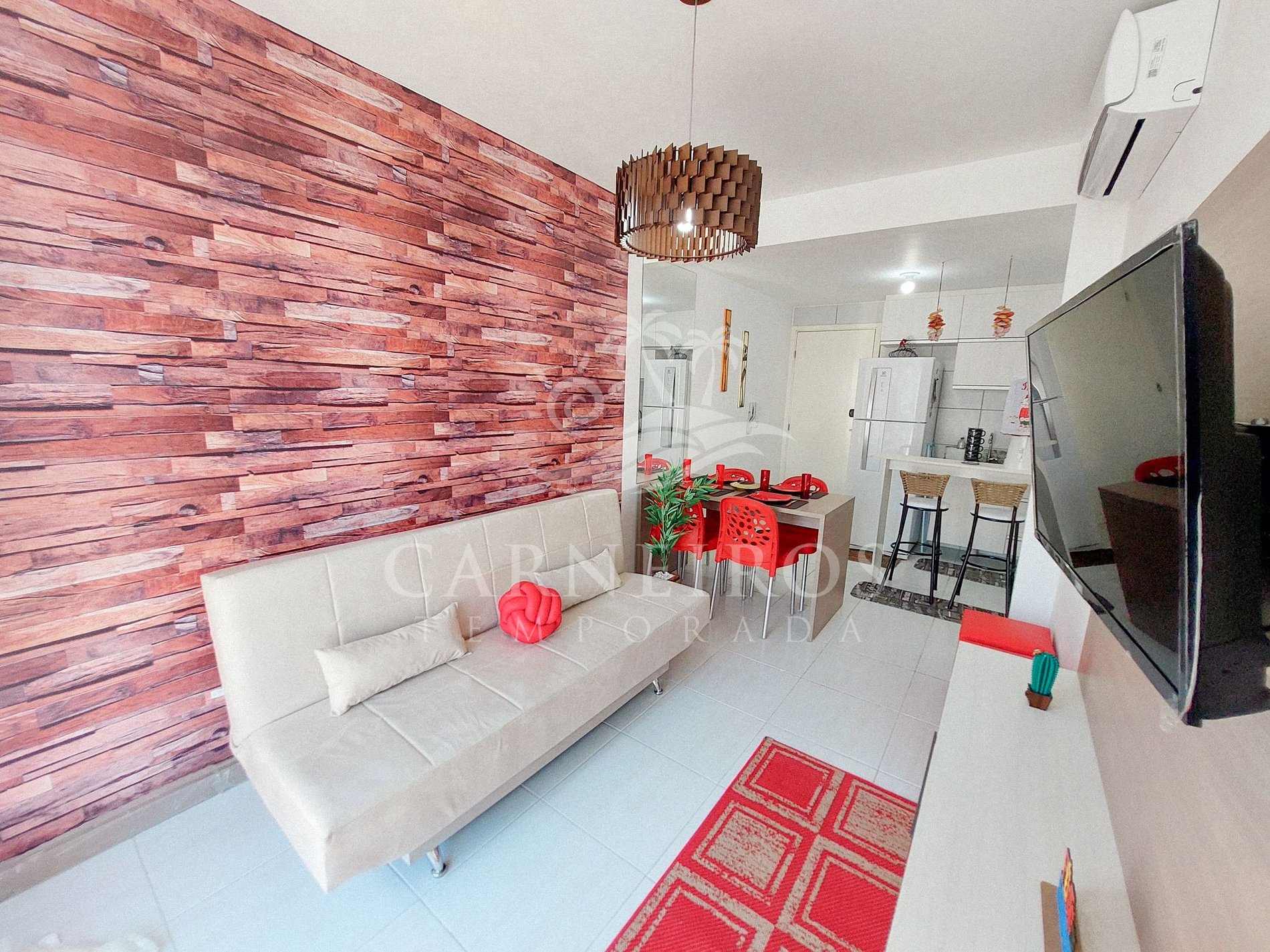 A sala de estar com uma decoração minimalista e agradável conta com uma TV, sofá-cama de casal, ar-condicionado e mesa de jantar com 04 cadeiras. A cozinha é completa e equipada com os principais utensílios como louça, copos, panelas, talheres, liquidificador, micro-ondas, fogão, forno, bebedouro, geladeira, sanduicheira, airfryer, cafeteira e outros. Possui também 1 banheiro completo com ducha quente.