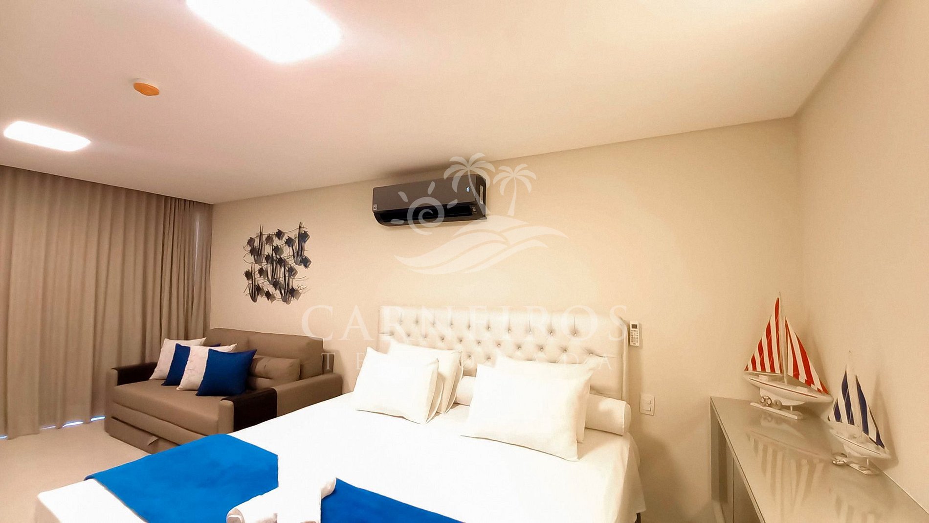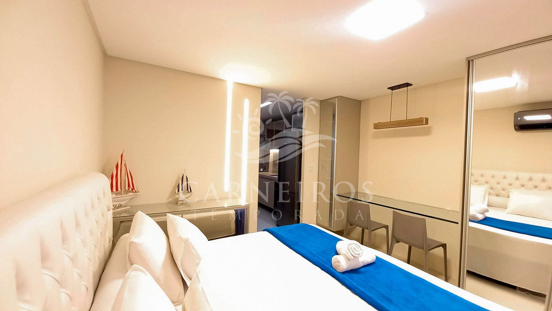 A acomodação é bem equipada (sanduicheira, liquidificador, airfryer, cafeteira, processador, microondas, fogão e forno, ar condicionado, louças, taças, chuveiro excelente, cama king e sofá-cama mt bom, etc). É confortável (apesar de n ter divisão de quarto) e agradável! Vista pra área da piscina e pertinho do mar, q é ótimo pra banho (calmo e transparente na maré alta). O resort é mt completo (quadras, piscinas, sala de jogos, restaurantes, rei das coxinhas, sorvete na chapa, mercadinho, spa, carrinho de golfe pra locomoção dentro de um horário pré-estabelecido, etc) e pertinho da igrejinha de Carneiros! Tem cadeiras e guarda-sol na praia para os hóspedes. A equipe q administra o flat tb foi bastante atenciosa e solícita!