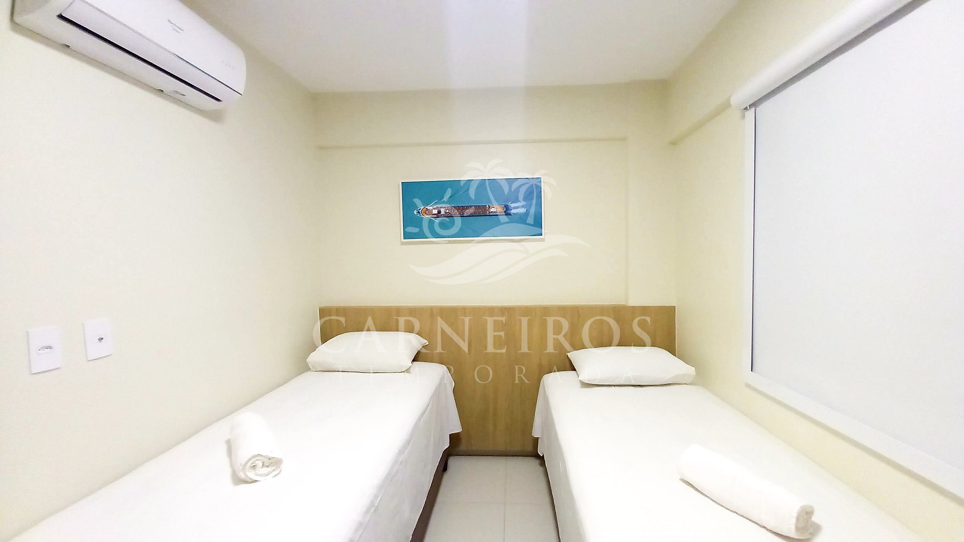 - Quarto 03: 2 camas de solteiro (podendo tornar-se uma cama só de casal) + 1 bicama (acomoda 3 pessoas), ar-condicionado e armário;