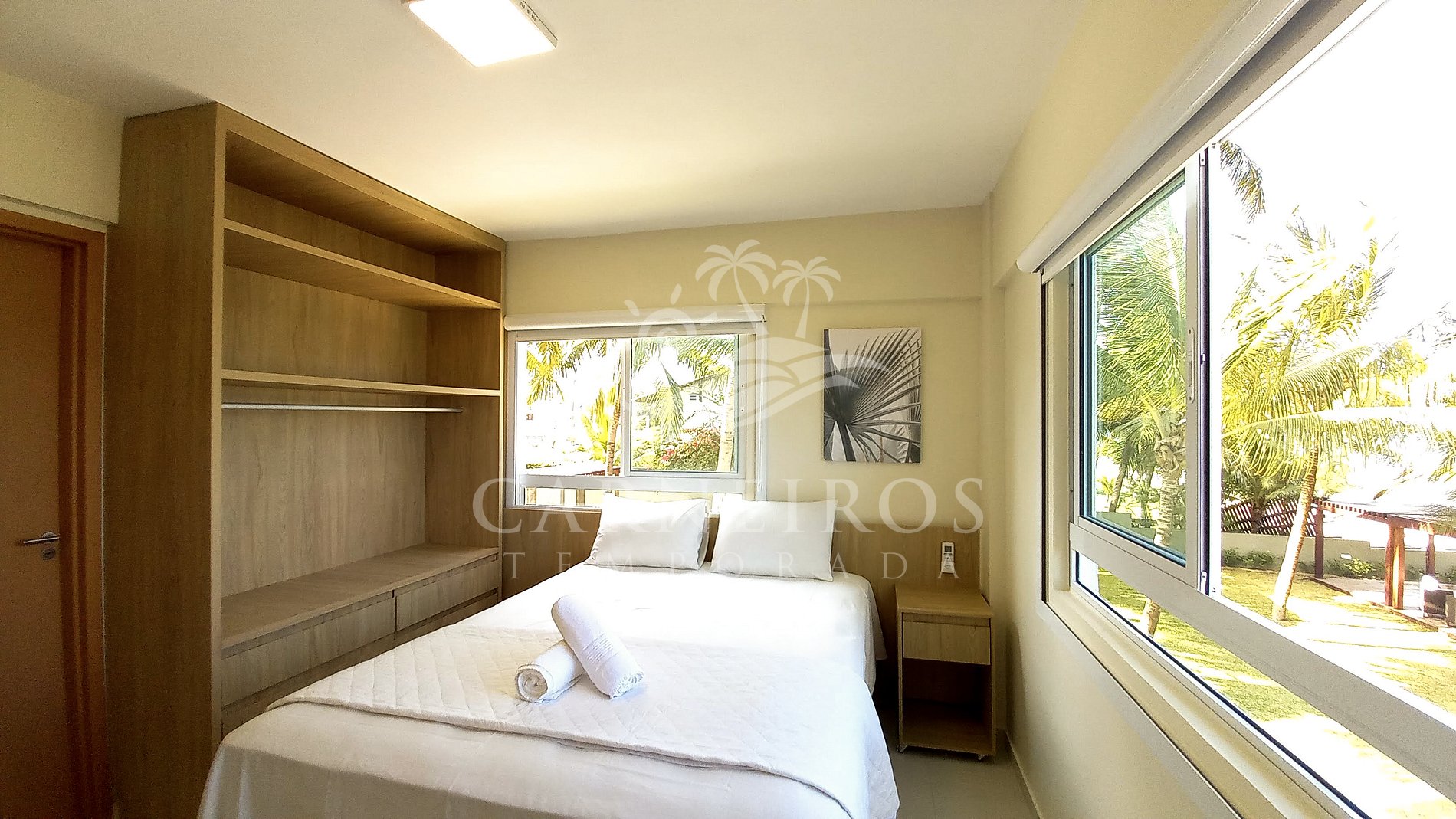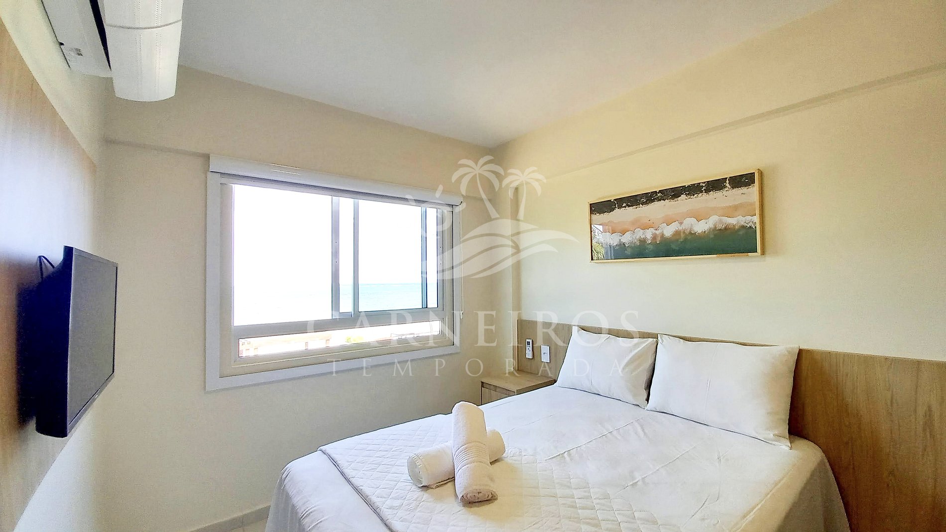 - Quarto 01 (suíte): 1 cama de casal Queen (acomoda 2 pessoas), ar-condicionado e armário;