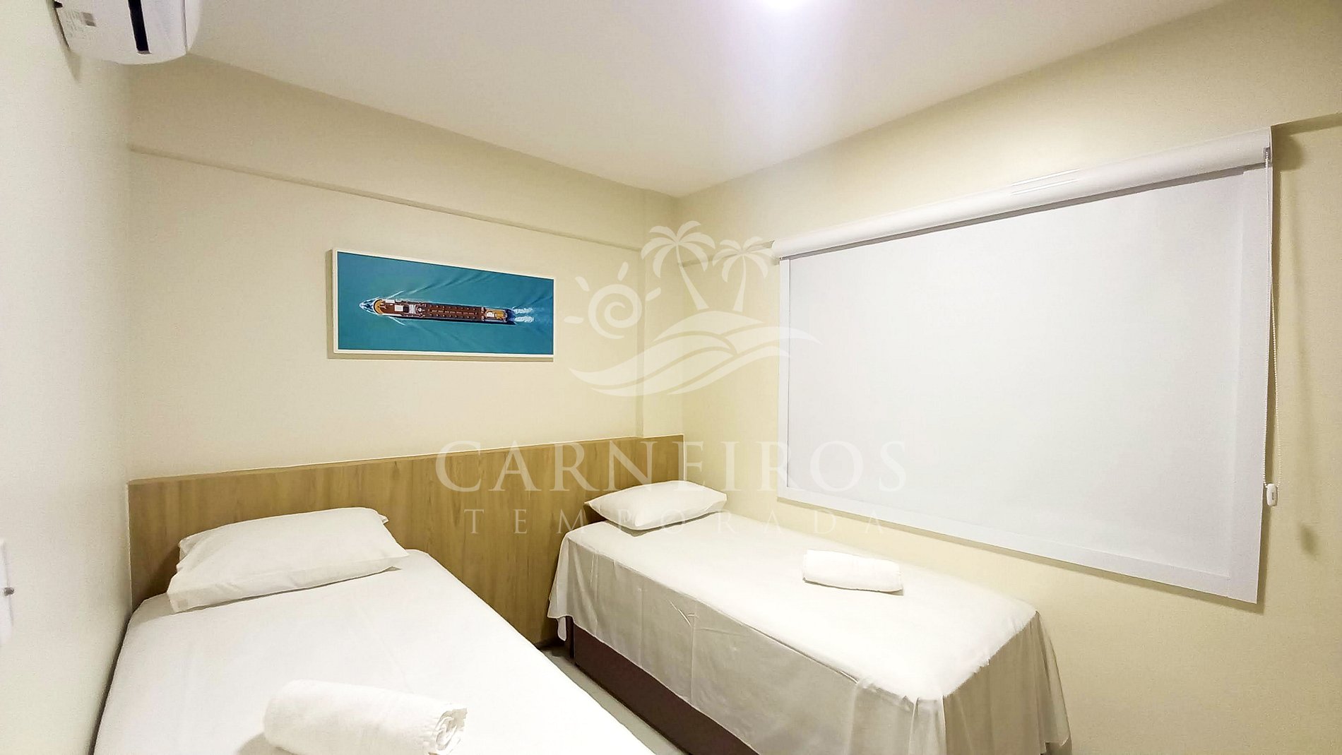 - Quarto 03: 2 camas de solteiro (podendo tornar-se uma cama só de casal) + 1 bicama (acomoda 3 pessoas), ar-condicionado e armário;