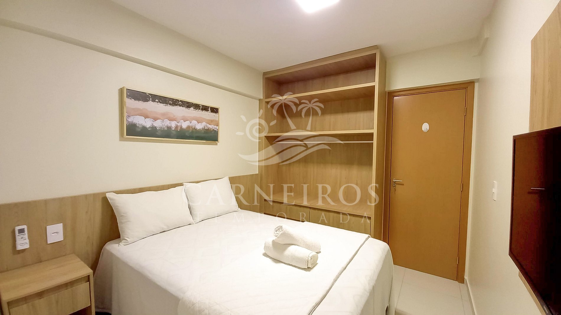 - Quarto 01 (suíte): 1 cama de casal Queen (acomoda 2 pessoas), ar-condicionado e armário;