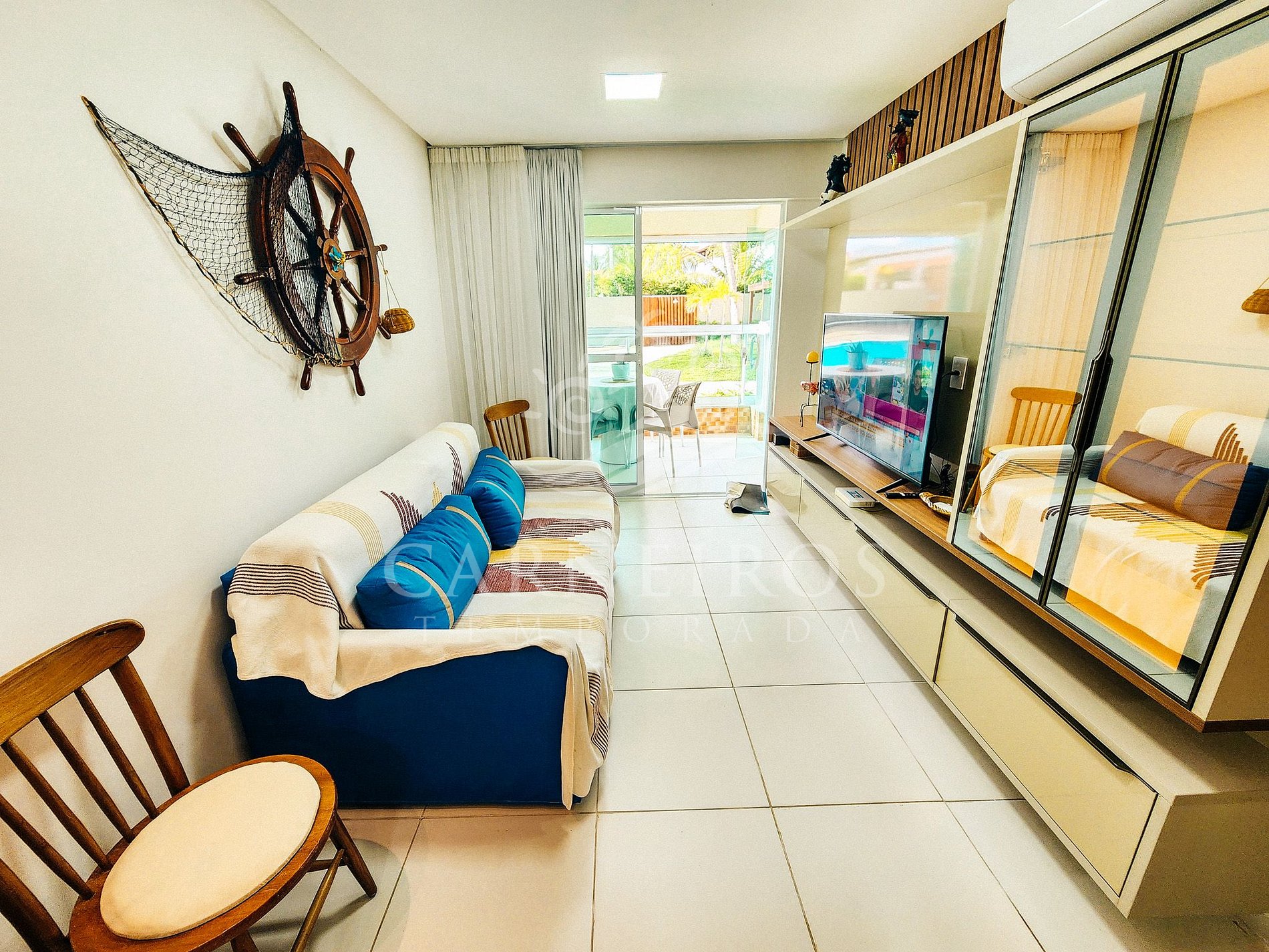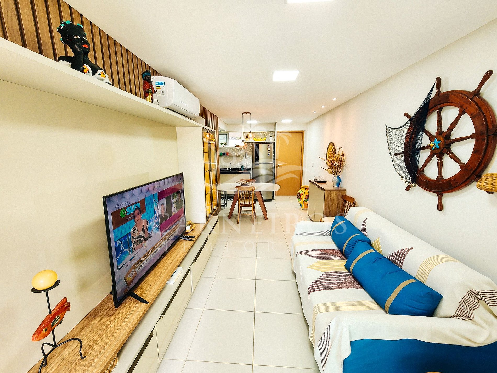A sala de estar conta com uma decoração aconchegante, sofá, TV e ar-condicionado. A cozinha é completa e equipada com os principais utensílios como talheres, copos, panelas, geladeira, fogão com forno, liquidificador, sanduicheira e outros. Possui também 2 banheiros completos e armário nos 2 quartos.