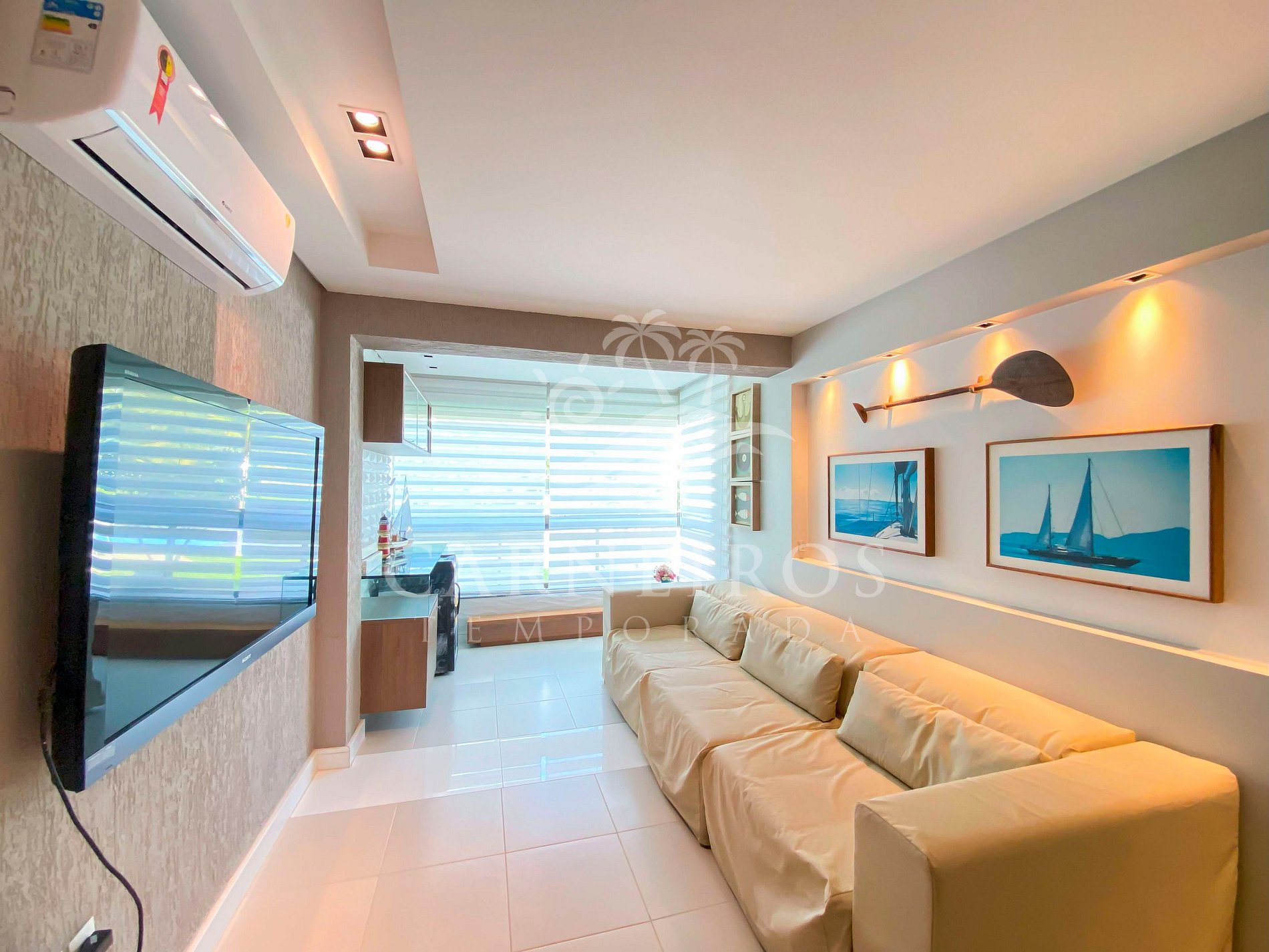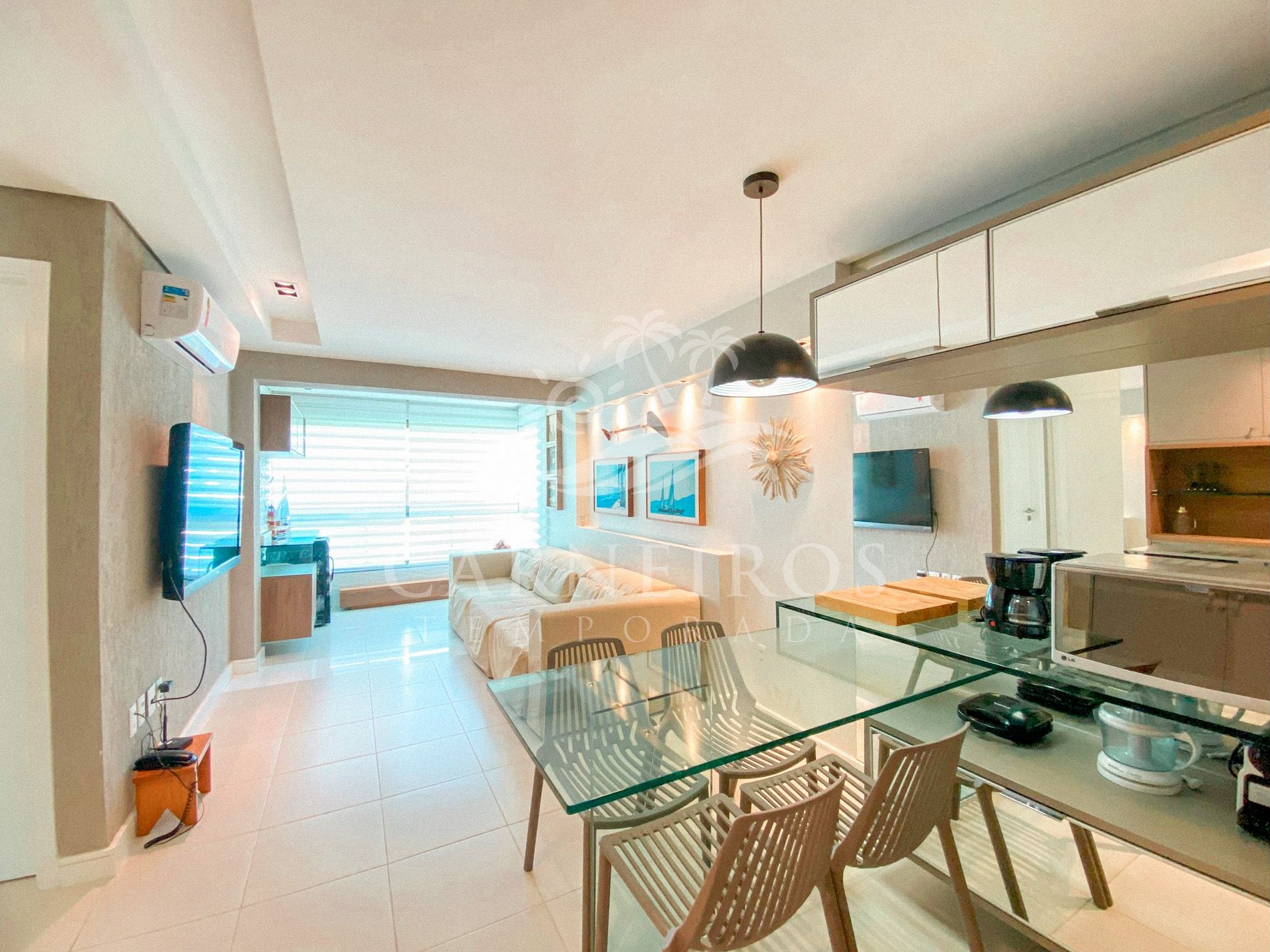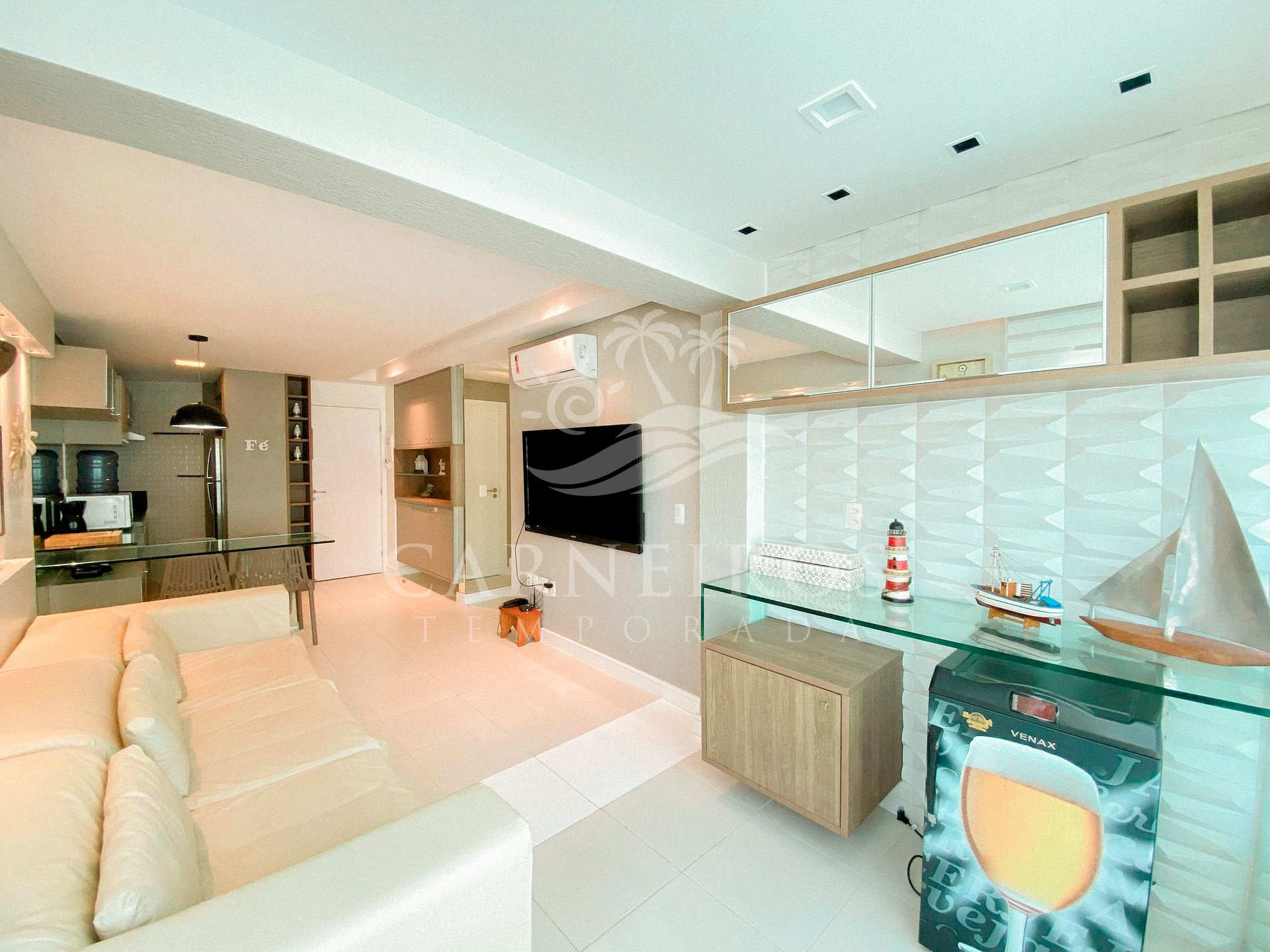A sala de estar com decoração aconchegante conta com uma TV, ar condicionado e sofá cama de casal. A cozinha é completa e possui ítens como louça, copos, panelas, talheres, sanduicheira, micro-ondas, fogão cooktop 04 bocas, geladeira e diversos utensílios. Além disso, contém área para refeições com mesa de vidro e 04 cadeiras. O flat possui 01 banheiro completo.