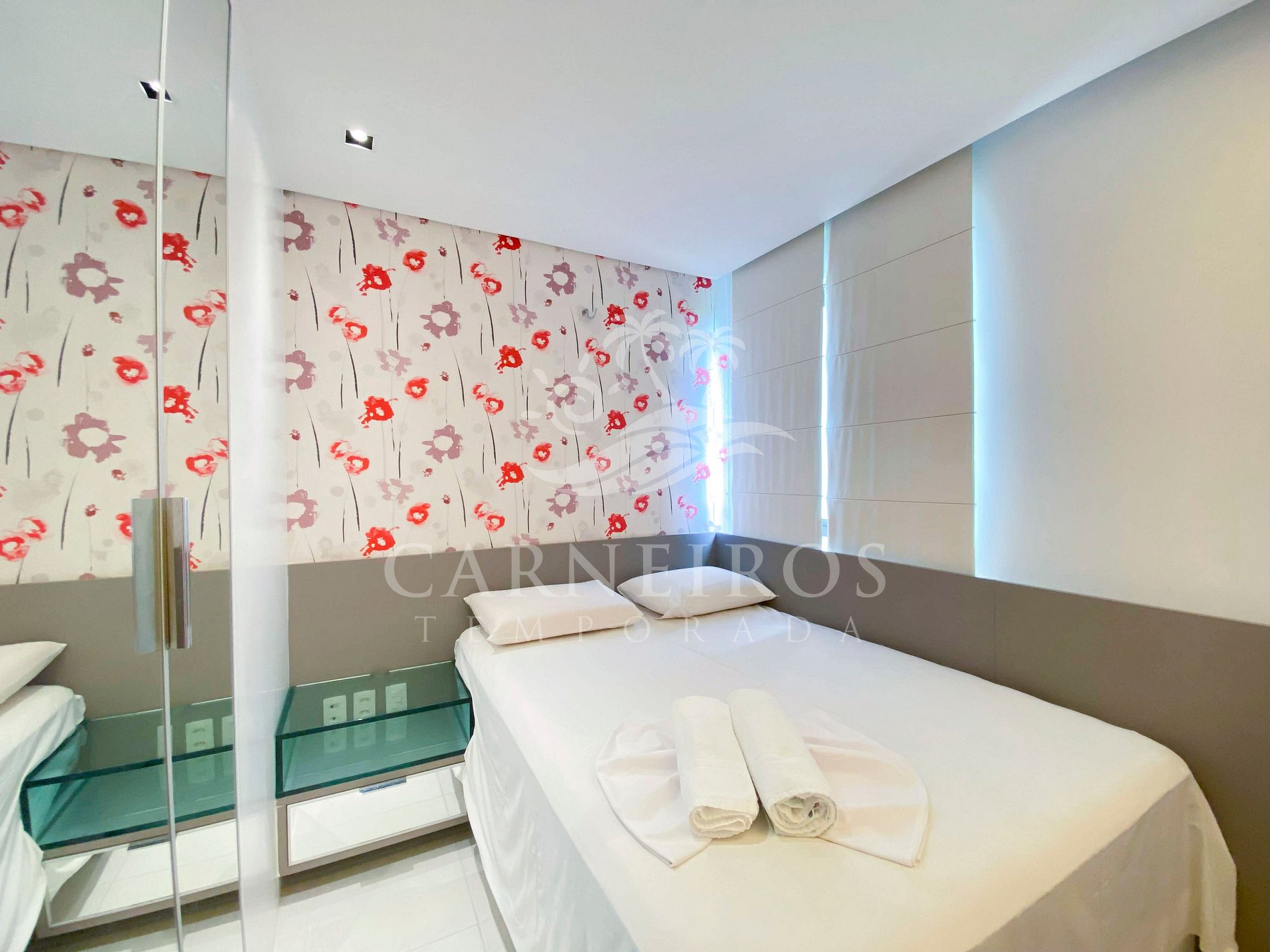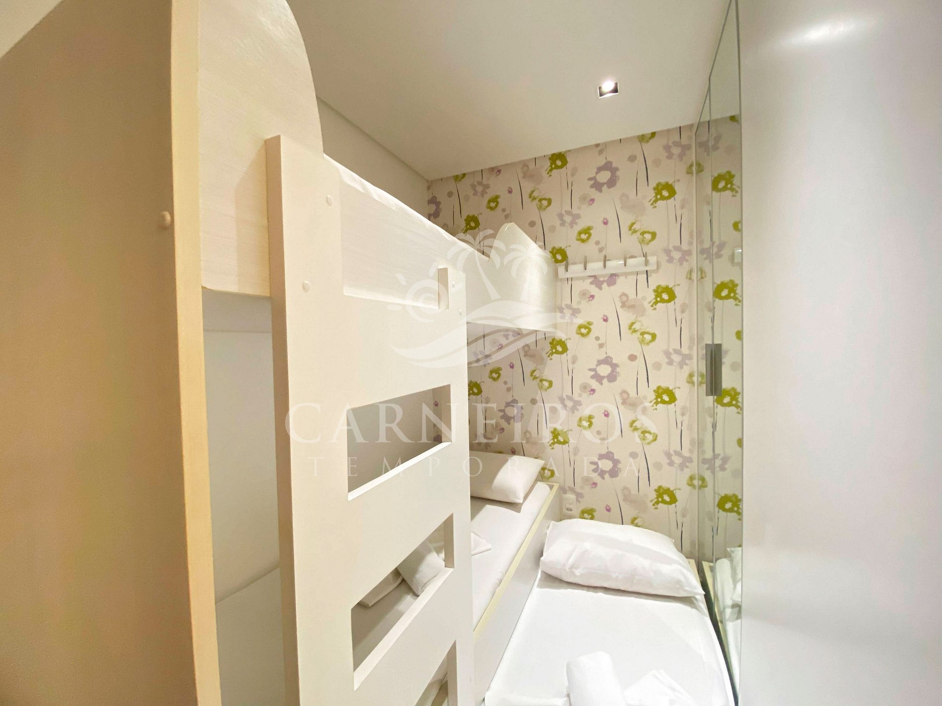 - Quarto 01: 1 cama box queen de casal + 01 beliche (acomoda até 04 pessoas), TV, mesa de cabeceira, ar condicionado e armários;