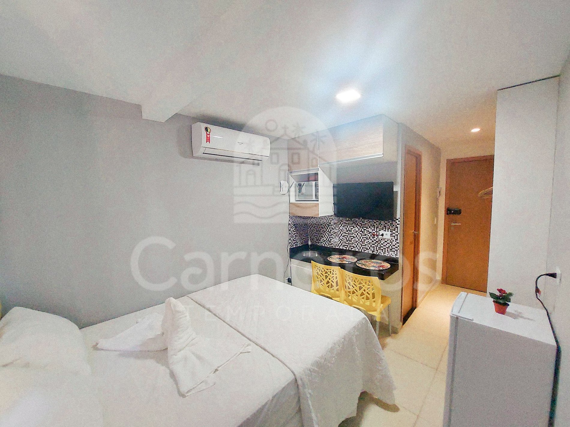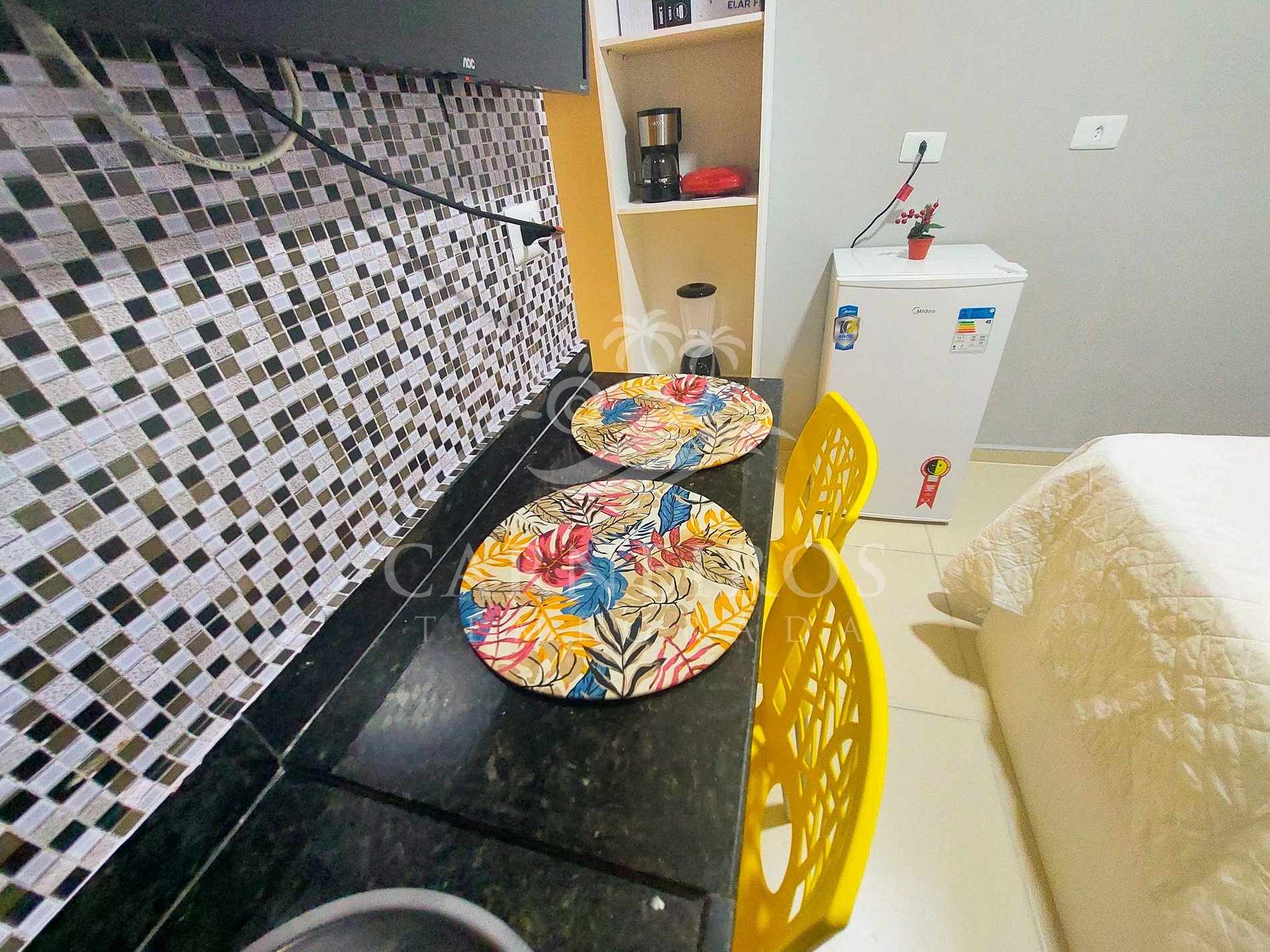 A área de estar conta com TV que conta com serviços de streaming, ar-condicionado e balcão com 02 cadeiras. A cozinha é equipada com os principais itens como louça, copos, talheres, fogão, micro-ondas, liquidificador, sanduicheira, cafeteira e frigobar. A acomodação possui também 01 banheiro completo e disponibiliza de ferro de passar.