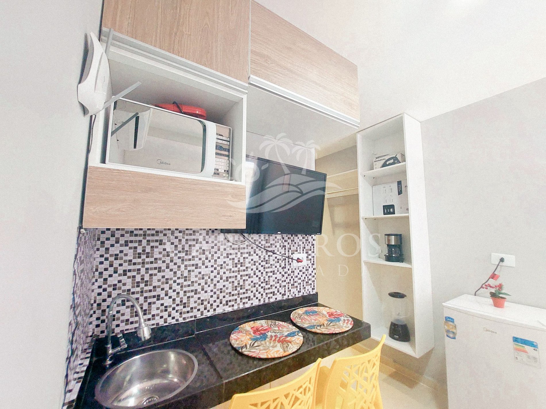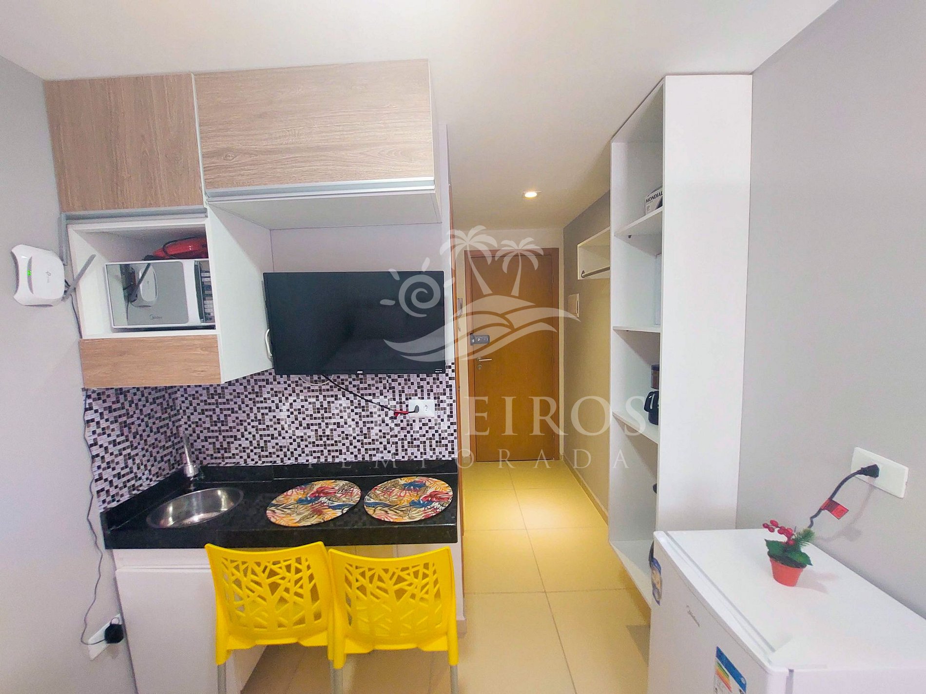 Mini cozinha pois fizemos tudo, café da manhã, almoço e janta, o funcionario da limpeza muito gentil, o elevador é tudo de bom, acomodação muito tranquila, pois podemos dormir muito bem todos os dias, tudo muito proximo bem como a praia e o centro, todos os dias ensolarados, dias enesqueciveis. Nota 10