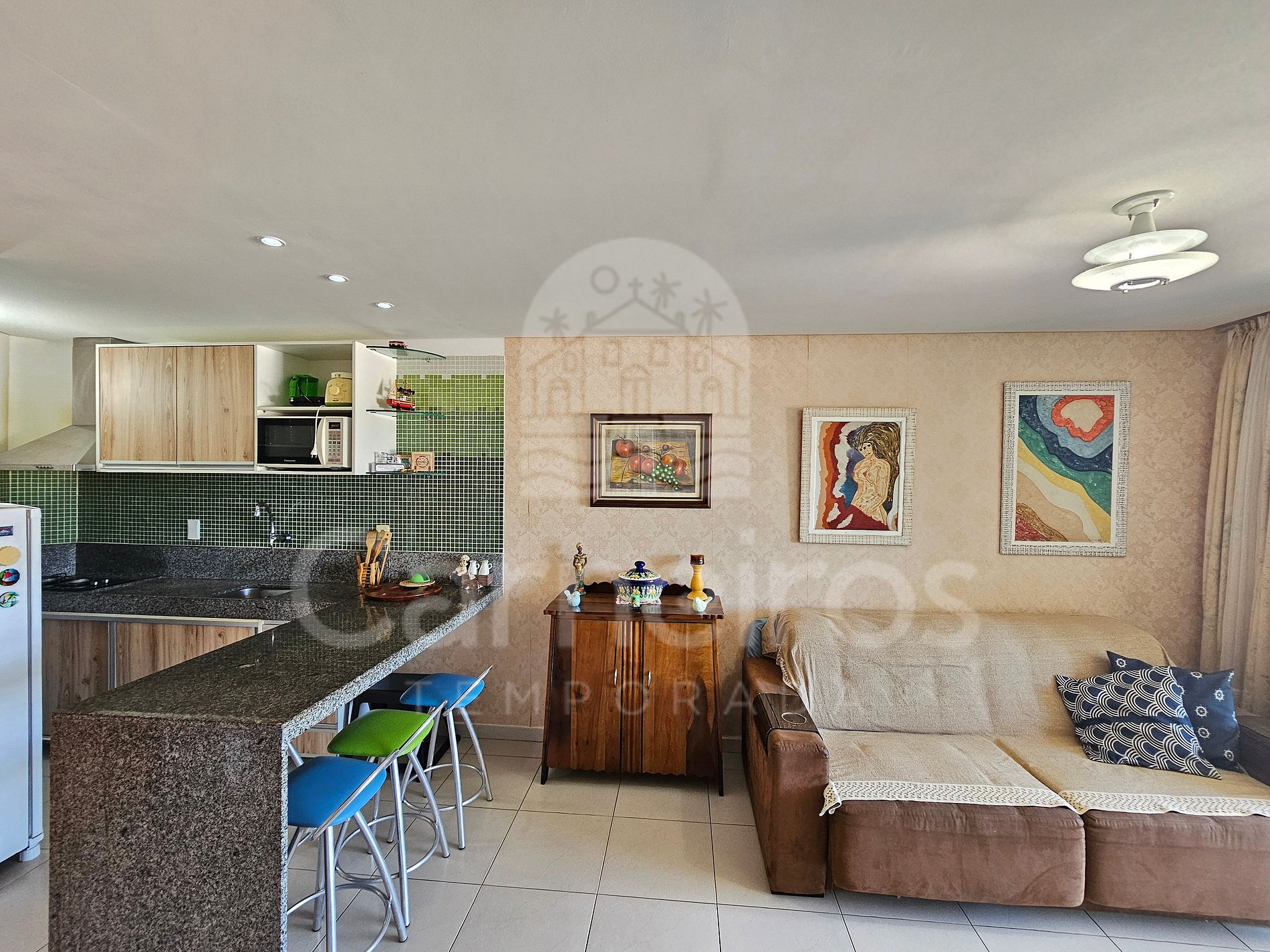 A sala de estar com uma decoração agradável e aconchegante possui TV a cabo com serviços de streaming e sofá. A cozinha é completa e possui diversos Itens como louça, copos, panelas, talheres, geladeira, fogão, forno, micro-ondas, liquidificador, sanduicheira, cafeteira e diversos utensílios. O flat possui 1 banheiro completo.