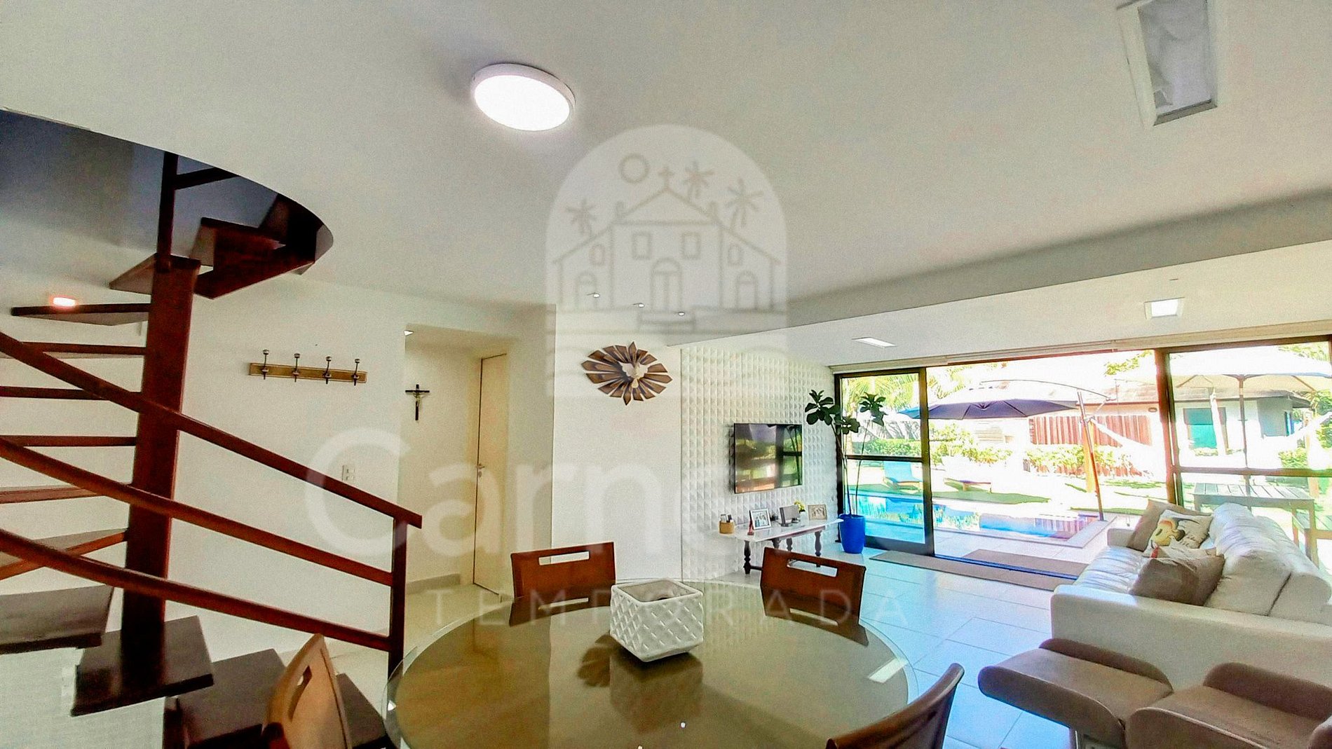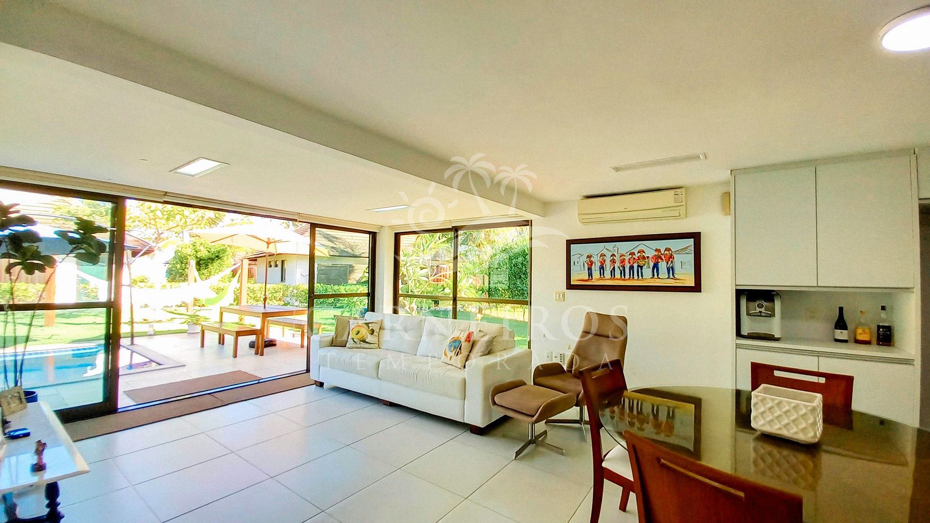 A sala de estar com agradável decoração possui sofá, ar-condicionado e TV com serviço de streaming. A cozinha é completa e possui diversos itens como geladeira, fogão, forno, micro-ondas, liquidificador, sanduicheira, cafeteira, torradeira, bebedouro, botijão de água/purificador, airfryer e outros utensílios. Há também espaço para refeições com mesa e 04 cadeiras. O bangalô possui 3 banheiros completos.