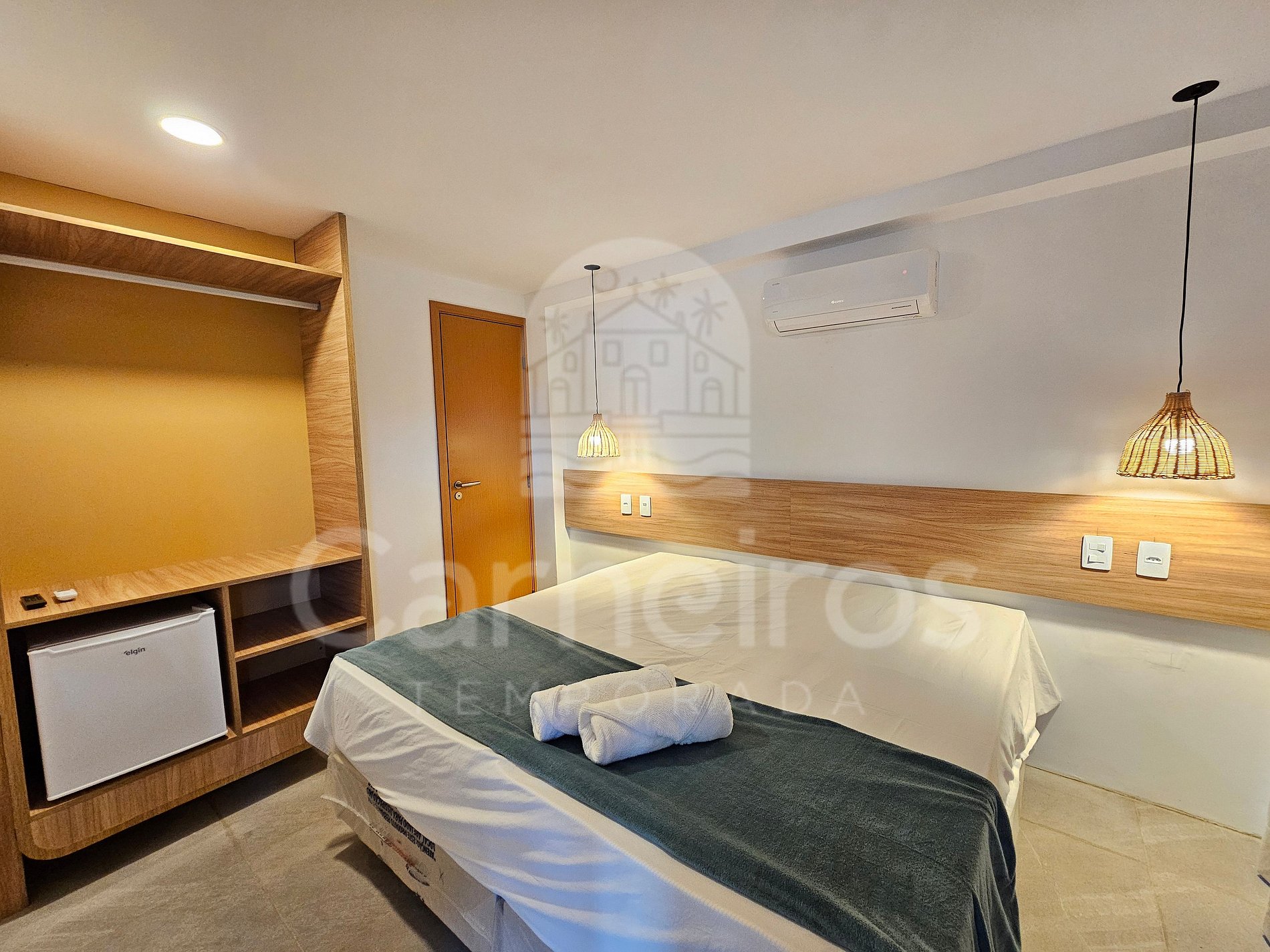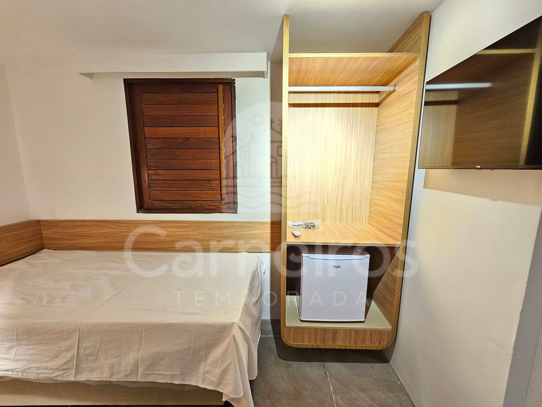 - Suíte 01: 1 cama de casal, TV, armário, frigobar, varanda privativa no andar de cima e ar-condicionado;