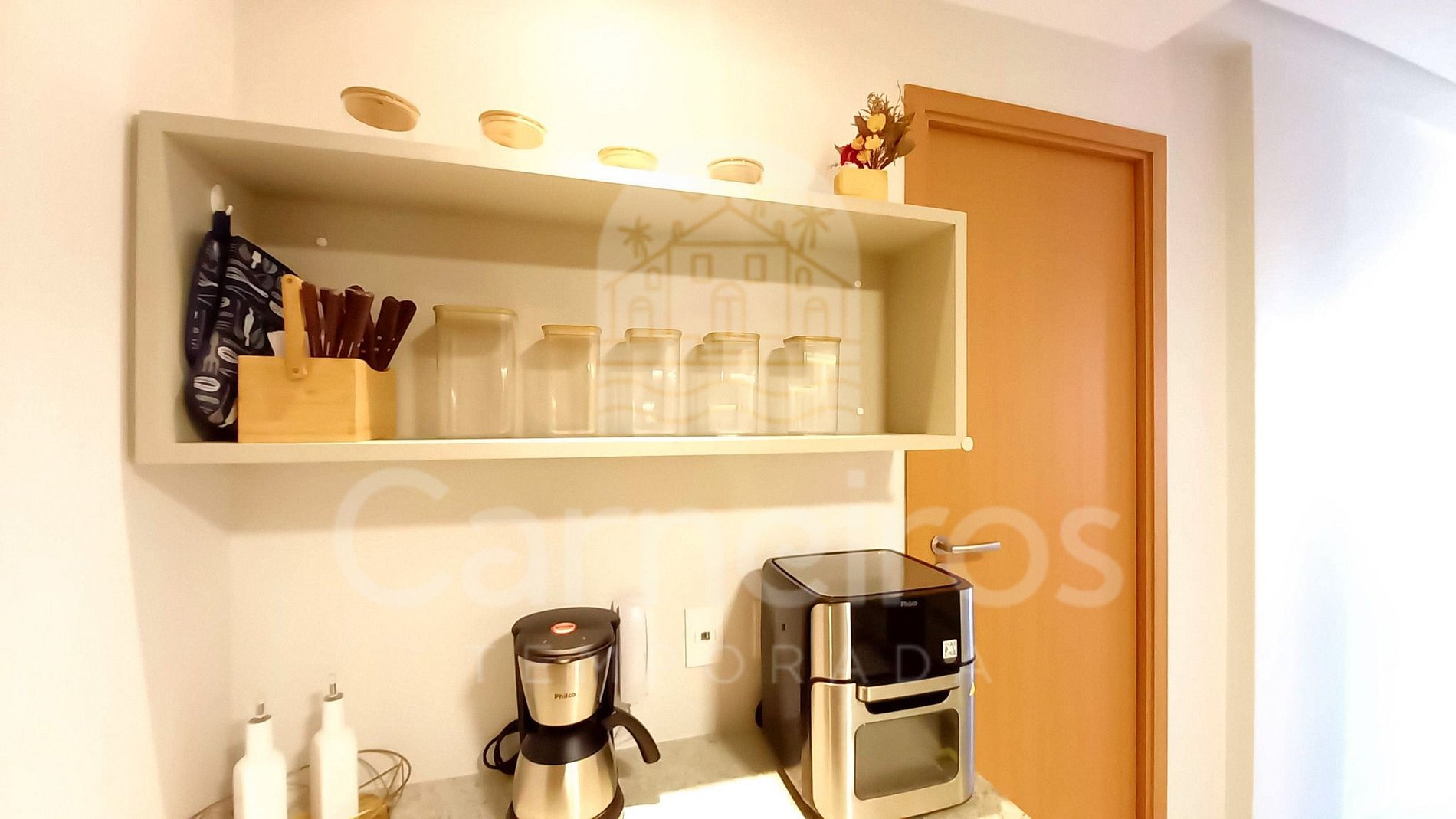 O ambiente com decoração aconchegante possui comodidades como sofá-cama de casal, ar-condicionado e TV com Serviço de streaming. A cozinha é completa e possui itens como geladeira, fogão, forno, micro-ondas, liquidificador, sanduicheira, cafeteira, batedeira, bebedouro, airfryer, botijão de água/purificador, mixer 3 em 1 e diversos utensílios. O flat possui 2 banheiros completos.
