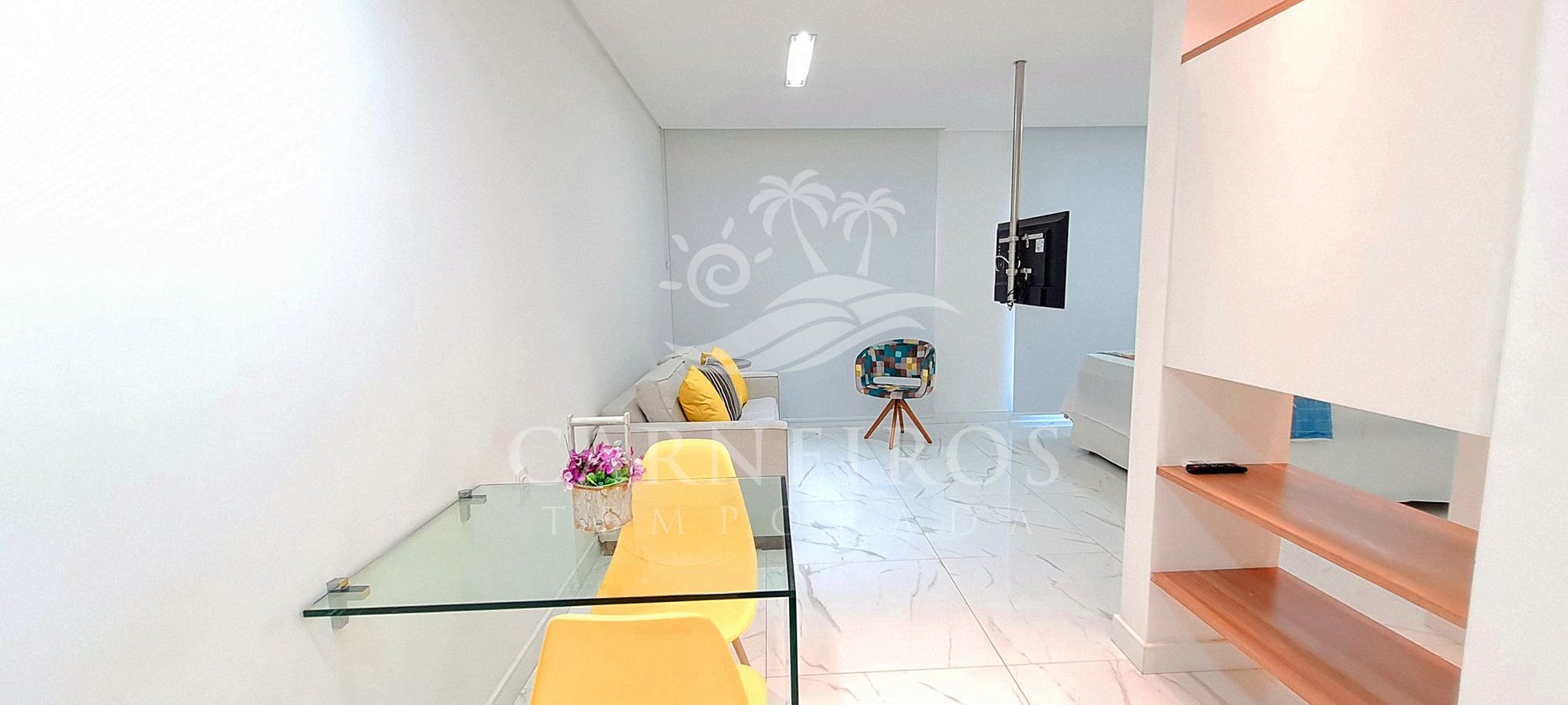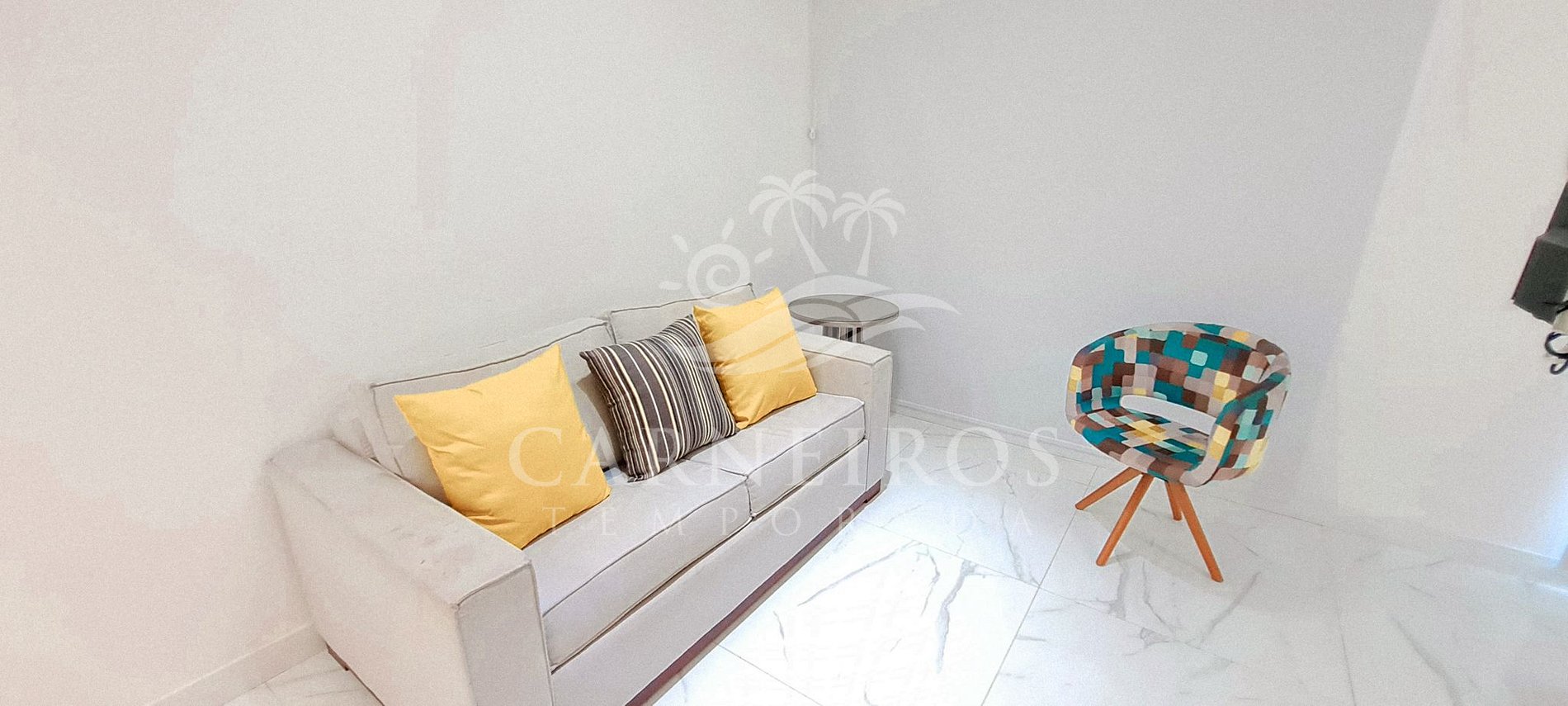 Na sala de estar conjugada a decoração minimalista traz toda calmaria que a praia passa, contendo um sofá-cama de casal. A cozinha é completa e equipada com os principais itens como louça, copos, panelas, talheres, sanduicheira, liquidificador, micro-ondas, fogão cooktop 02 bocas, geladeira e diversos utensílios. Além disso, temos uma mesa de vidro com duas cadeiras. Há também 1 banheiro com ducha quente o qual atende às necessidades diárias.