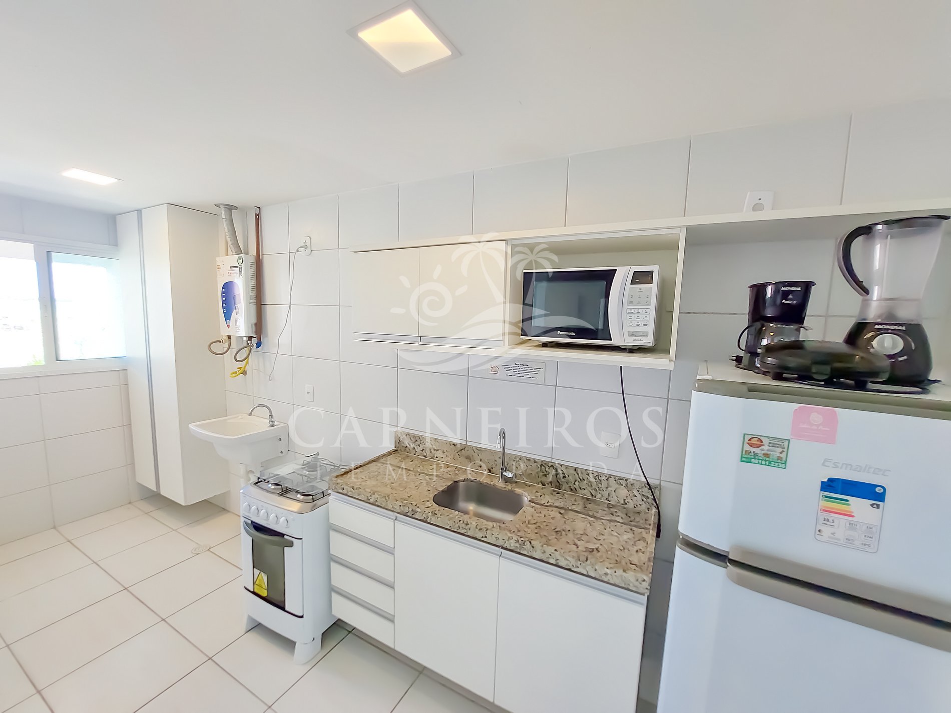 Na sala de estar a decoração minimalista traz toda calmaria que a praia passa, contendo uma TV, um sofá-cama de casal e mesa com quatro cadeiras. A cozinha é completa e equipada com os principais itens como louça, copos, panelas, talheres, sanduicheira, liquidificador, micro-ondas, fogão, geladeira e diversos utensílios. Há também 2 banheiro com ducha quente o qual atende às necessidades diárias.