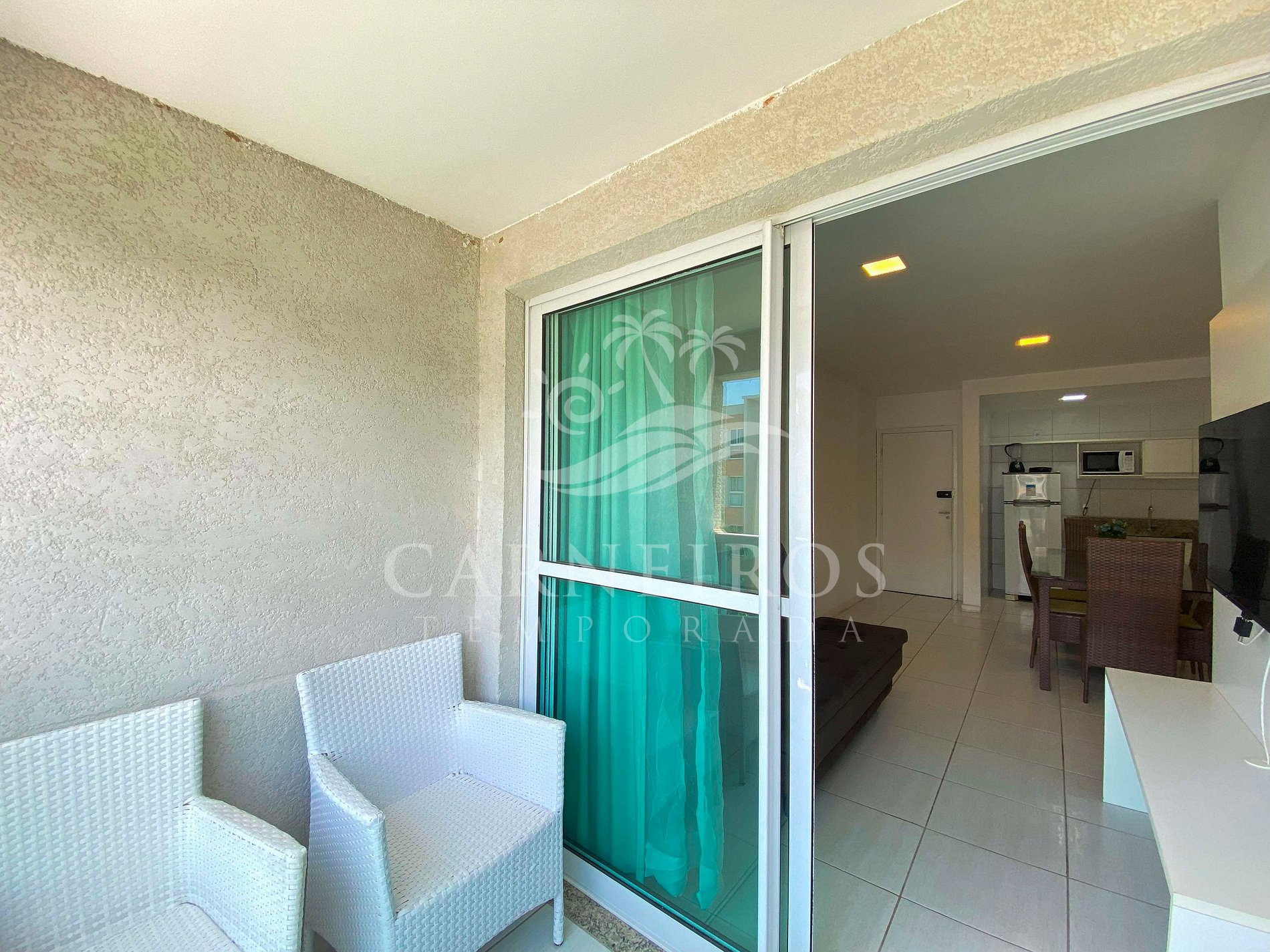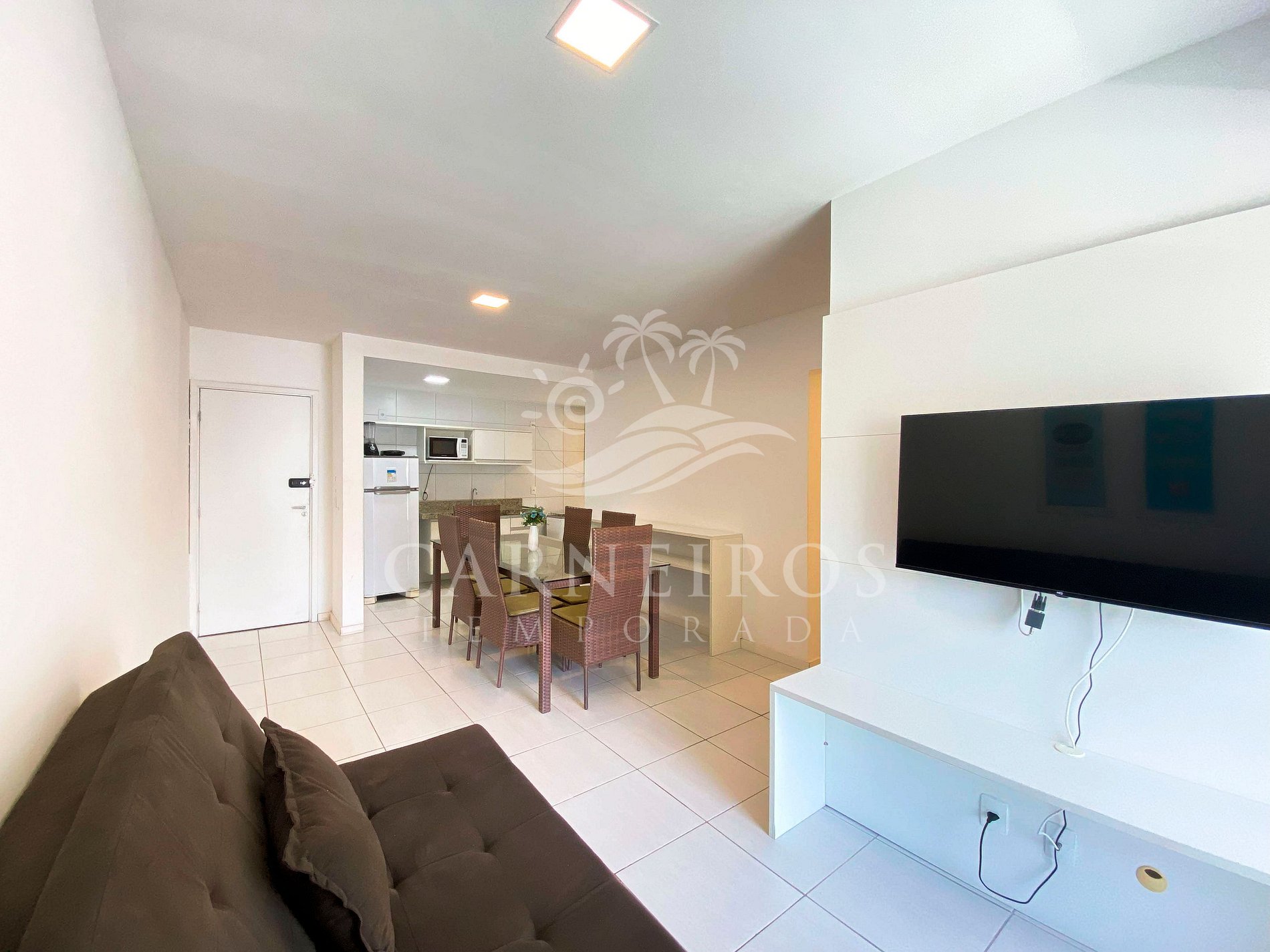 Na sala de estar a decoração minimalista traz toda calmaria que a praia passa, contendo uma TV, um sofá-cama de casal e mesa com dois bancos. A cozinha é completa e equipada com os principais itens como louça, copos, panelas, talheres, sanduicheira, liquidificador, micro-ondas, fogão, geladeira e diversos utensílios. Há também 2 banheiros completos.