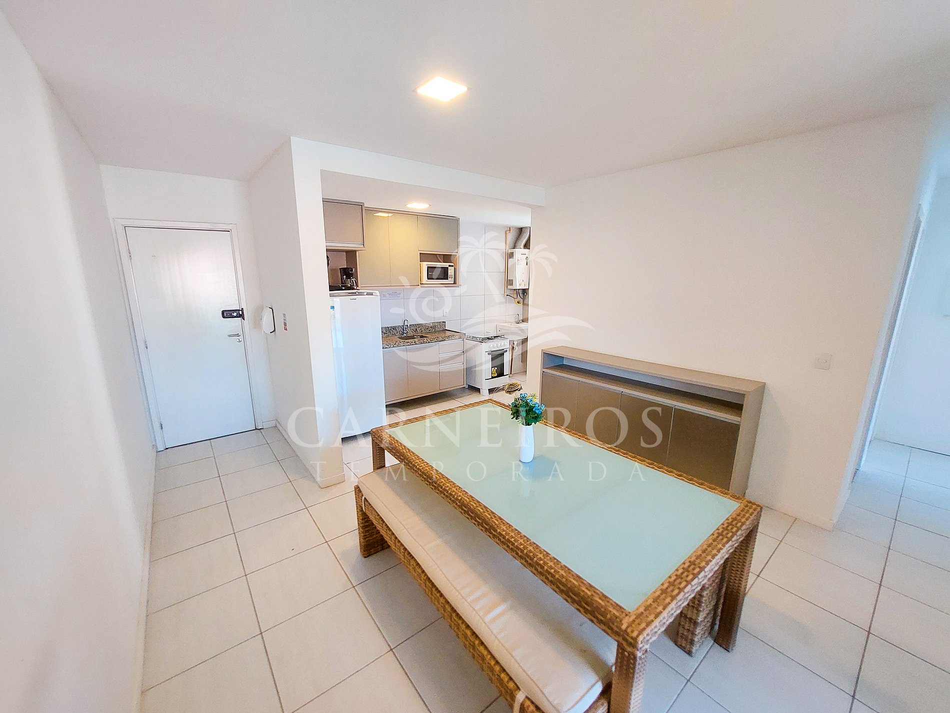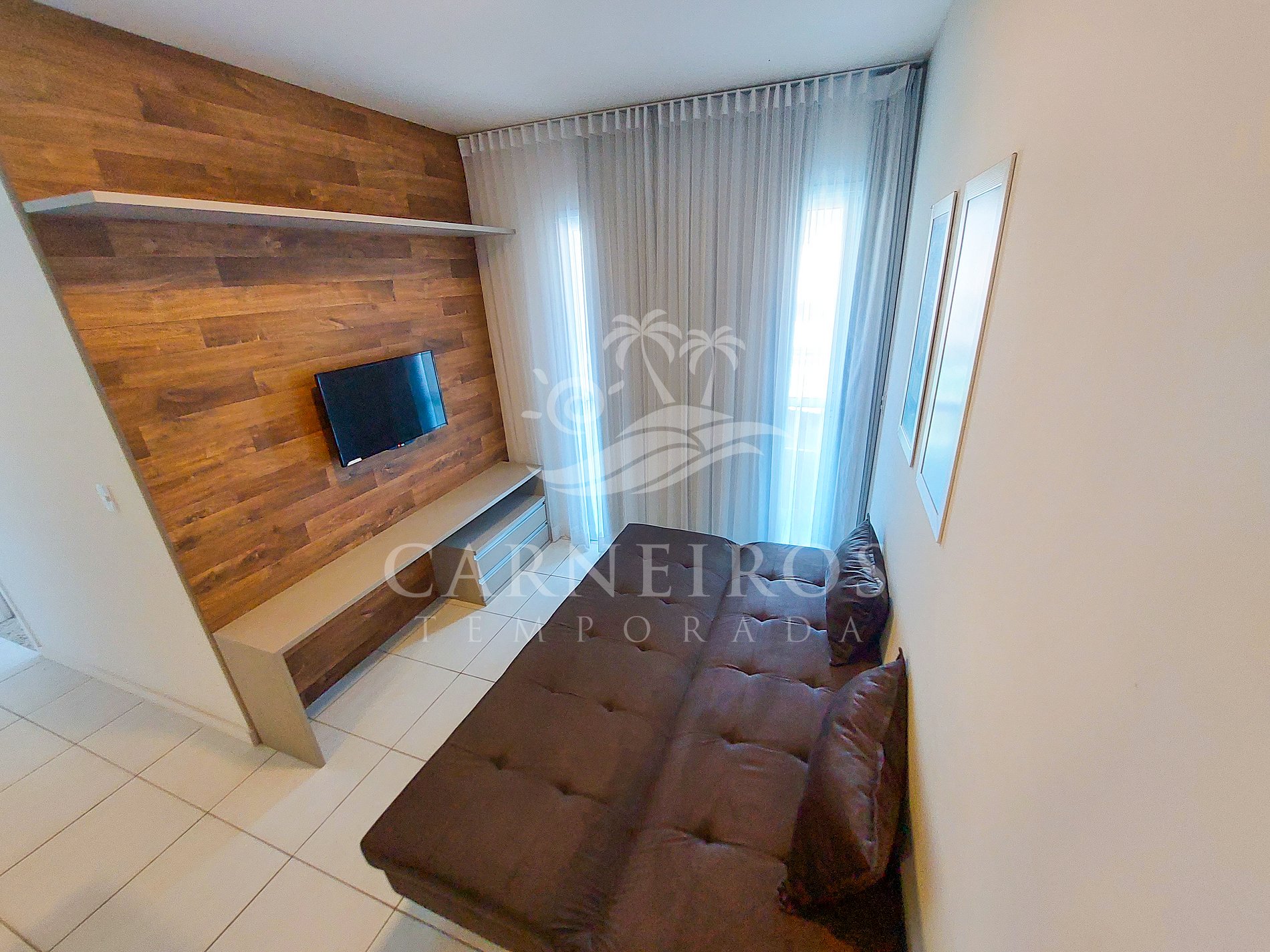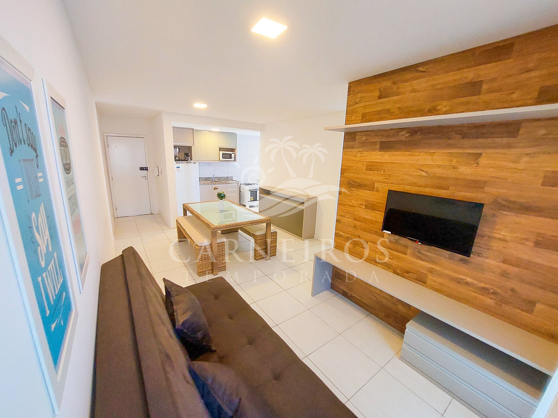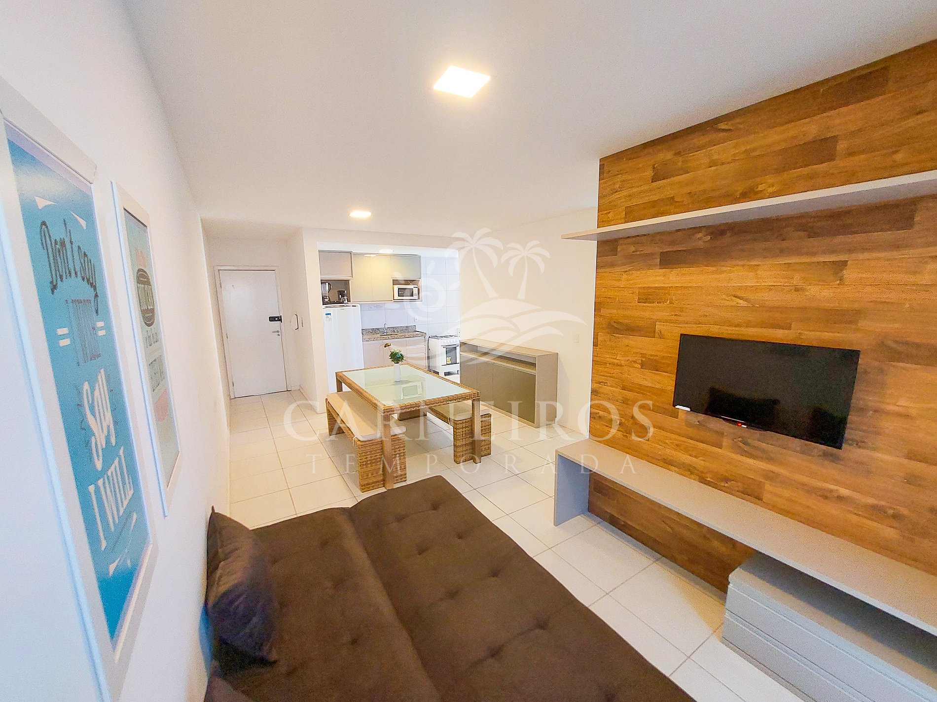 Na sala de estar a decoração minimalista traz toda calmaria que a praia passa, contendo uma TV, um sofá-cama de casal e mesa com dois bancos. A cozinha é completa e equipada com os principais itens como louça, copos, panelas, talheres, sanduicheira, liquidificador, micro-ondas, fogão, geladeira e diversos utensílios. Há também 2 banheiros completos.