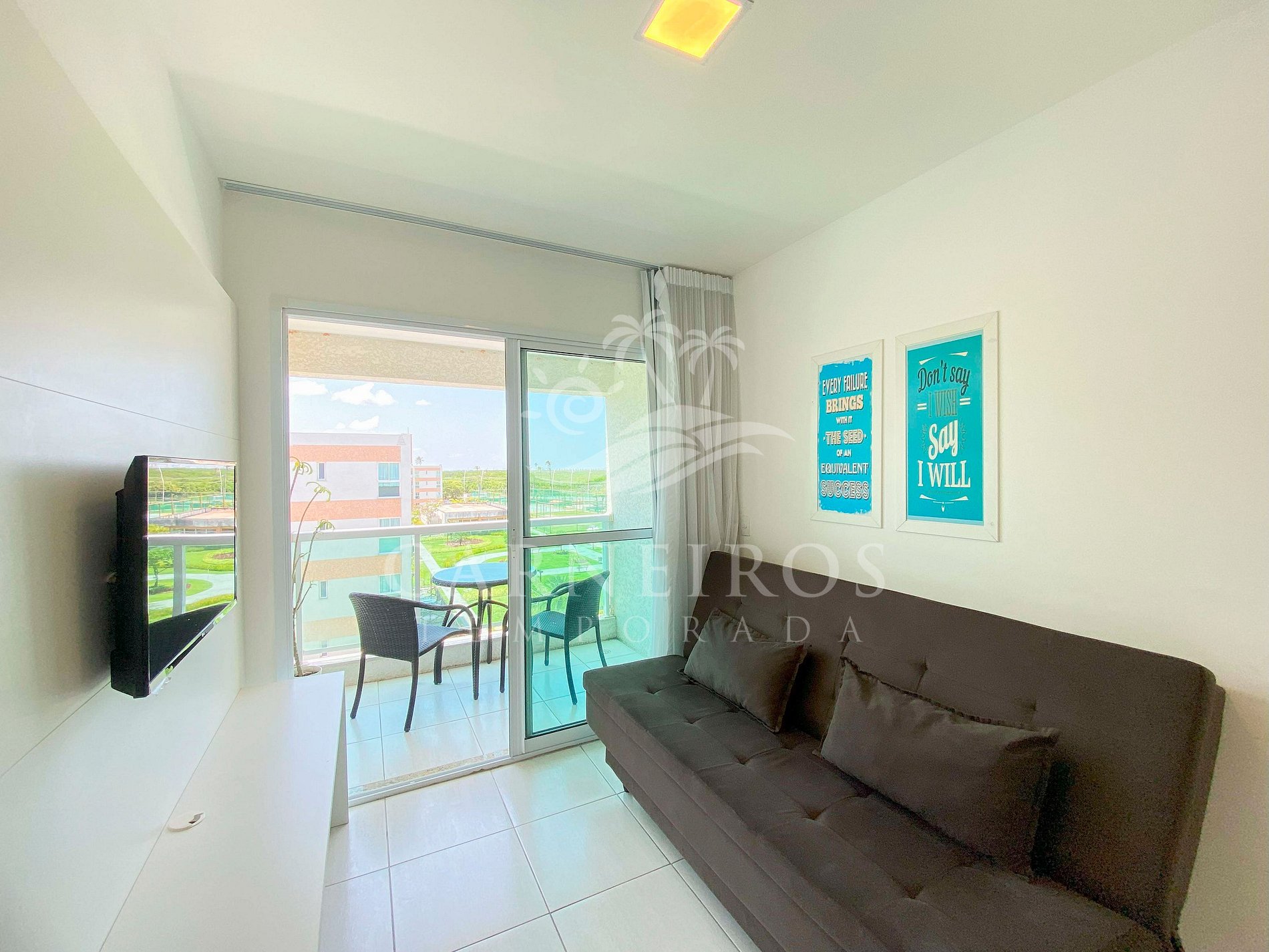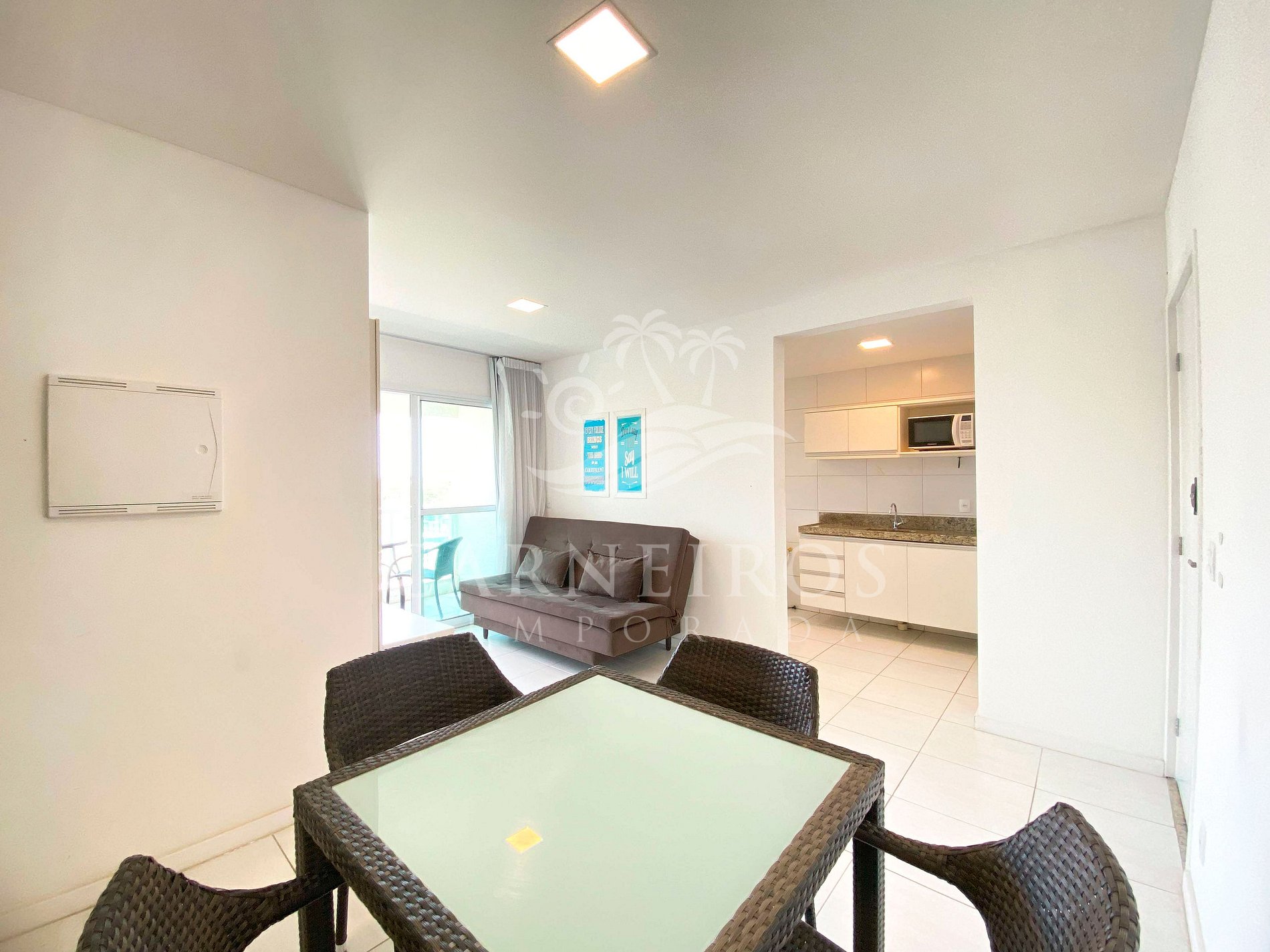 Na sala de estar a decoração minimalista traz toda calmaria que a praia passa, contendo uma TV, um sofá cama de casal e mesa com quatro cadeiras. A cozinha é completa e equipada com os principais ítens como louça, copos, panelas, talheres, sanduicheira, liquidificador, micro-ondas, fogão, geladeira e diversos utensílios. Há também 2 banheiro com ducha quente o qual atende às necessidades diárias.