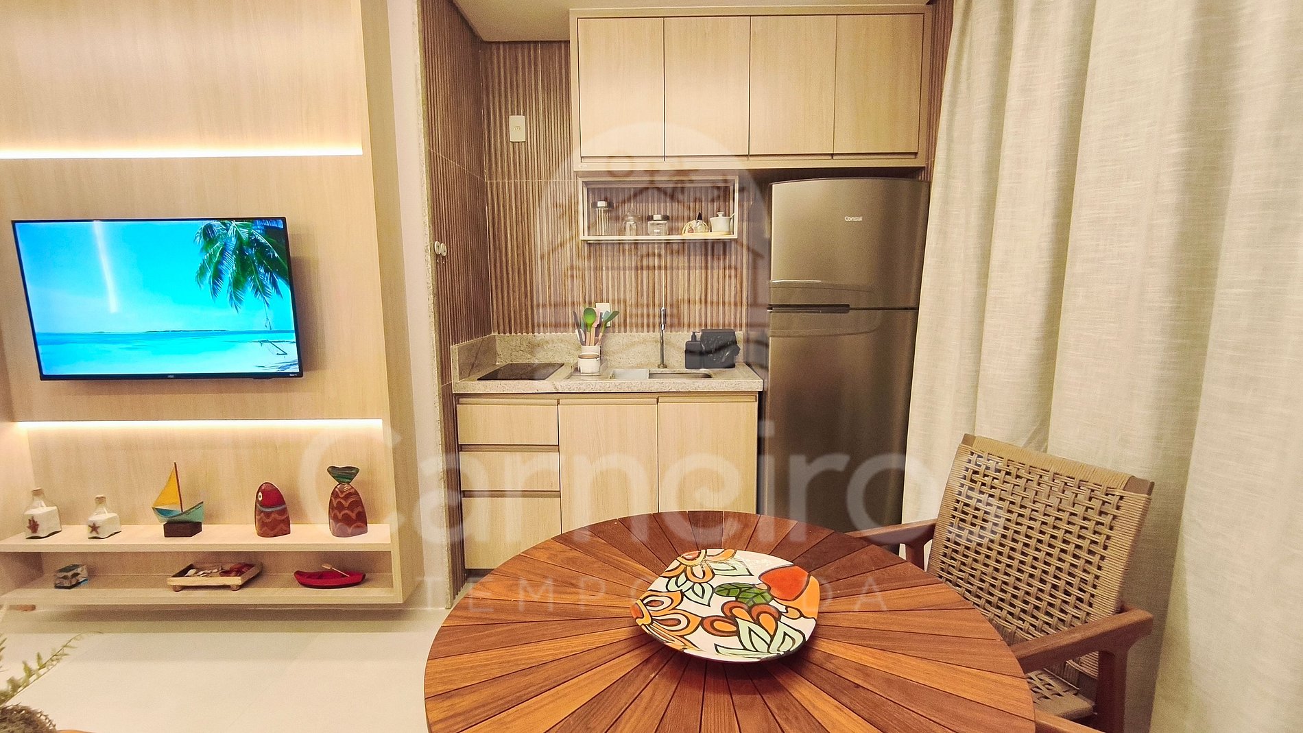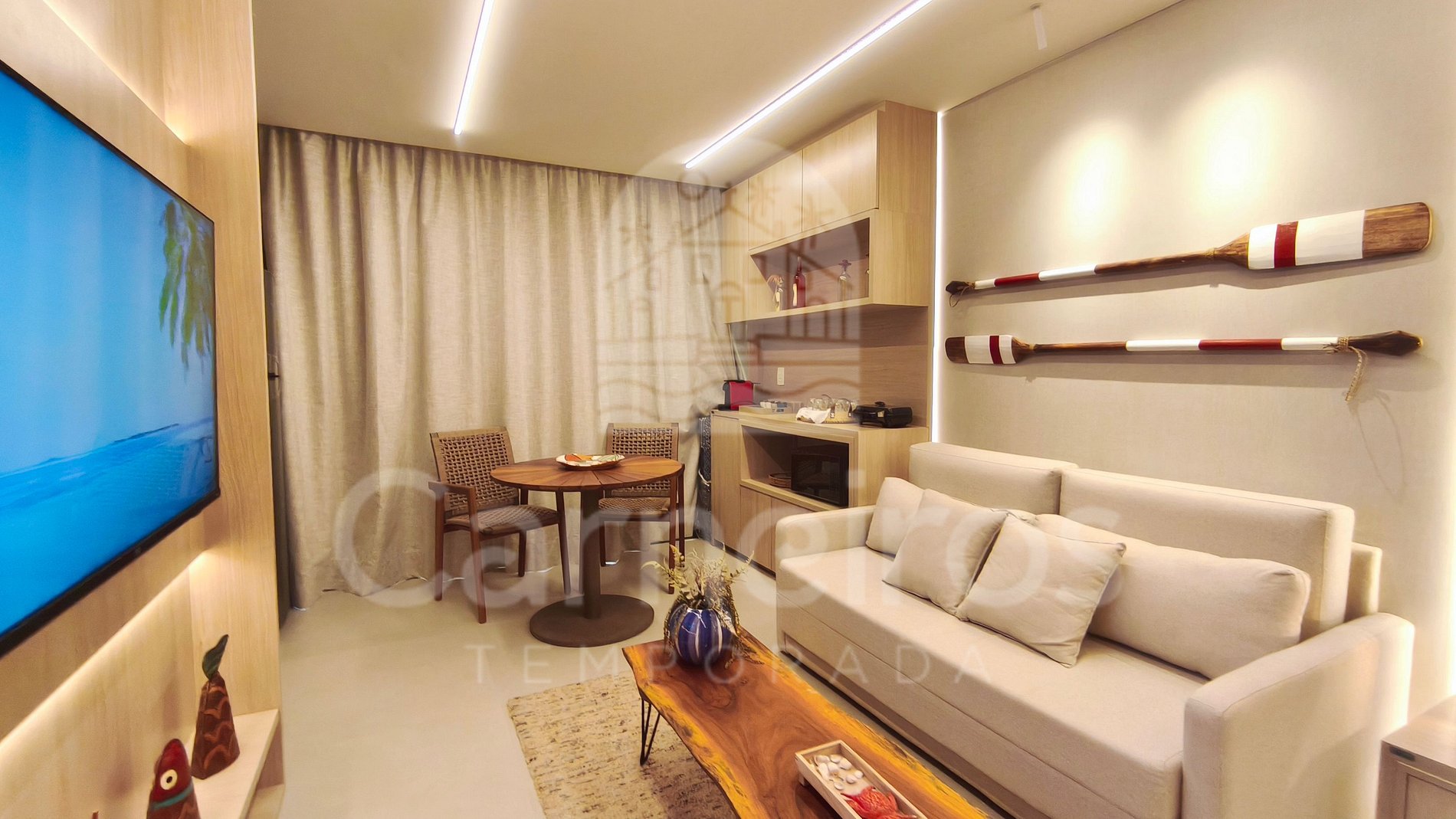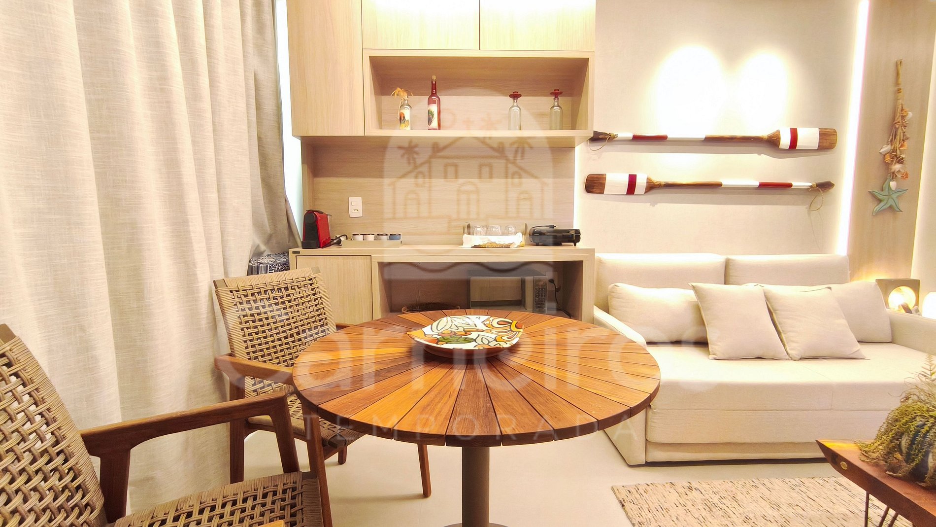 A varanda gourmet oferece uma mesa com duas cadeiras, um sofá aconchegante, um balcão com pia e uma churrasqueira portátil, ideal para lazer e descontração. A sala, decorada em estilo moderno, possui um sofá-cama, TV e ar-condicionado para momentos de conforto. Já a cozinha está completa com louças, panelas, talheres e eletrodomésticos como geladeira, fogão, micro-ondas, purificador de água, cafeteira e liquidificador. Para maior comodidade, o imóvel conta ainda com um banheiro completo.