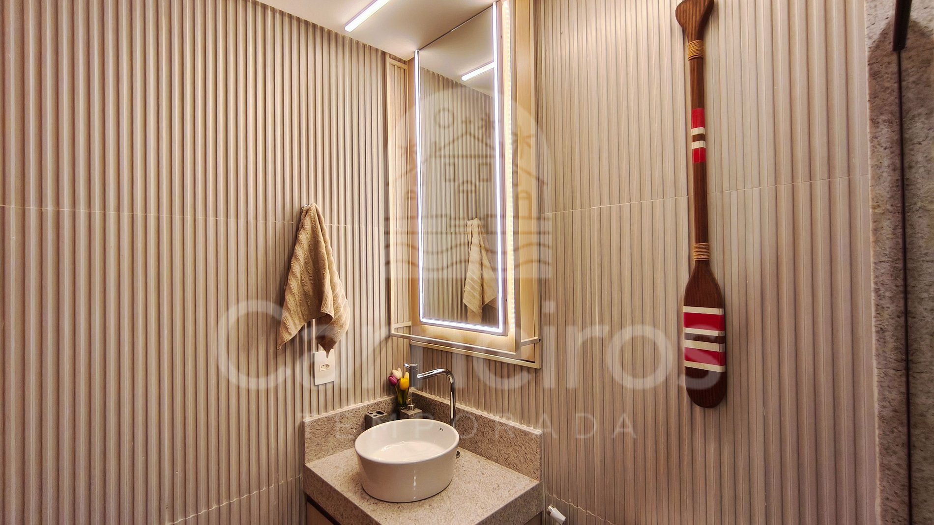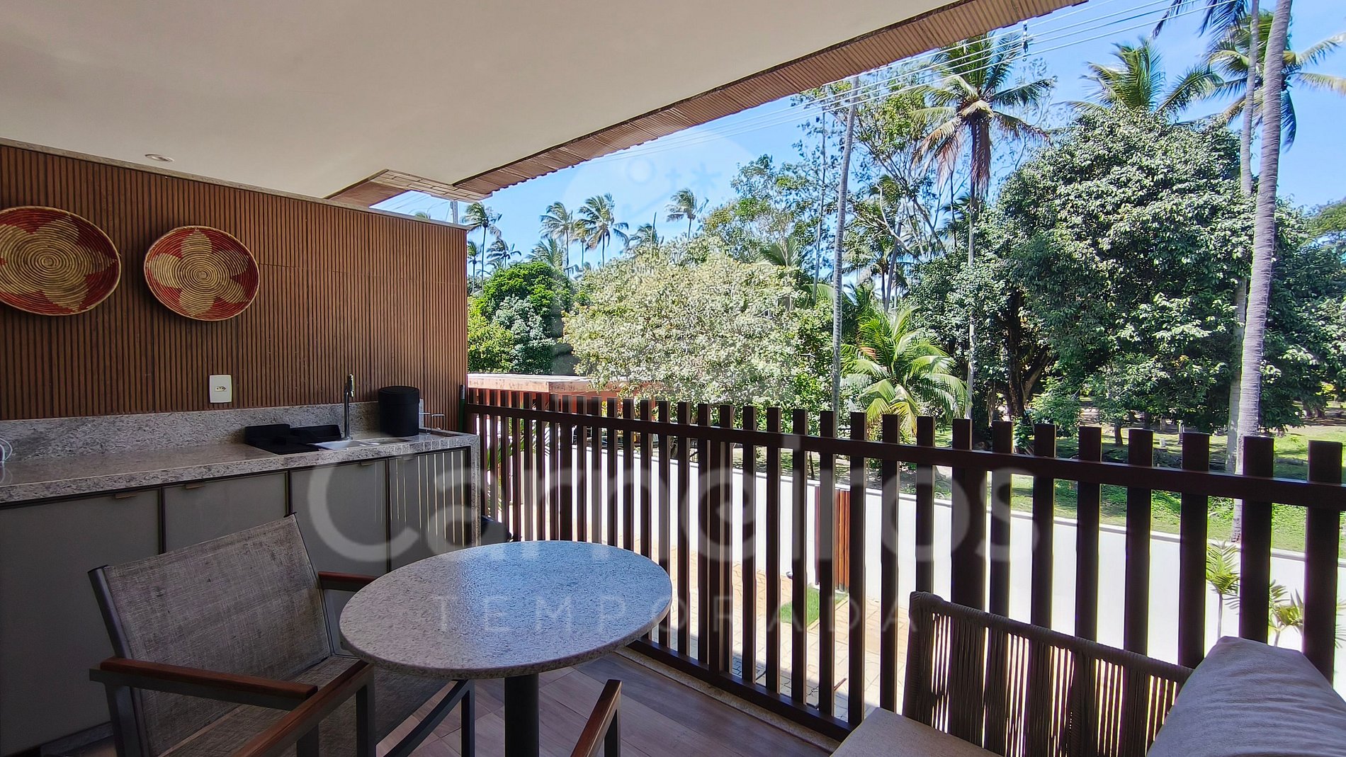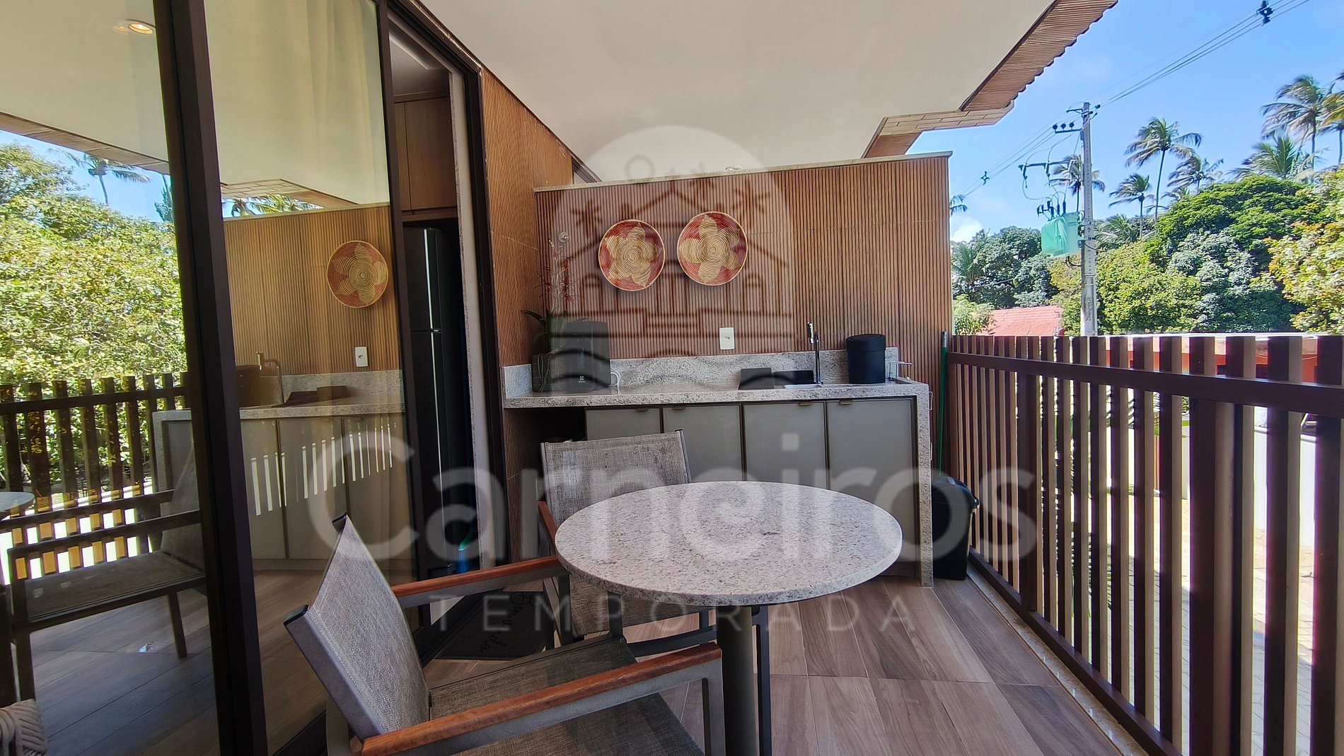 A varanda gourmet oferece uma mesa com duas cadeiras, um sofá aconchegante, um balcão com pia e uma churrasqueira portátil, ideal para lazer e descontração. A sala, decorada em estilo moderno, possui um sofá-cama, TV e ar-condicionado para momentos de conforto. Já a cozinha está completa com louças, panelas, talheres e eletrodomésticos como geladeira, fogão, micro-ondas, purificador de água, cafeteira e liquidificador. Para maior comodidade, o imóvel conta ainda com um banheiro completo.