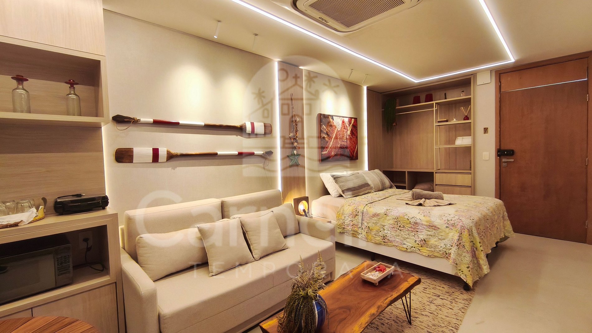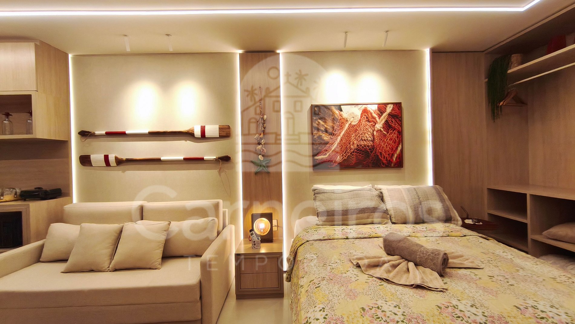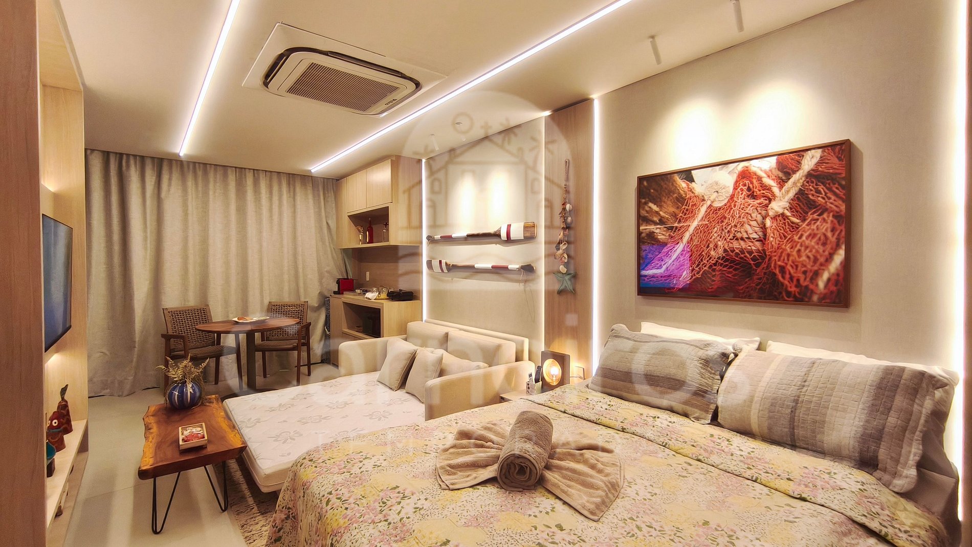 - Estúdio: Sofá-cama de casal + Cama Queen, TV, armário e ar-condicionado.