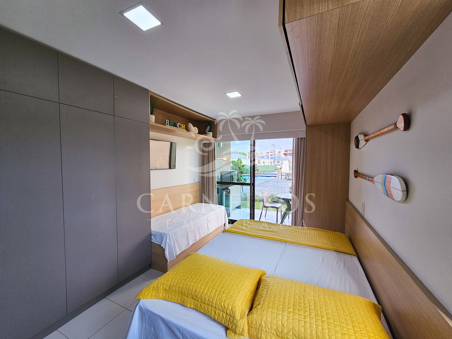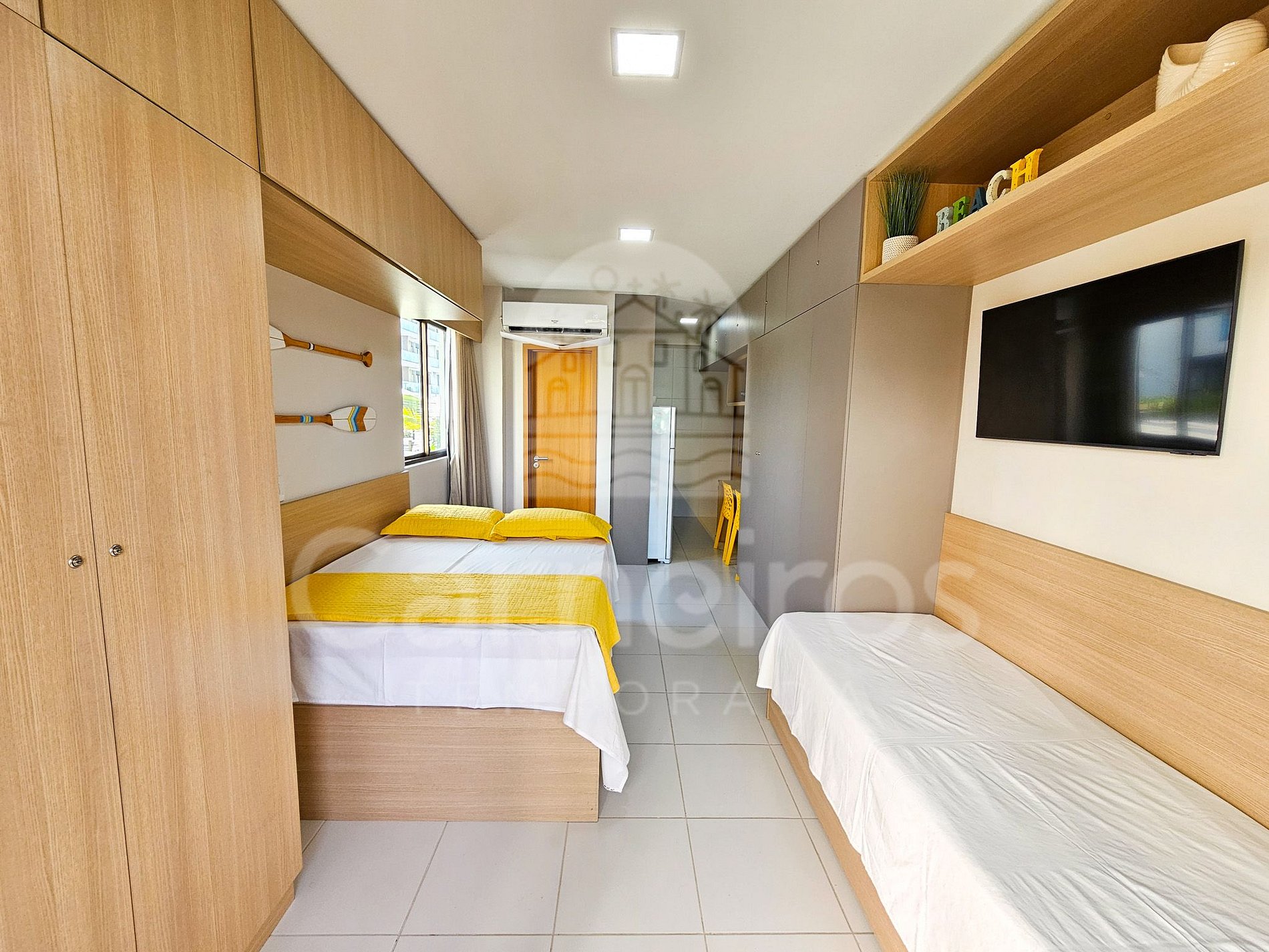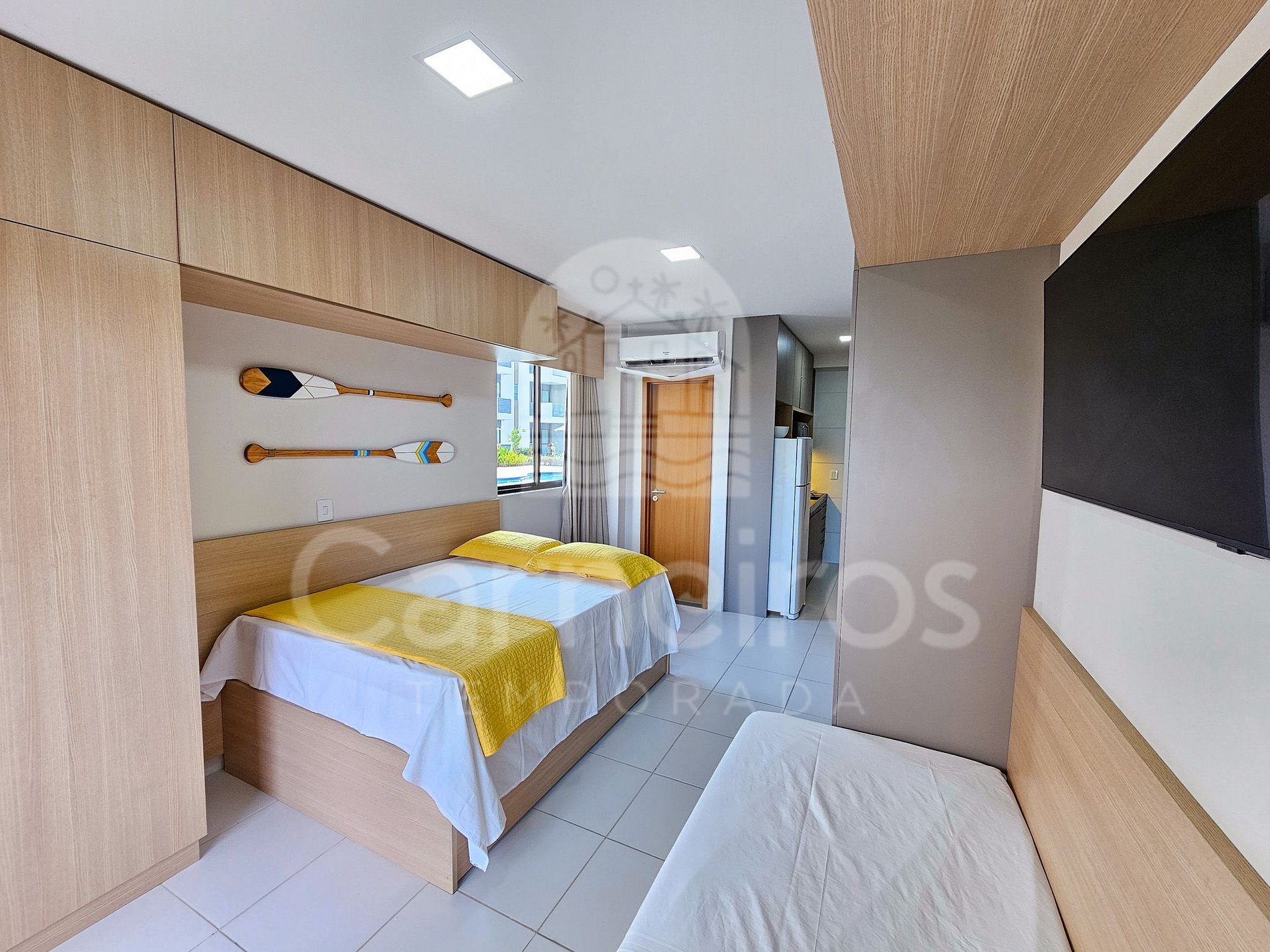 Estúdio: 1 cama de solteiro + 1 cama de casal, TV, armário e ar-condicionado