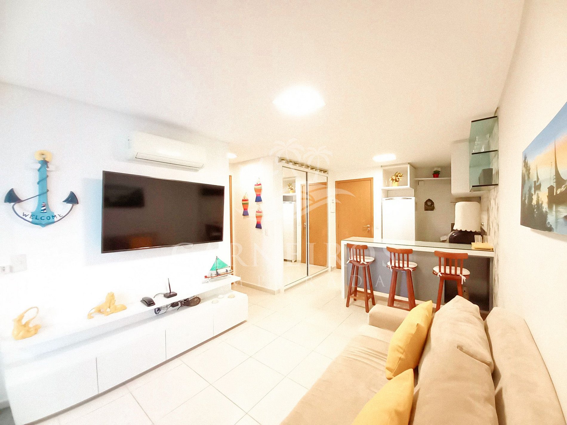 A sala de estar com decoração agradável conta com uma TV, ar condicionado e sofá. A cozinha é completa e possui itens como louça, copos, panelas, talheres, fogão, forno, micro-ondas, geladeira, liquidificador, sanduicheira, cafeteira, batedeira, purificador de água e diversos utensílios. Além disso, contém área para refeições com balcão e 03 bancos. O flat possui 01 banheiro completo.