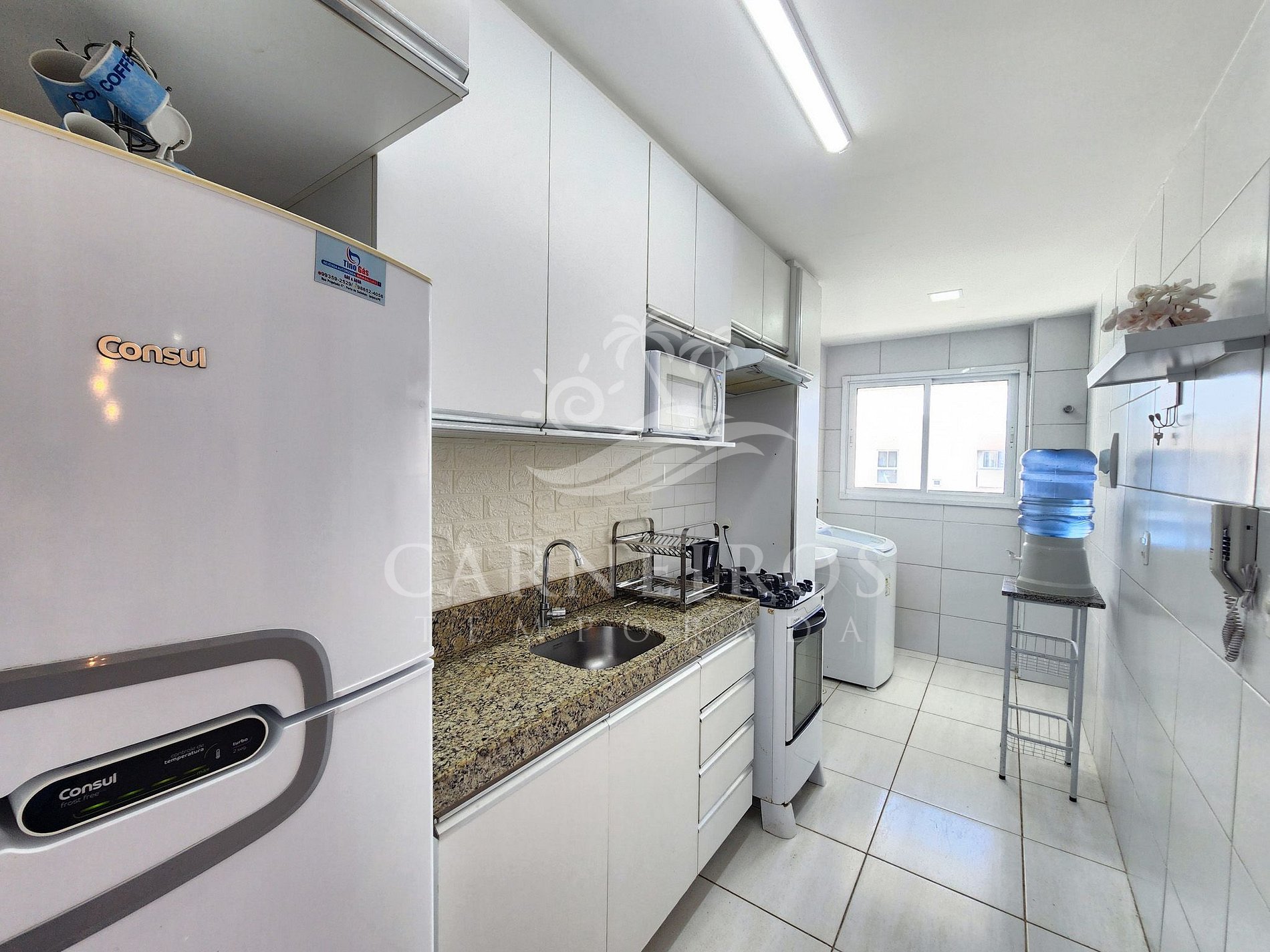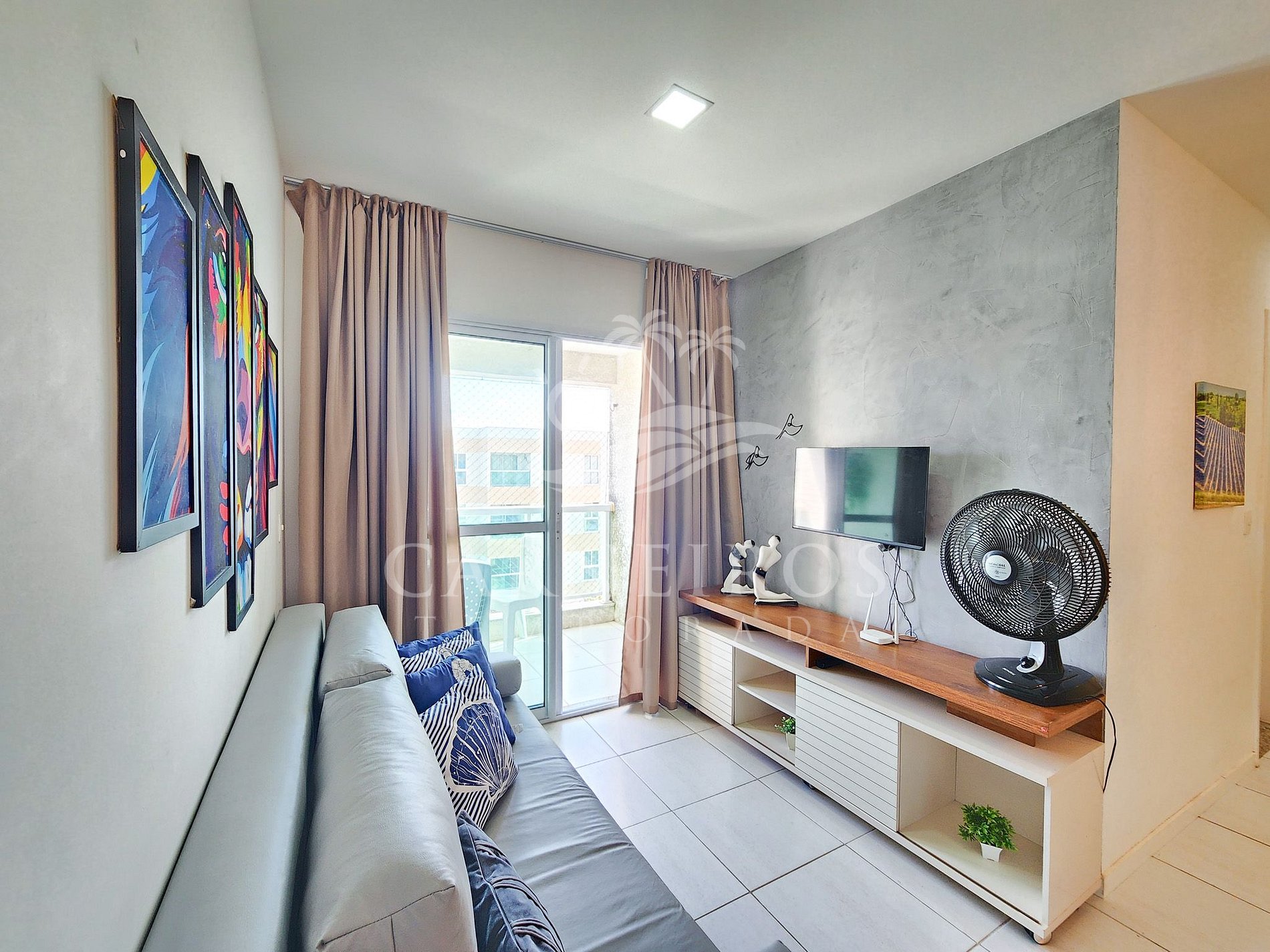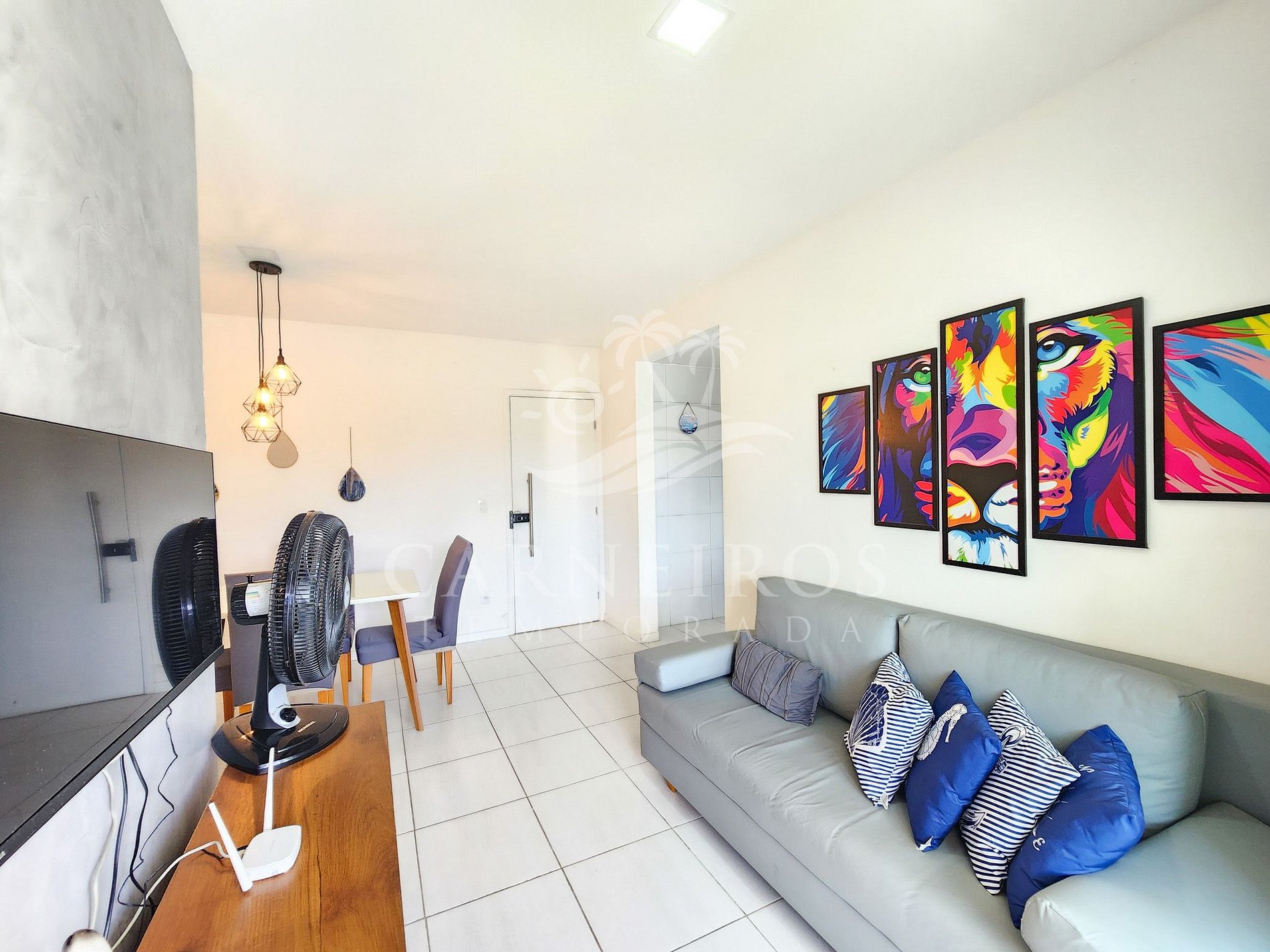 Na sala de estar a decoração é moderna para trazer conforto, possuindo TV, sofá e ar-condicionado. A cozinha é completa e equipada com os principais itens como louça, copos, panelas, talheres, sanduicheira, liquidificador, micro-ondas, fogão, bebedouro, geladeira e diversos utensílios. Além disso, conta com uma mesa de jantar e 2 banheiros completos.