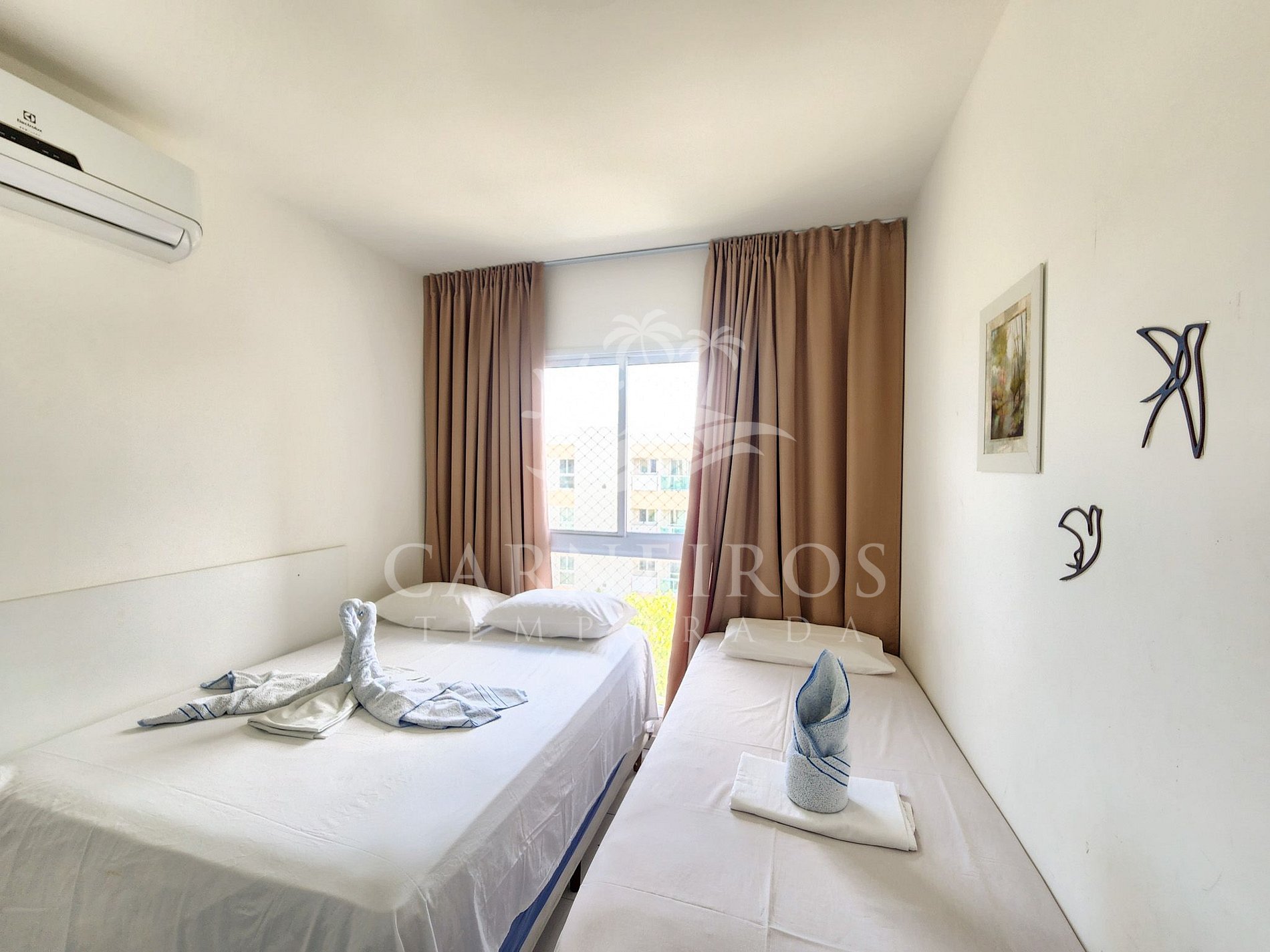 - Quarto 01: 1 Beliche solteiro + 1 cama de casal com bicama casal, armários e ar-condicionado.