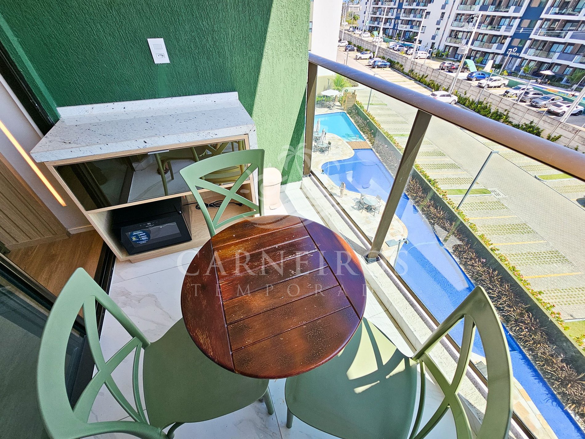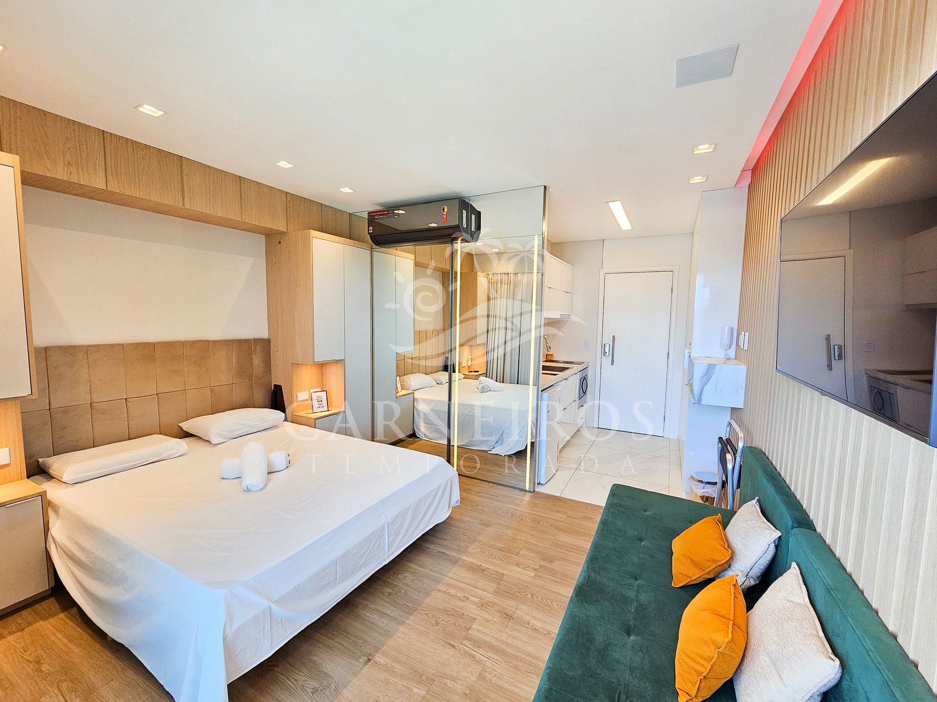 No ambiente integrado, além da agradável decoração, você encontrará uma TV, sofá-cama de casal, cama de casal queen e ar-condicionado. A cozinha é completa e equipada com os principais utensílios como louças, panelas, talheres, frigobar, fogão cooktop 2 bocas, micro-ondas, liquidificador, sanduicheira, cafeteira e outros. Também conta com 1 banheiro completo.