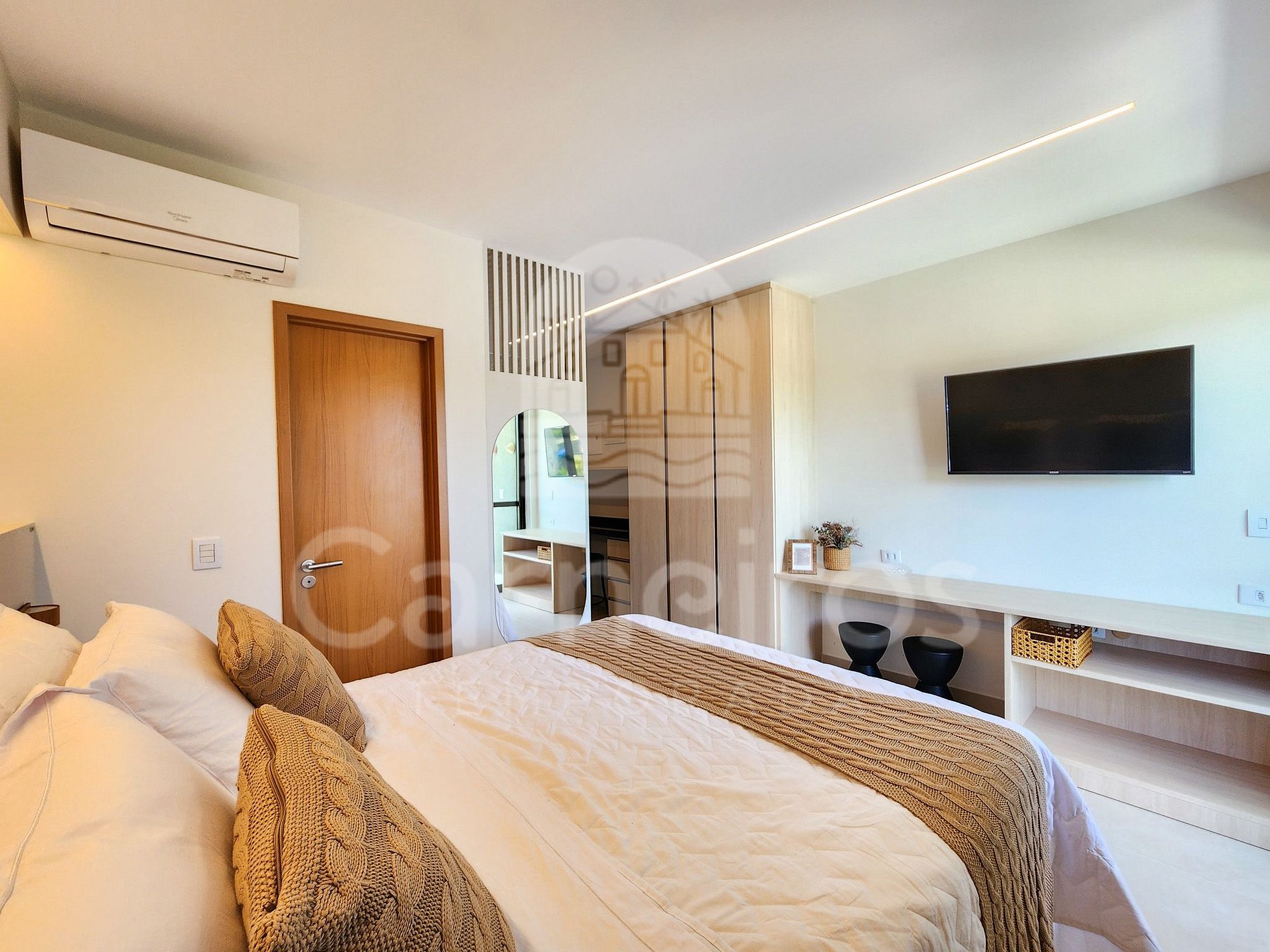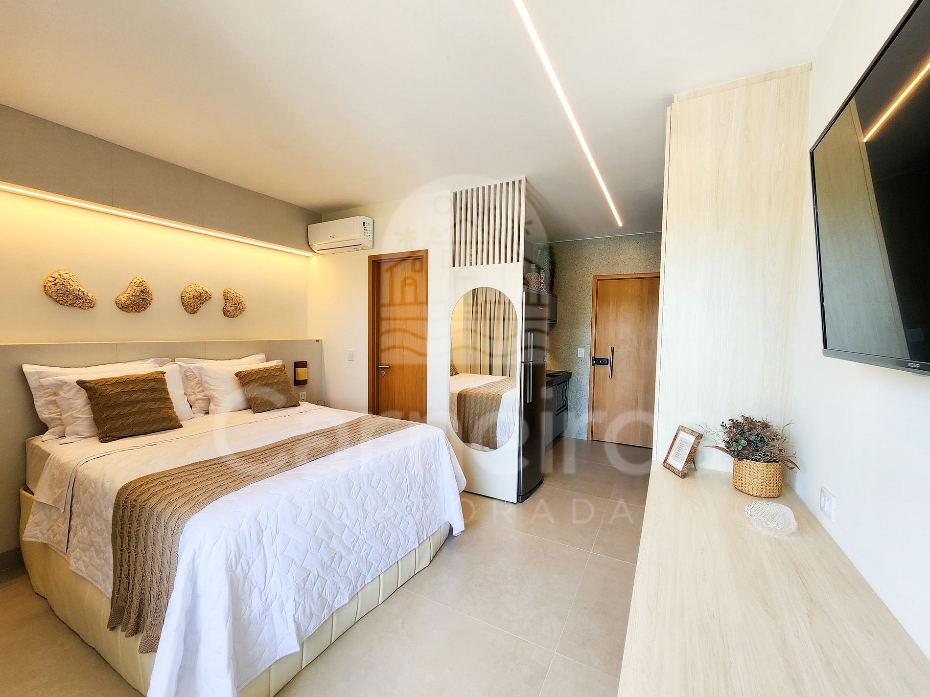 Estúdio: 1 cama Queen + 1 bicama de solteiro, TV, armário e ar-condicionado.