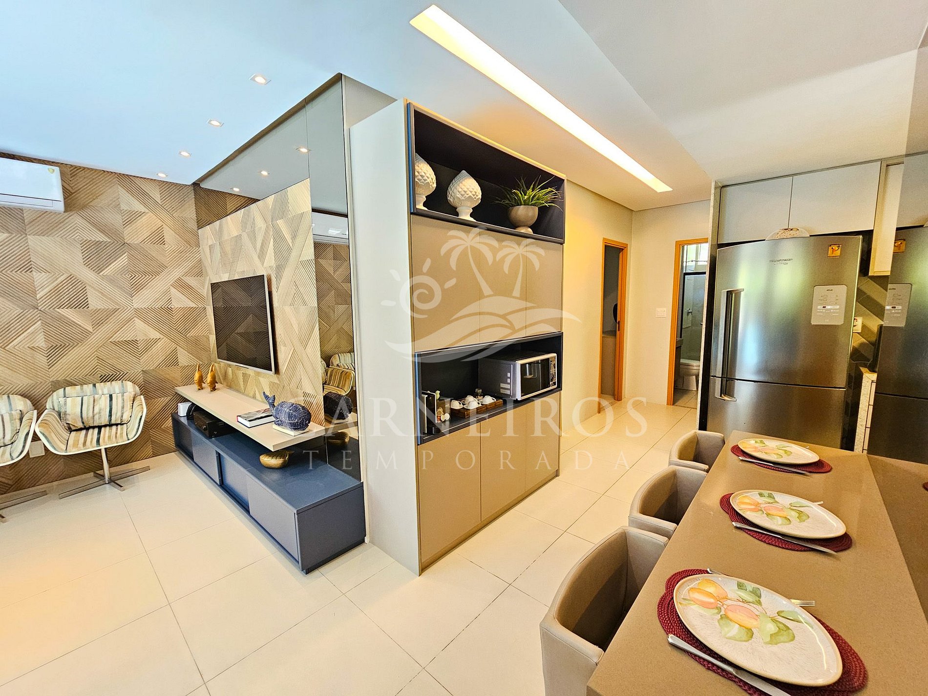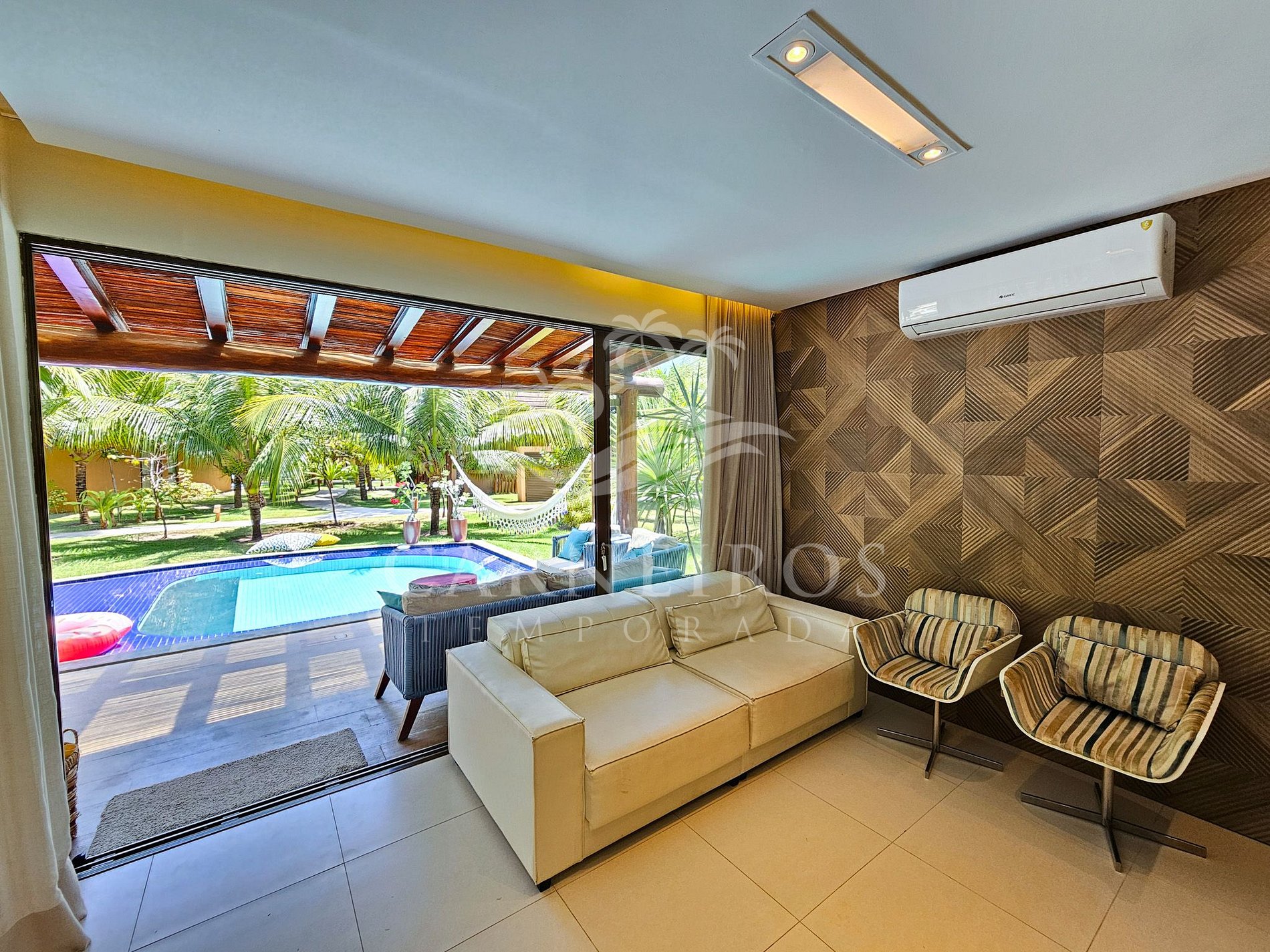 A sala de estar com decoração aconchegante possui sofá, ar-condicionado e TV com serviço de streaming. A cozinha é completa e possui diversos itens como geladeira, fogão, forno, micro-ondas, Air Fryer, liquidificador, sanduicheira, cafeteira, bebedouro, botijão de água/purificador e diversos utensílios. Há também área para refeições com mesa e seis cadeiras. O bangalô possui 4 banheiros completos.