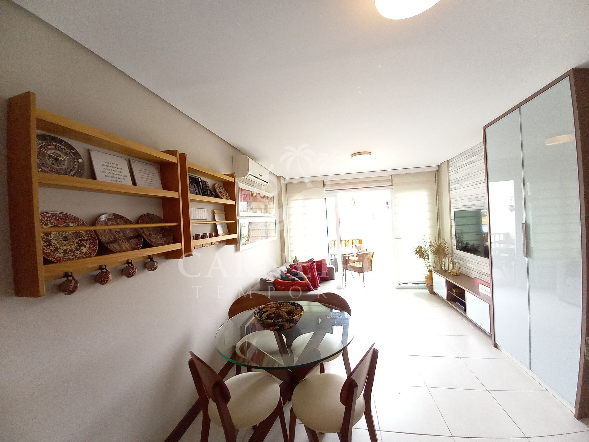 A sala de estar conta com decoração minimalista, TV, ar-condicionado e sofá-cama de casal. A cozinha é completa e equipada com os principais utensílios como louça, copos, panelas, talheres, micro-ondas, liquidificador, forno, fogão, geladeira, mesa de jantar com quatro cadeiras e diversos utensílios. Possui também banheiro completo com box, ducha quente e armário.