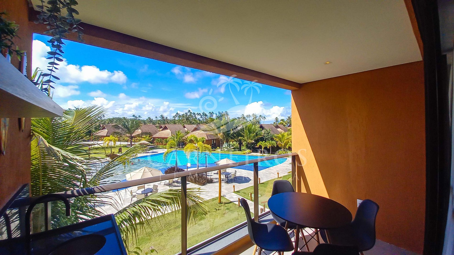✹ O flat se encontra no térreo com vista para piscina, possui também uma linda varanda com mesa, cadeiras e balcão com pia✹