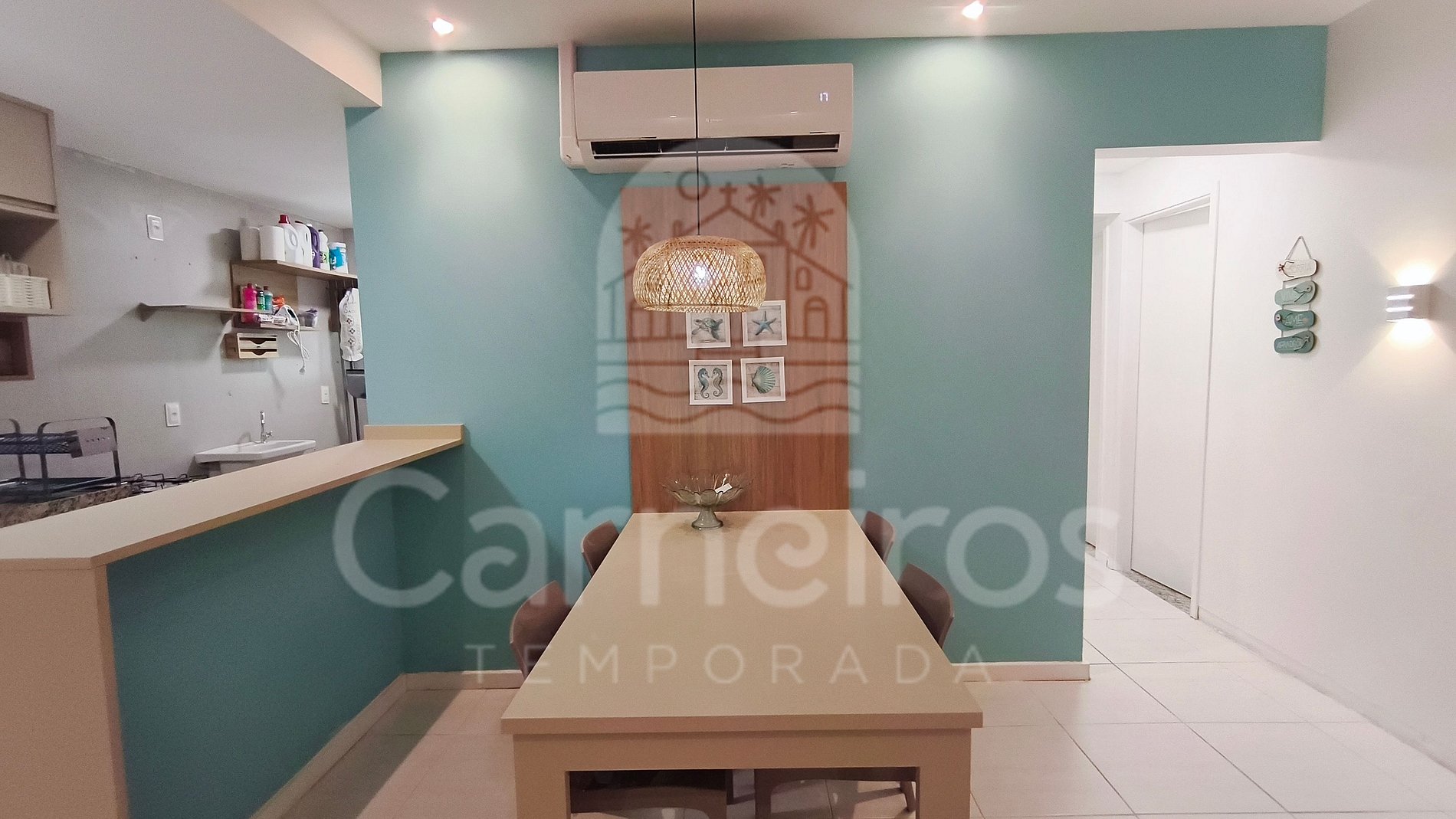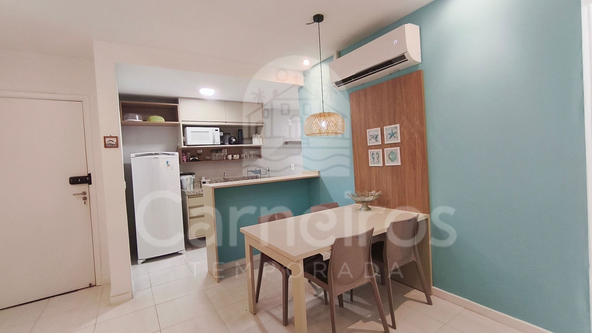 Na sala de estar conjugada a decoração minimalista traz toda calmaria que a praia passa, contendo uma TV e um sofá. A cozinha é completa e equipada com os principais itens como louça, copos, panelas, talheres, sanduicheira, liquidificador, micro-ondas, fogão cooktop 04 bocas, geladeira e diversos utensílios. Além disso, temos uma mesa na sala com quatro cadeiras e uma pequena na cozinha com dois bancos. Há também 2 banheiros completos com ducha quente.