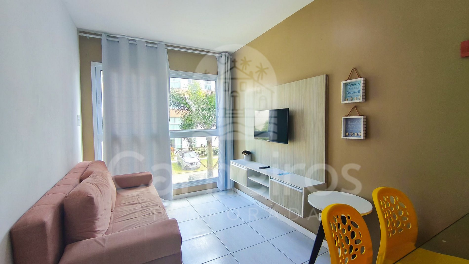 Na sala de estar a decoração minimalista traz toda calmaria que a praia passa. A cozinha é completa e equipada com os principais itens como louça, copos, panelas, talheres, sanduicheira, liquidificador, micro-ondas, fogão 04 bocas, geladeira e diversos utensílios. Além disso, temos uma mesa de vidro com quatro cadeiras. Há também 1 banheiro completo com ducha quente.