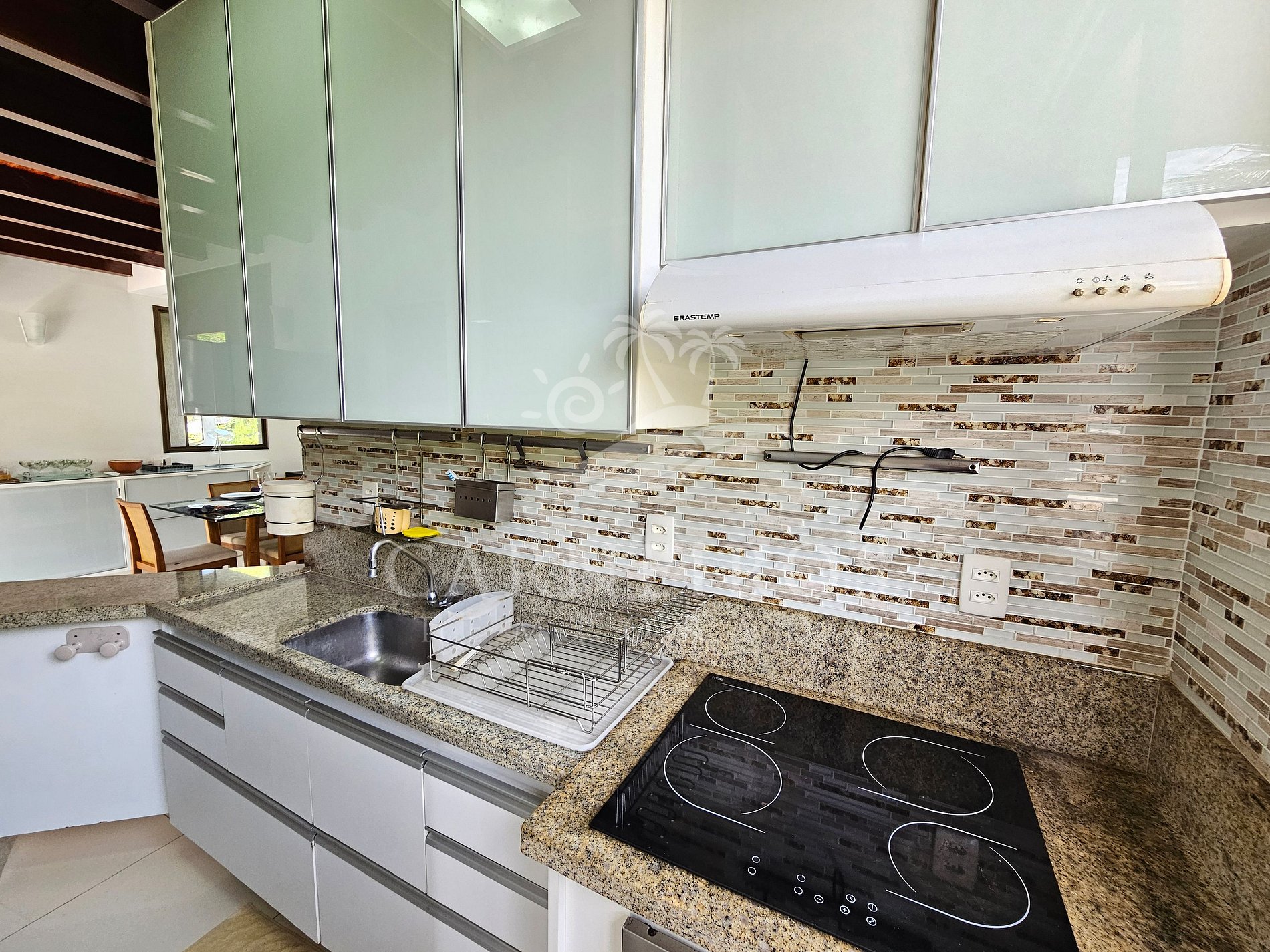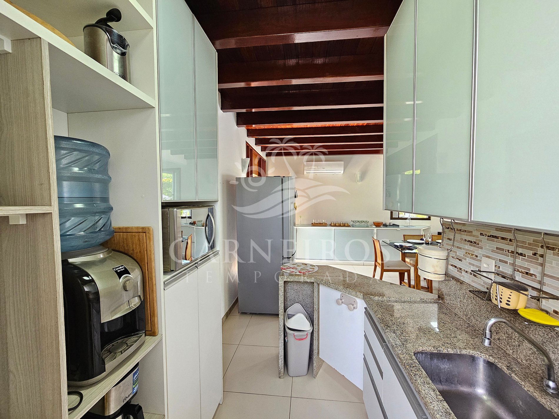 A sala de estar com agradável decoração possui sofá, ar-condicionado e TV. A cozinha é completa e possui diversos itens como geladeira, fogão, forno, micro-ondas, liquidificador, sanduicheira, cafeteira, bebedouro, airfryer e outros utensílios. Há também uma sala de jantar com mesa para 08 pessoas. O bangalô possui 3 banheiros completos e 1 lavabo.