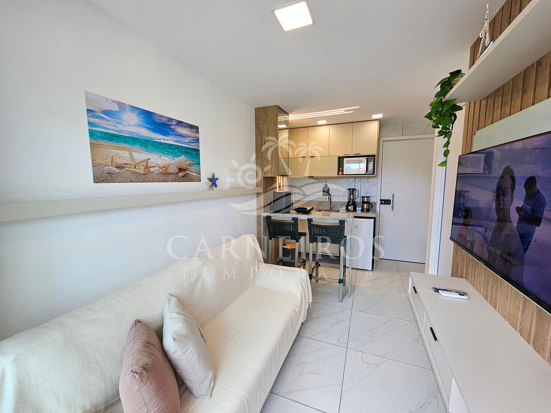 A sala tem uma agradável decoração moderna com TV e sofá-cama de casal. A cozinha é completa e equipada com os principais utensílios como, micro-ondas, frigobar, fogão, sanduicheira e outros, contando também com uma bancada e 02 cadeiras. Possui 1 banheiro completo.