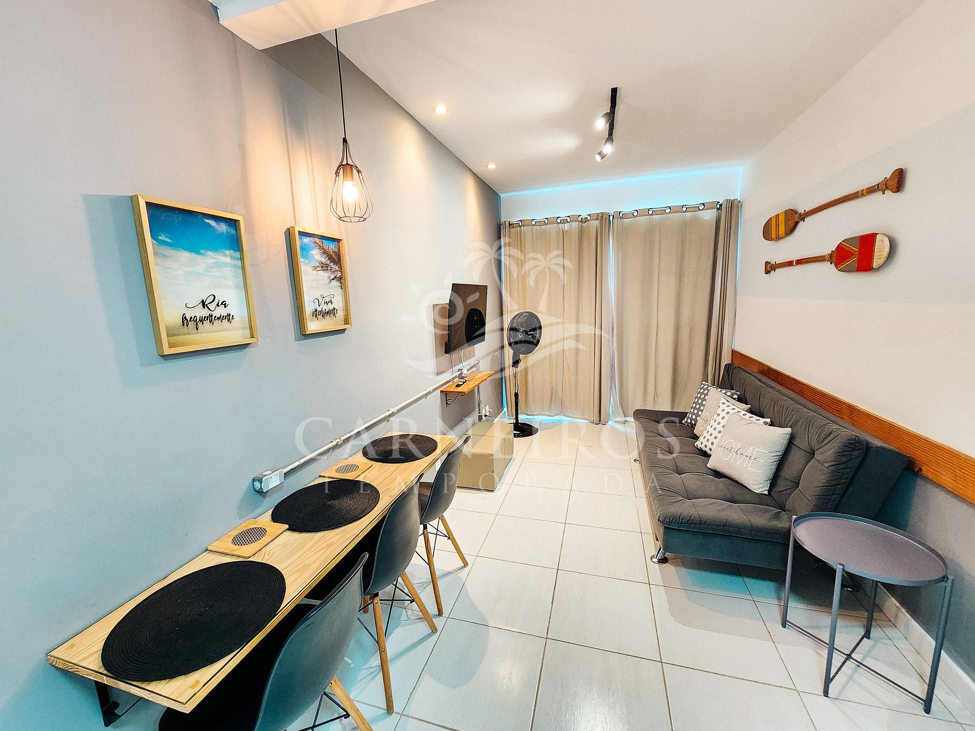 Na sala de estar a decoração minimalista e com tom rústico traz toda calmaria que a praia passa, tendo uma TV e sofá-cama de casal. A cozinha é completa e equipada com os principais itens como louça, copos, panelas, talheres, sanduicheira, liquidificador, micro-ondas, cafeteira, fogão cooktop 02 bocas, geladeira e diversos utensílios. Além disso, temos uma mesa de madeira com três cadeiras. Há também 1 banheiro com ducha quente que atende às necessidades diárias.