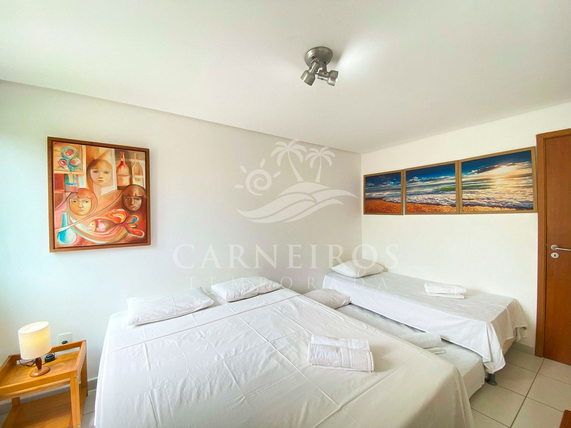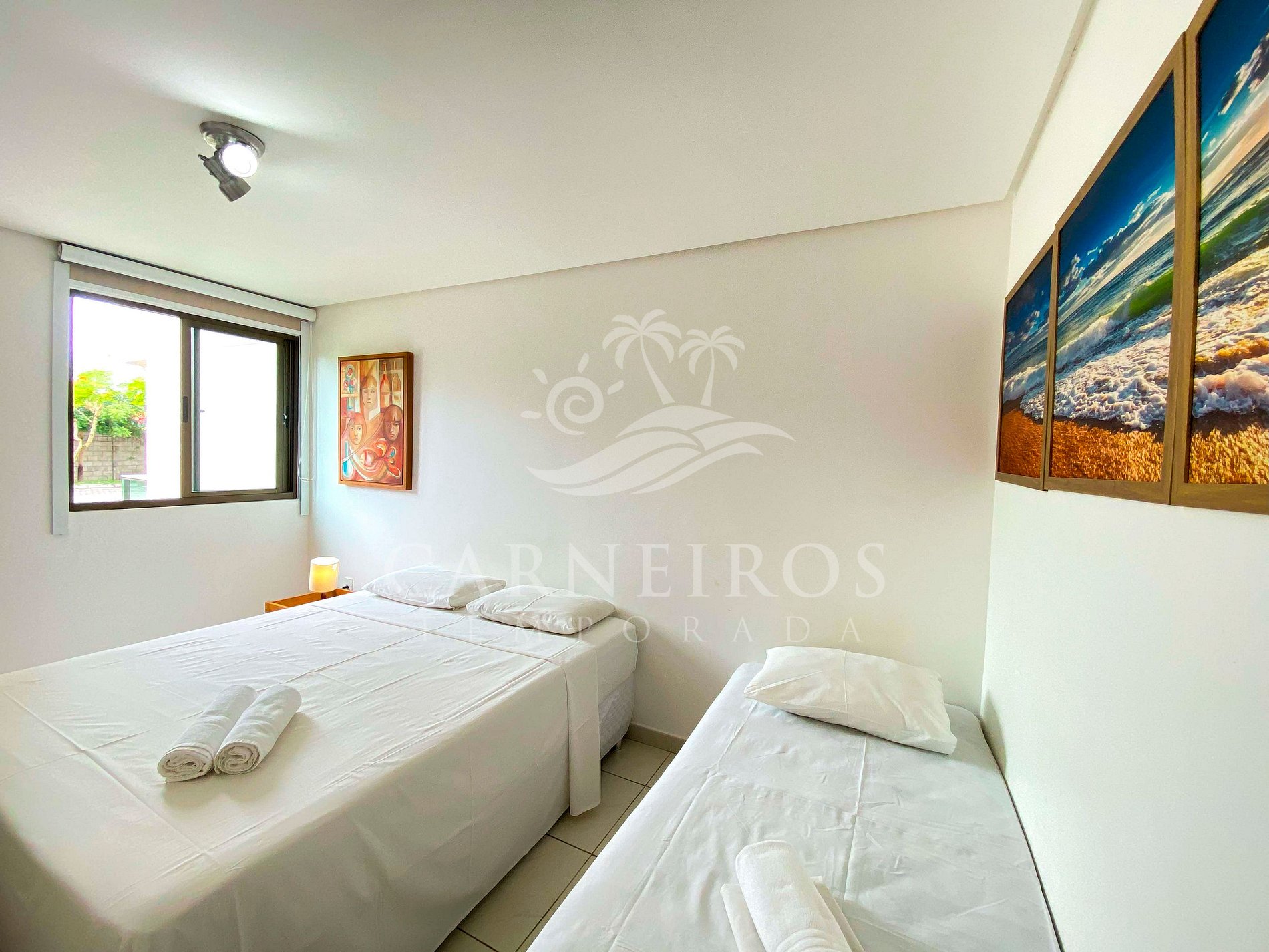 - Quarto 01: 1 cama queen + 1 cama de solteiro com bicama (acomoda até 04 pessoas), ar-condicionado e armário.