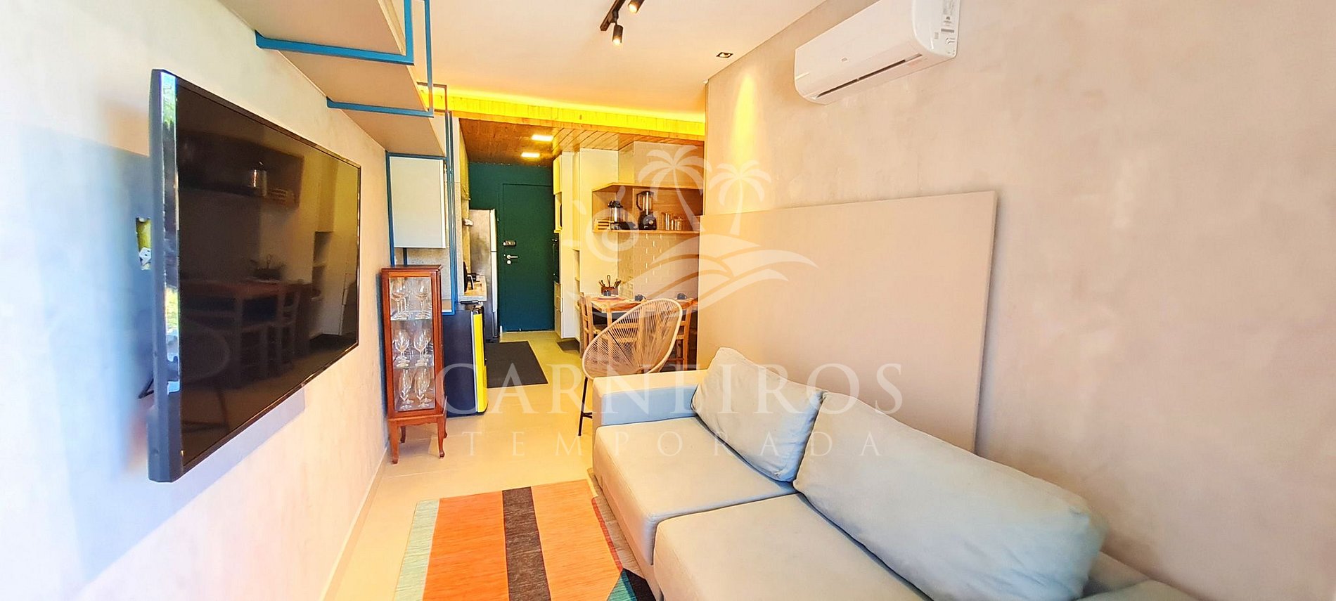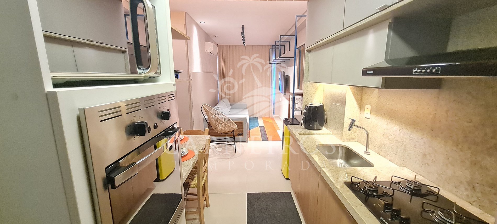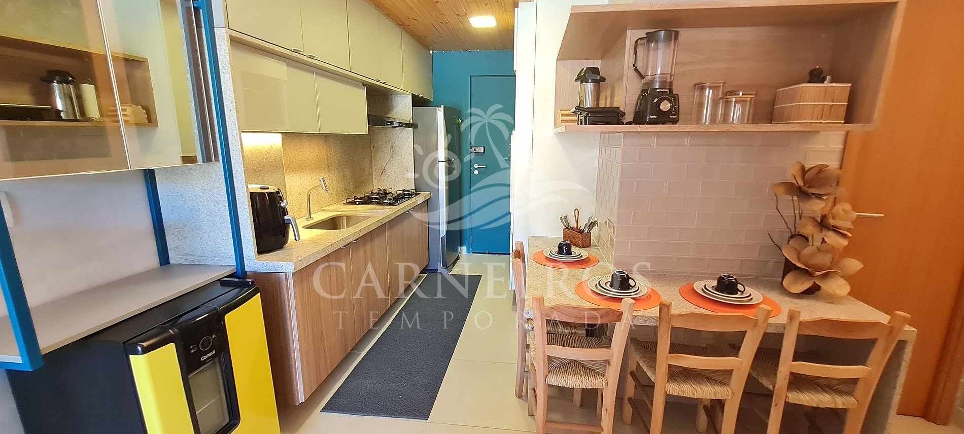 Ambiente integrado que conta com decoração minimalista, TV com serviço de streaming, sofá e ar-condicionado. A cozinha é completa e equipada com os principais utensílios como louça, copos, panelas, talheres, micro-ondas, forno, fogão, geladeira, liquidificador, sanduicheira, torradeira, cafeteira, bebedouro, airfryer, cervejeira e diversos utensílios. Conta também com uma mesa com quatro cadeiras. Possui também 2 banheiros completos com box, ducha quente e armário.