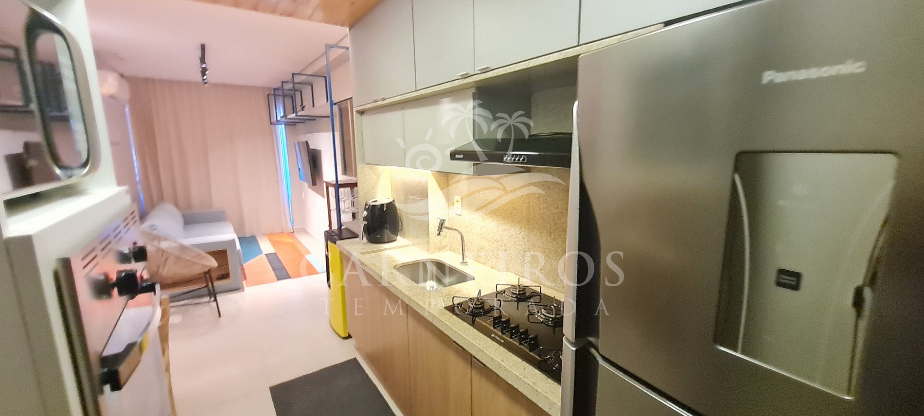Ambiente integrado que conta com decoração minimalista, TV com serviço de streaming, sofá e ar-condicionado. A cozinha é completa e equipada com os principais utensílios como louça, copos, panelas, talheres, micro-ondas, forno, fogão, geladeira, liquidificador, sanduicheira, torradeira, cafeteira, bebedouro, airfryer, cervejeira e diversos utensílios. Conta também com uma mesa com quatro cadeiras. Possui também 2 banheiros completos com box, ducha quente e armário.