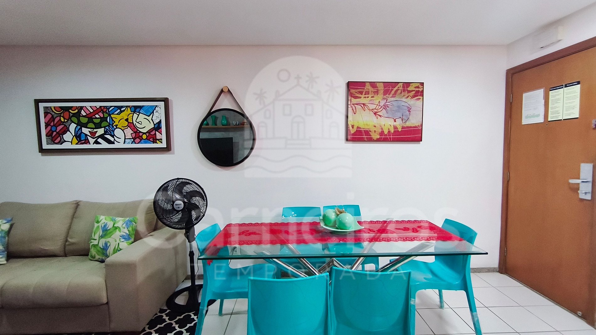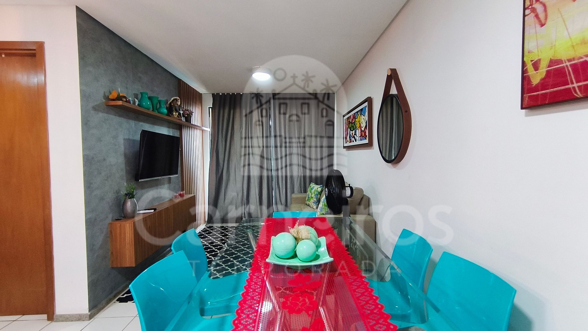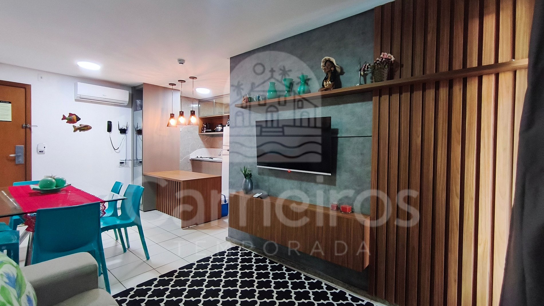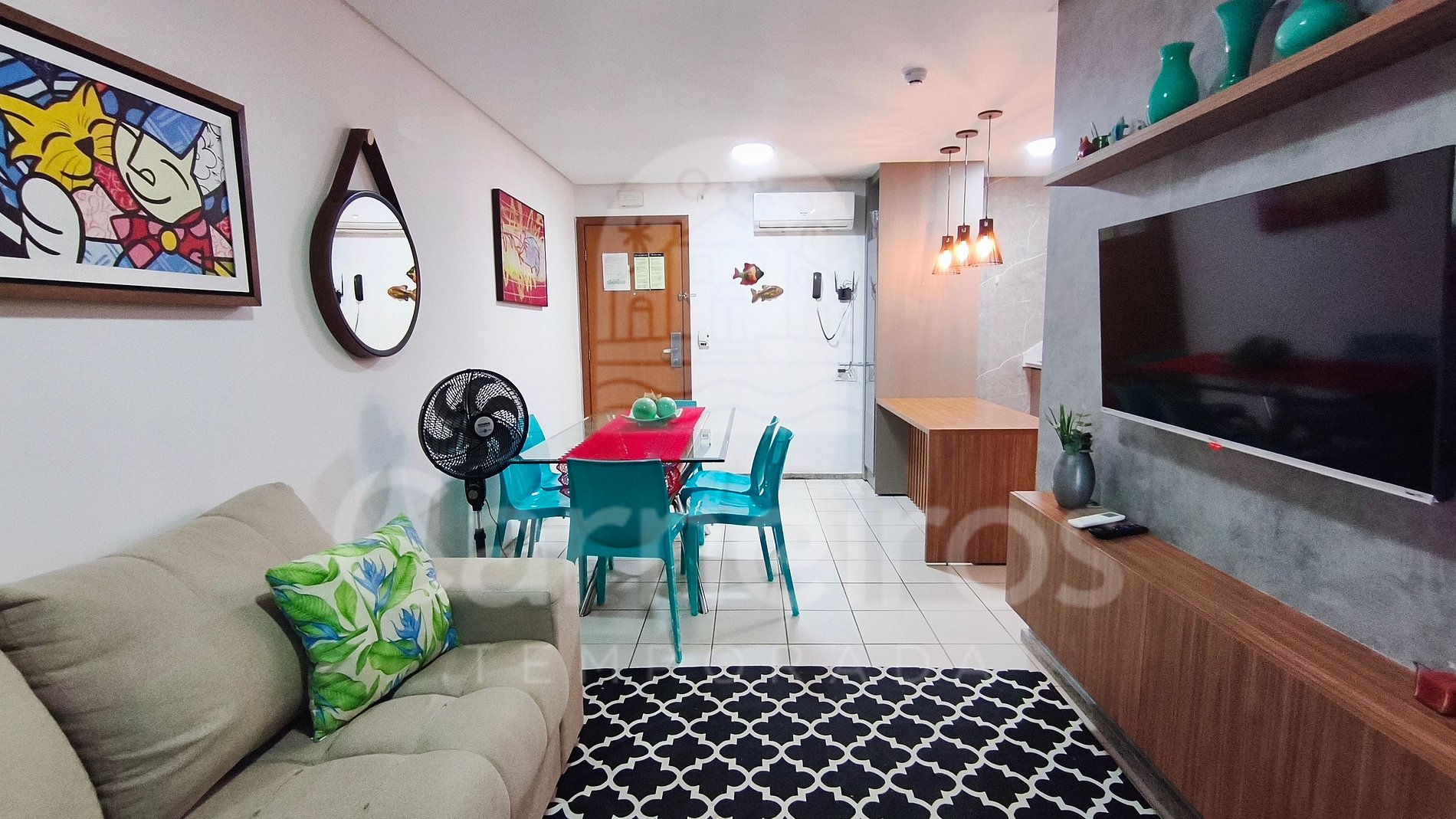 - Sala de estar: sofá-cama de casal (acomoda até 02 pessoas), ar condicionado, mesa com 8 cadeiras e TV;