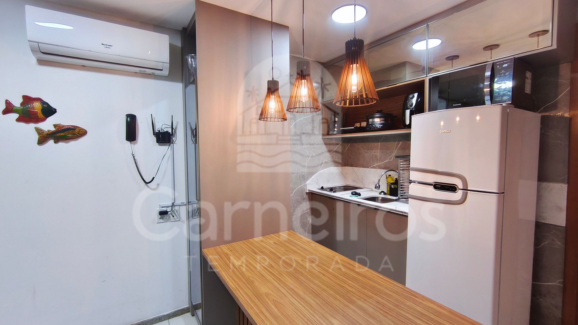 - Cozinha: completa e equipada com os principais utensílios como louça, copos, panelas, talheres, sanduicheira, liquidificador, micro-ondas, fogão, forno elétrico, cafeteira, Air Fryer, geladeira e outros.